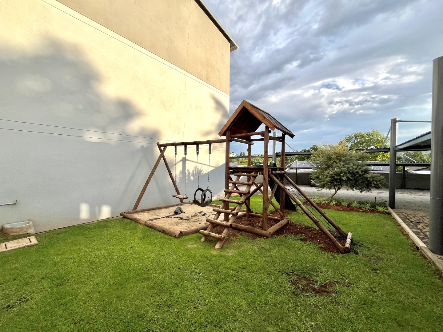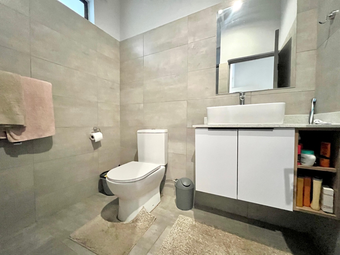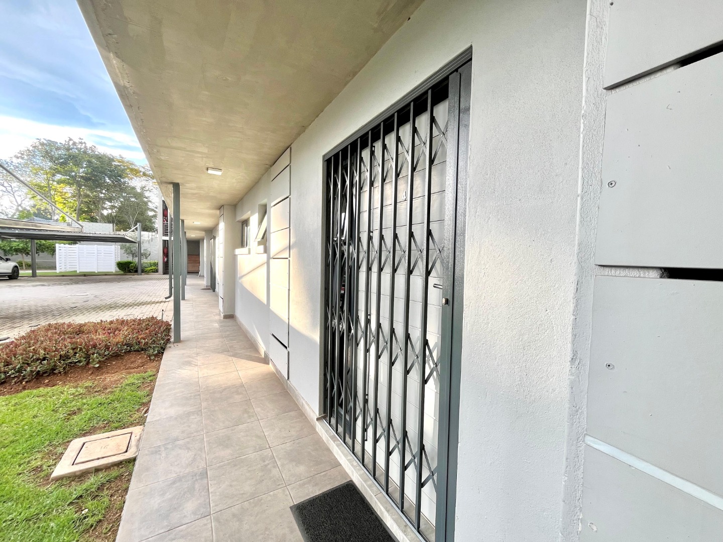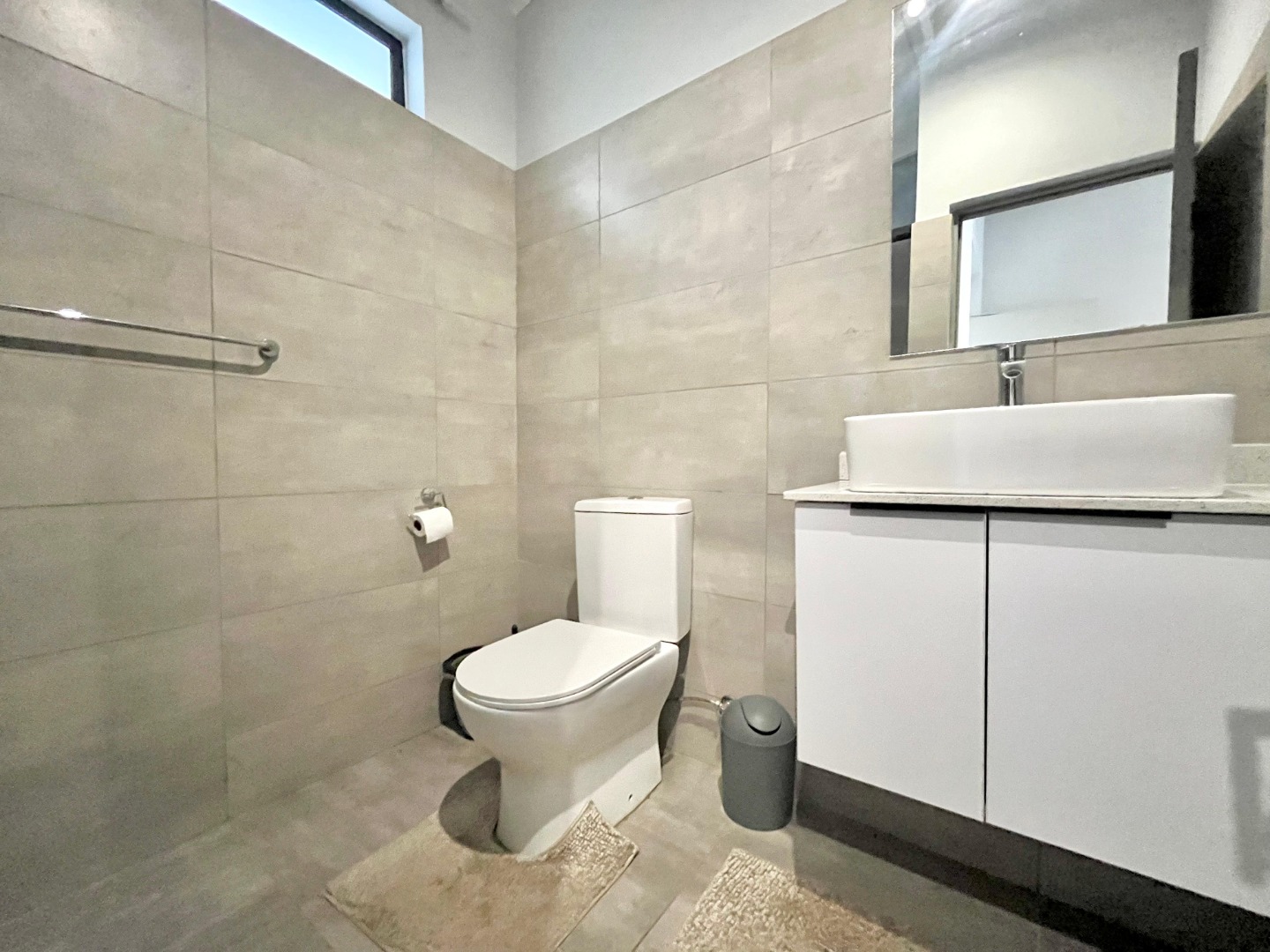 Discover modern living in this stylish studio apartment located in the sought-after Menlo Park, Pretoria. This open-plan unit boasts high vaulted ceilings and large sliding doors that invite abundant natural light, creating an airy and spacious ambiance. Contemporary finishes, including an exposed brick accent wall and sleek tiled flooring, define the interior's aesthetic.
