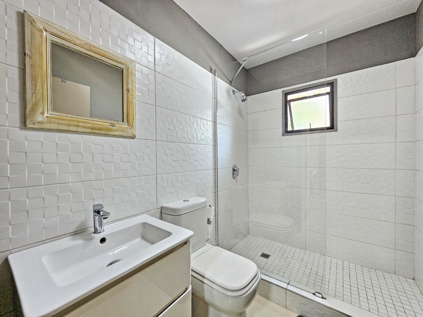 On the upper level, you’ll find two spacious bedrooms, both with ample built-in cupboards. The main bedroom is complete with a stylish en-suite bathroom, while the second bedroom is serviced by a separate bathroom. The upstairs area also features convenient linen cupboards and a study nook, providing additional functionality and space.