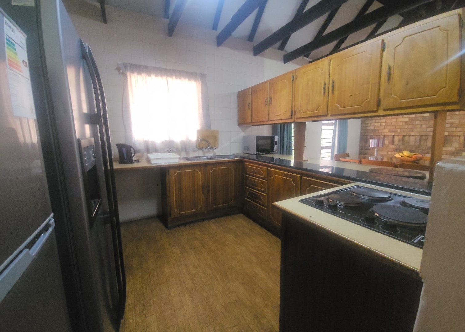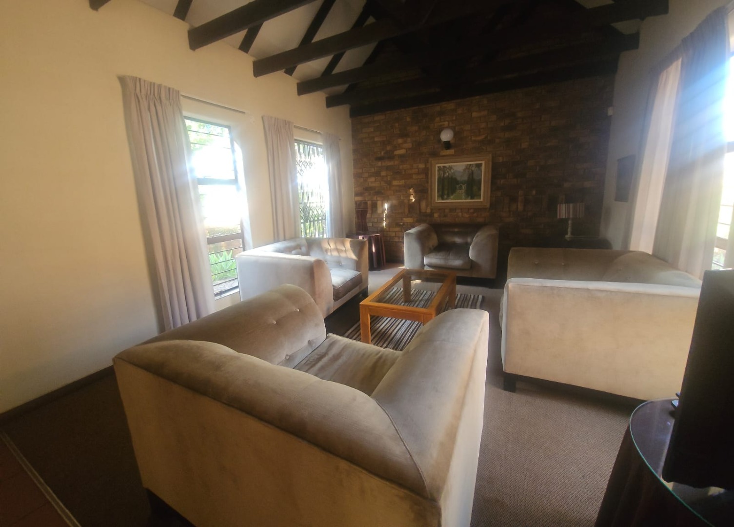 Designed in a contemporary Cape-Dutch style, the property boasts exposed wooden trusses and ceilings that follow the roofline, adding character and a sense of spaciousness.