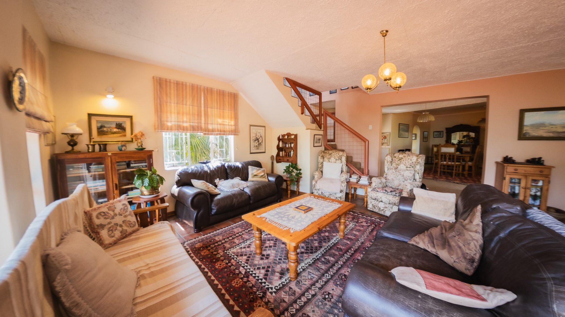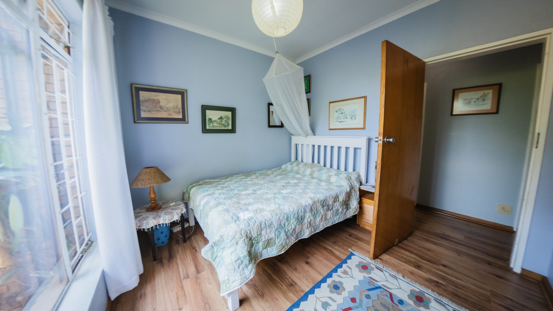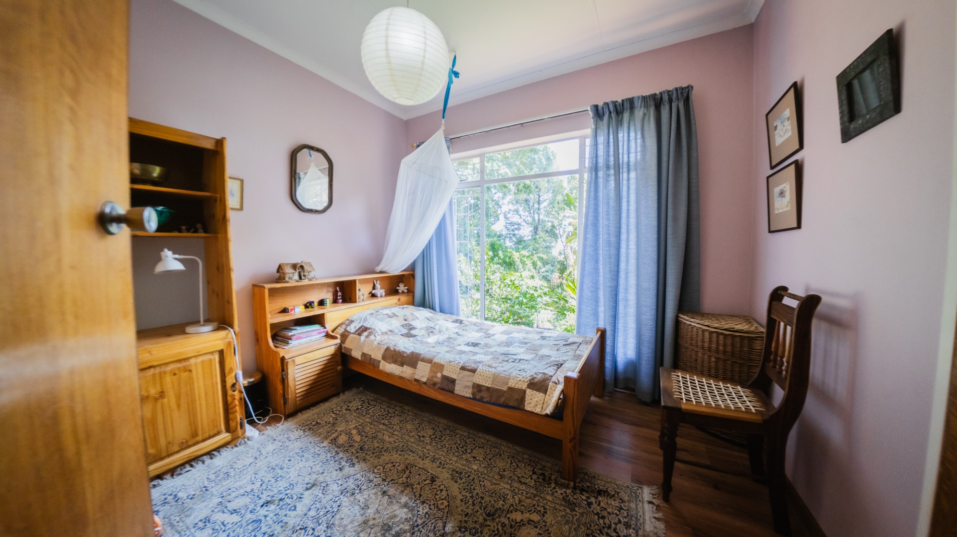 As I step inside, I find three well-appointed bedrooms and two bathrooms. The main bedroom is on suite and truly special, featuring large windows that frame the scenic outlook, walk-in cupboards, and a separate toilet for added convenience. The main bathroom is fitted with both a bath and a shower. The remaining bedrooms offer warm wooden floors and share a bathroom, making them comfortable and practical spaces.