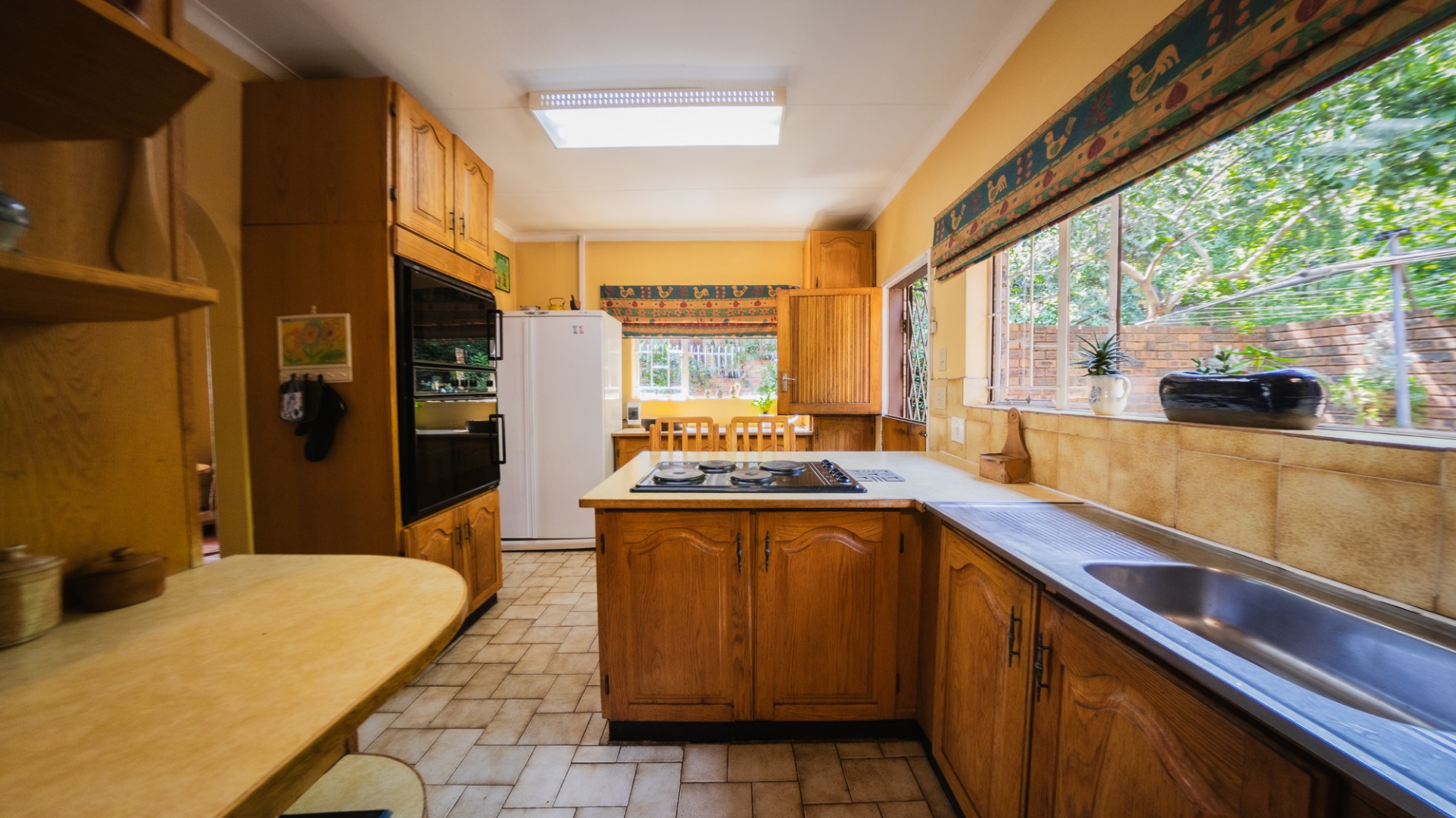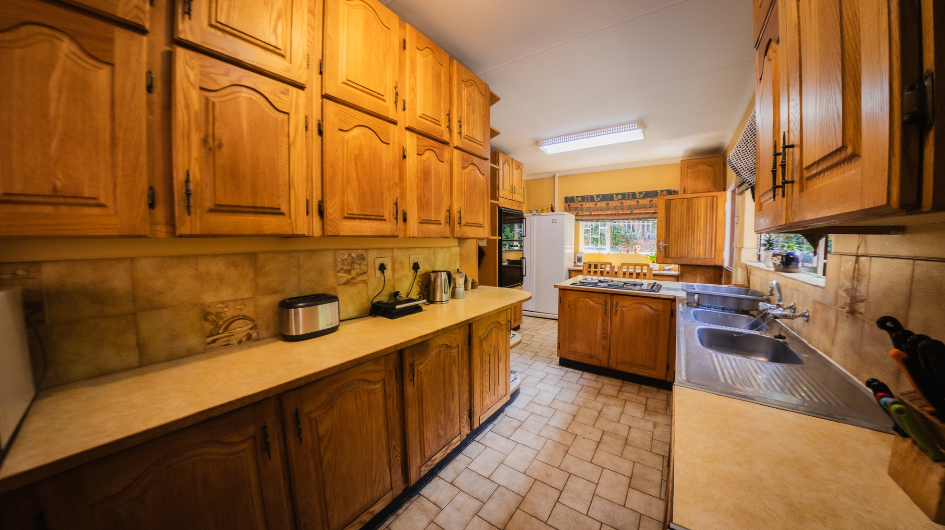 The kitchen is spacious and well equipped, offering ample cupboard space, an eye-level oven, and an extractor fan.