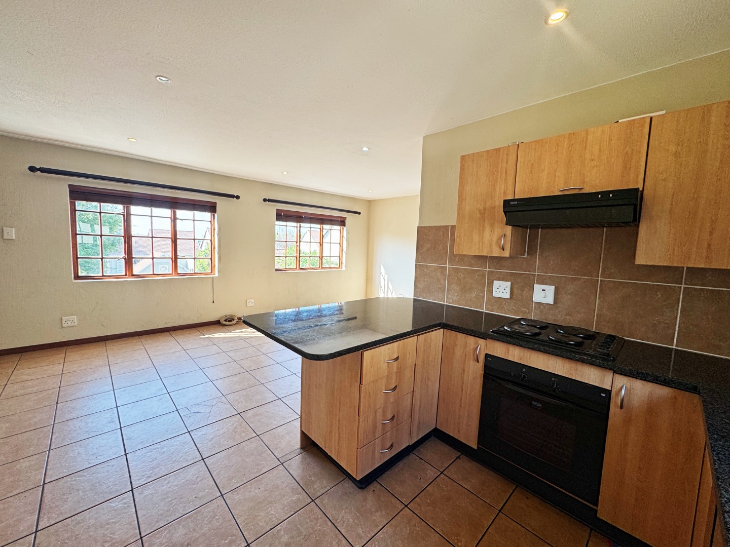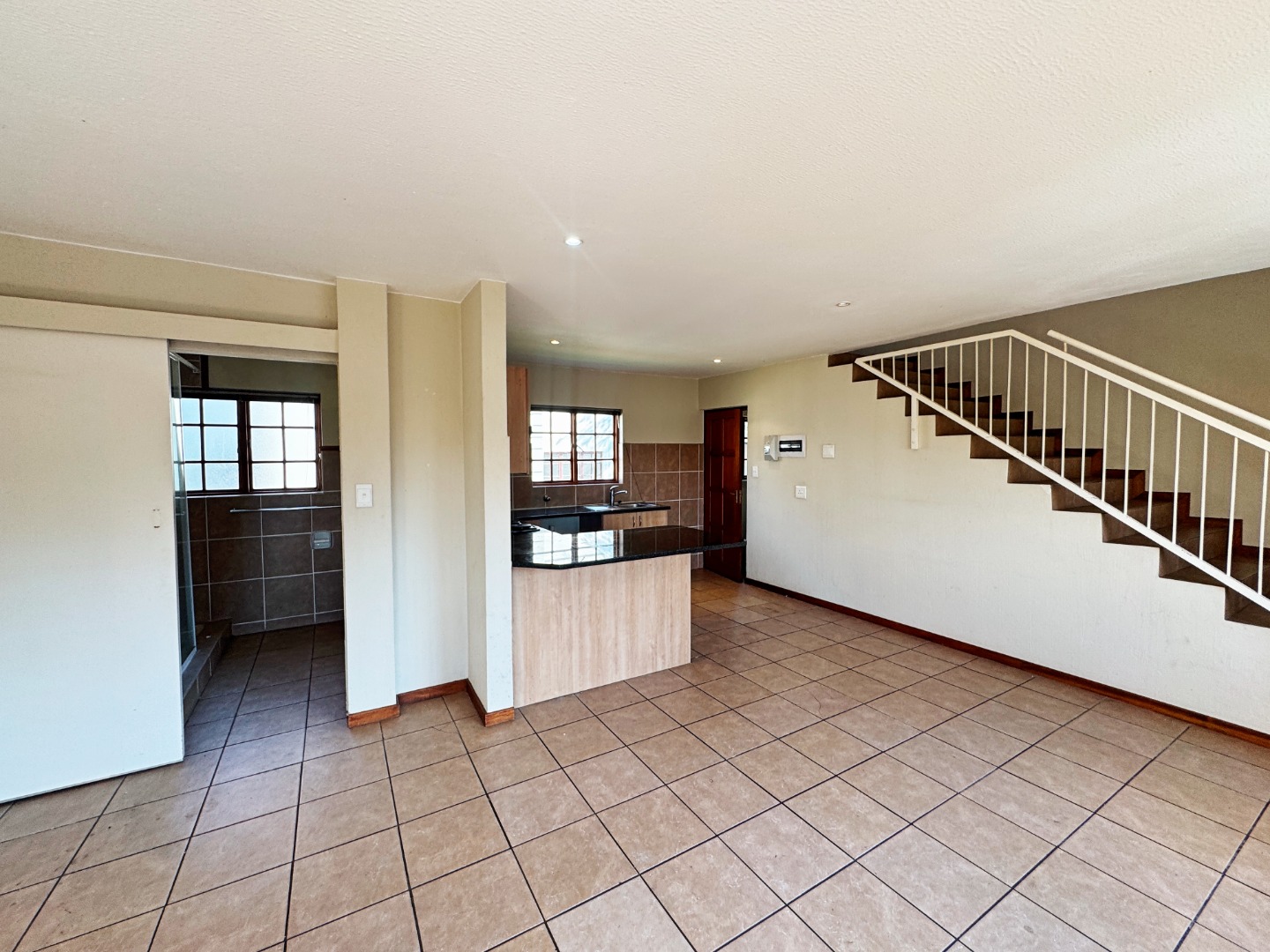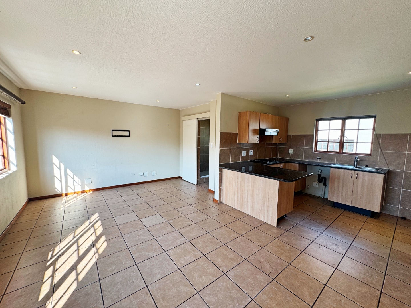 The home offers a spacious open-plan lounge that flows seamlessly into a modern kitchen, complete with built-in cupboards.