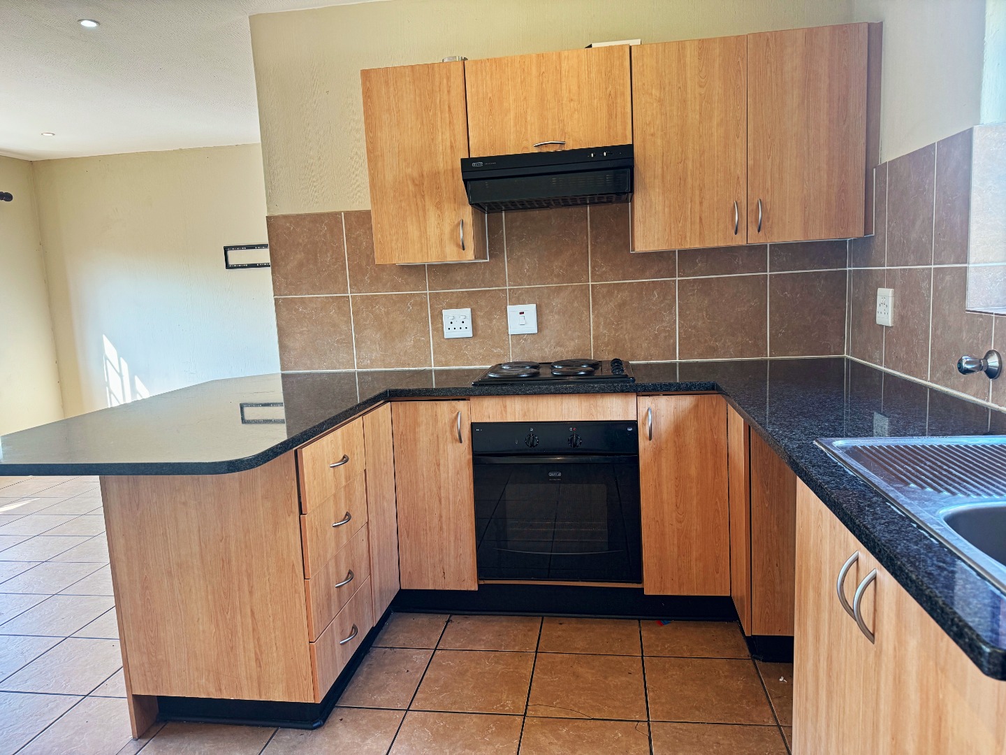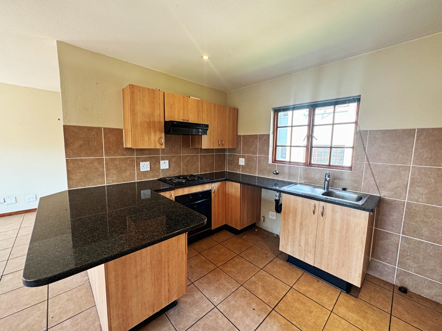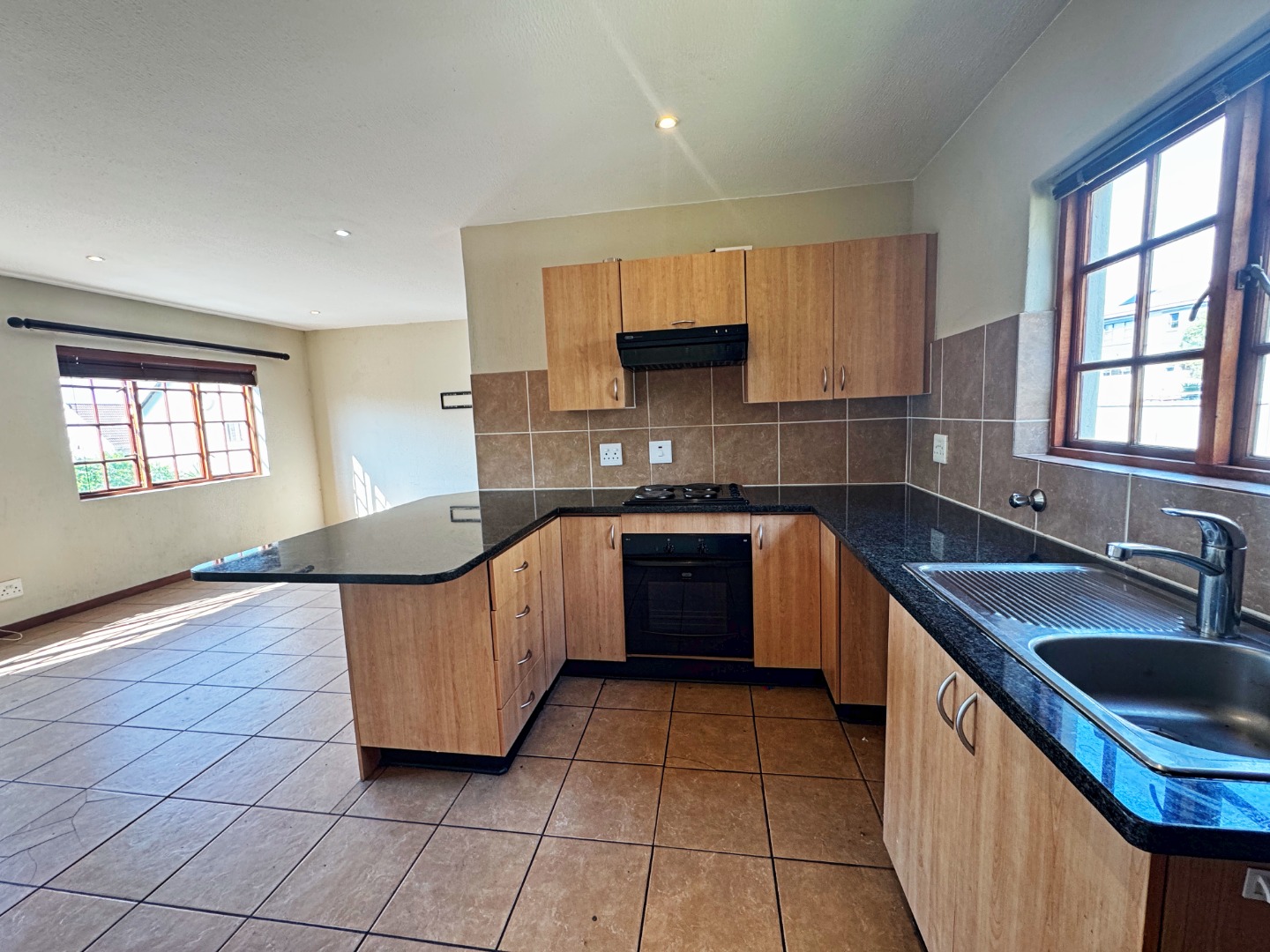 The home offers a spacious open-plan lounge that flows seamlessly into a modern kitchen, complete with built-in cupboards.