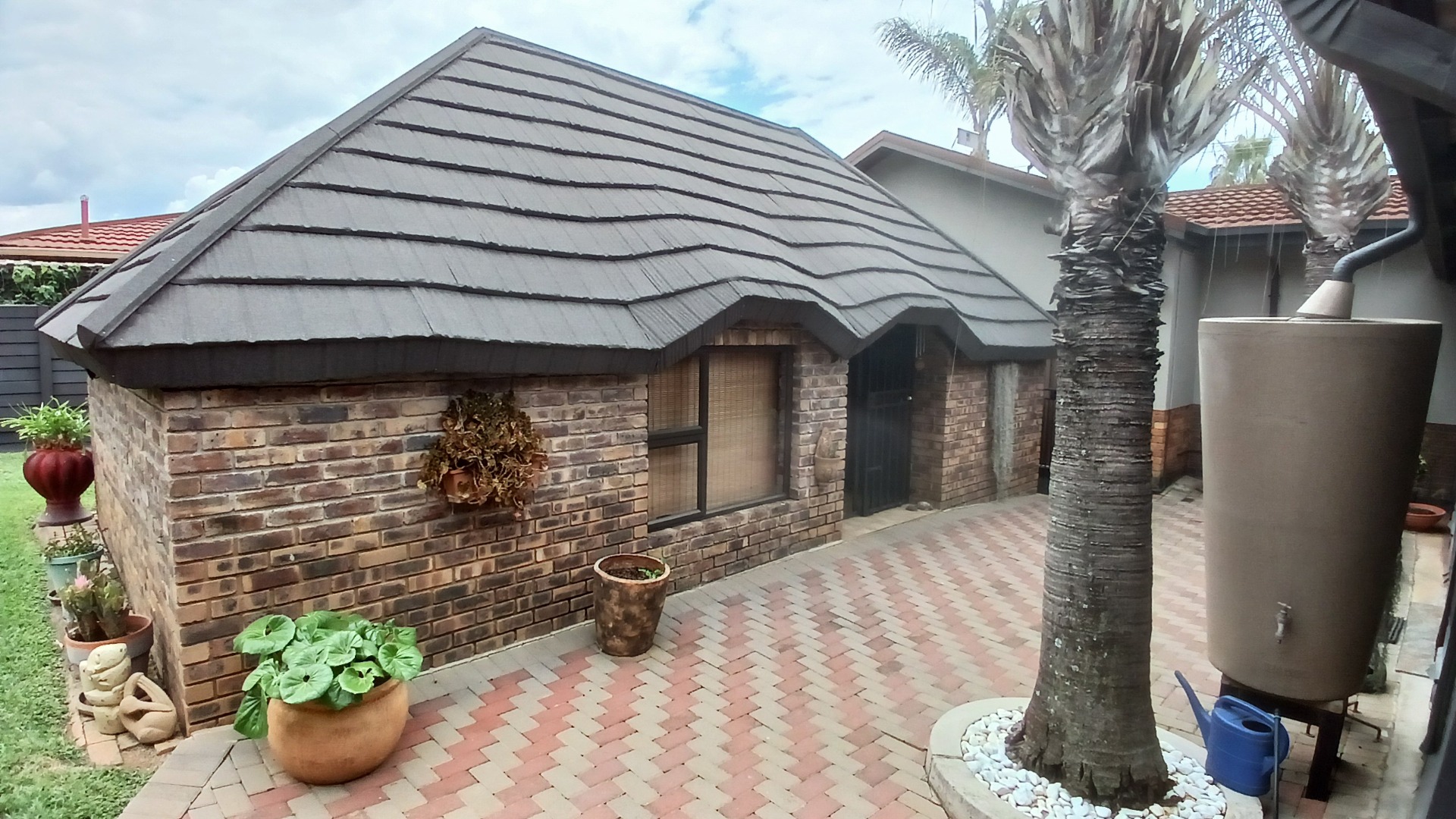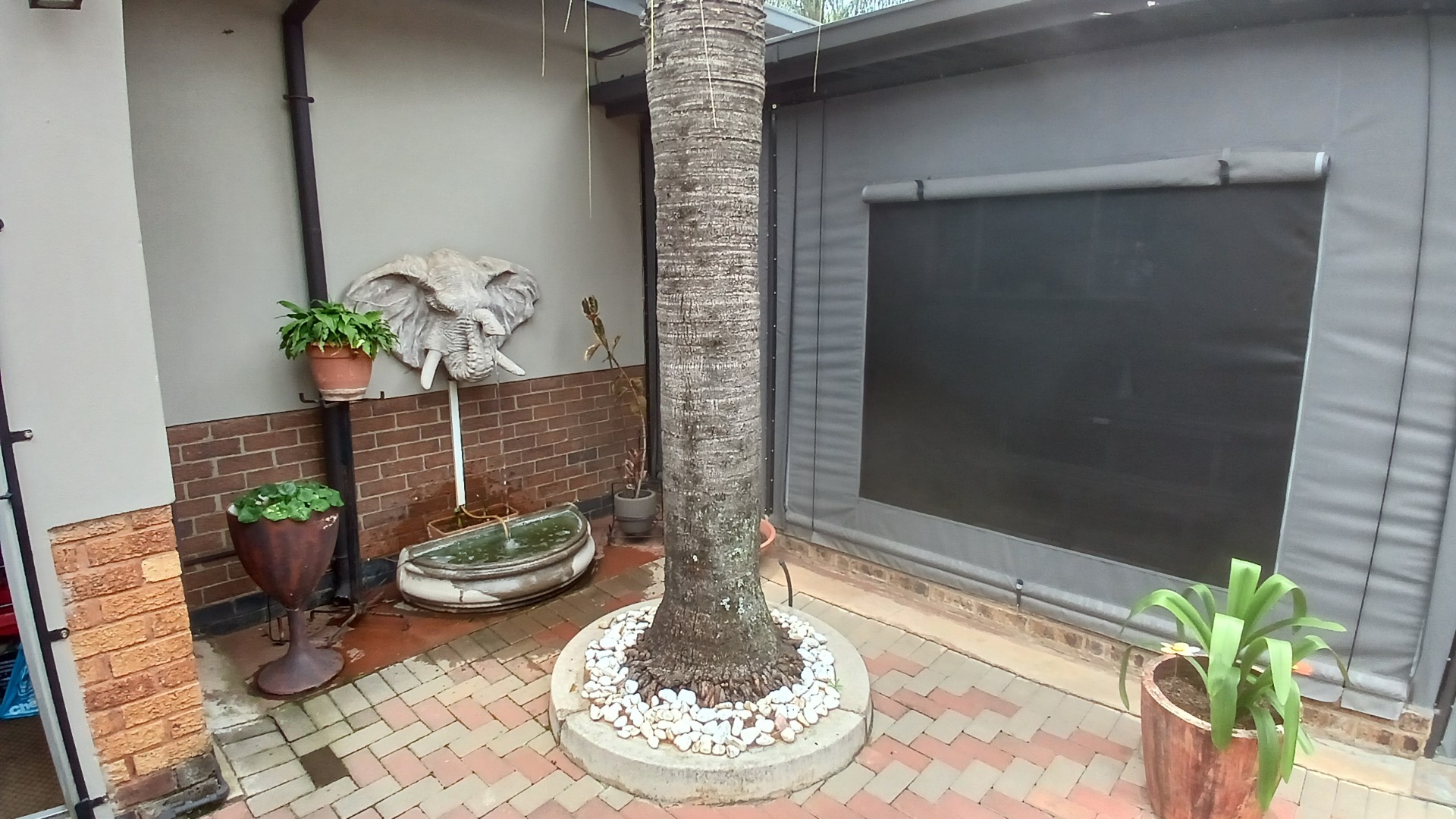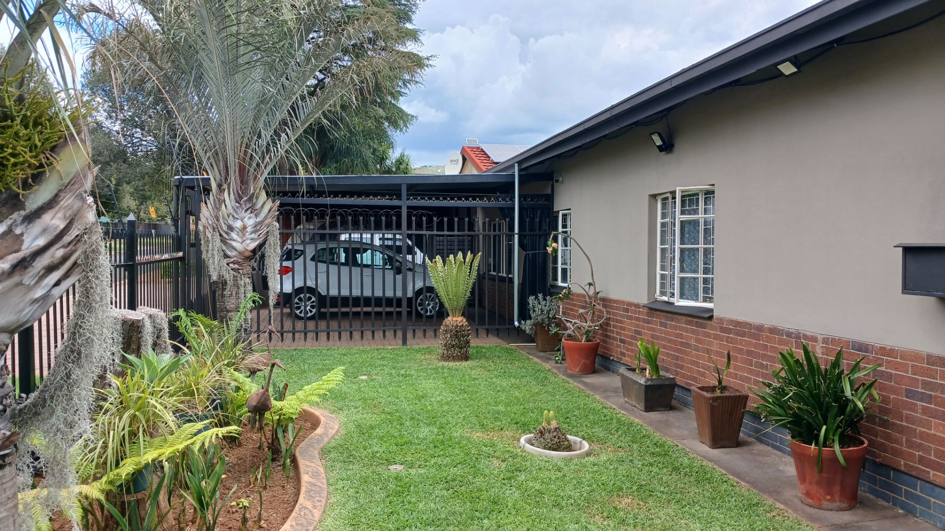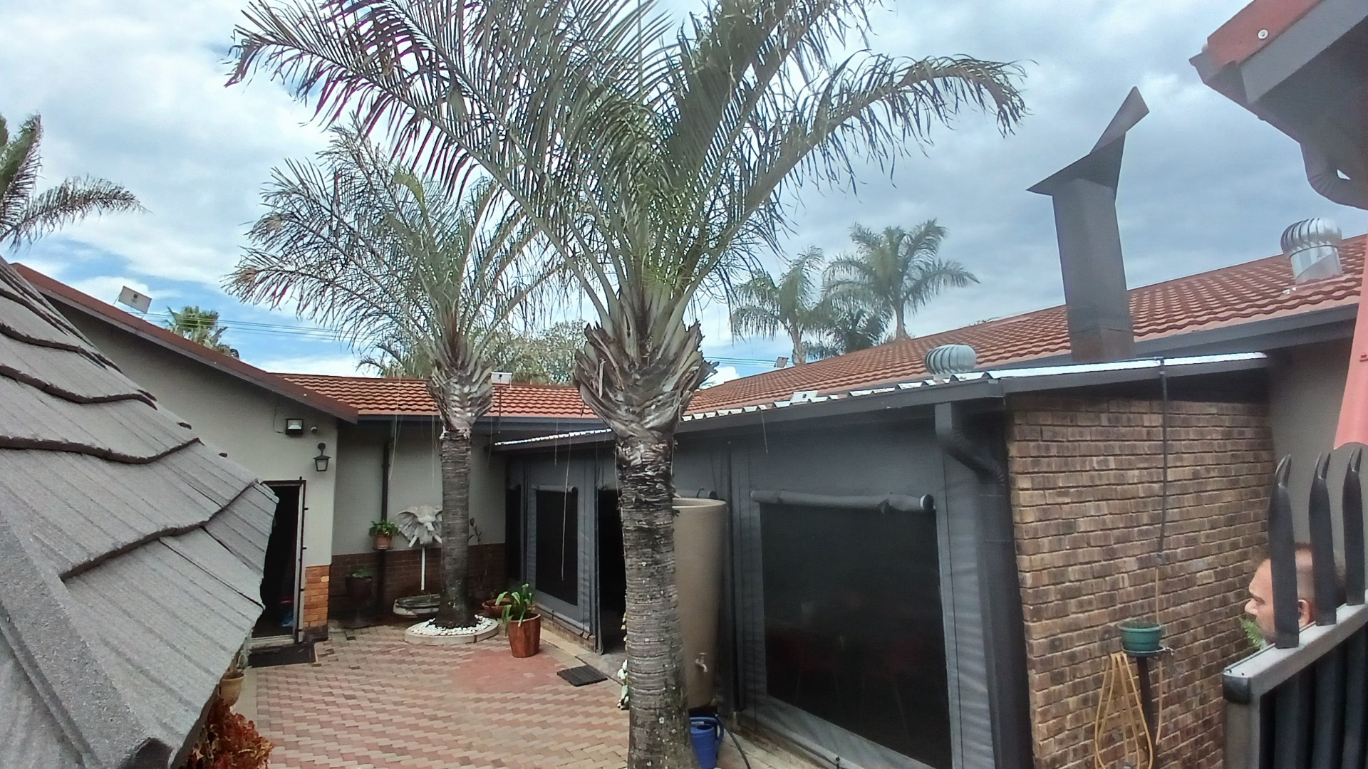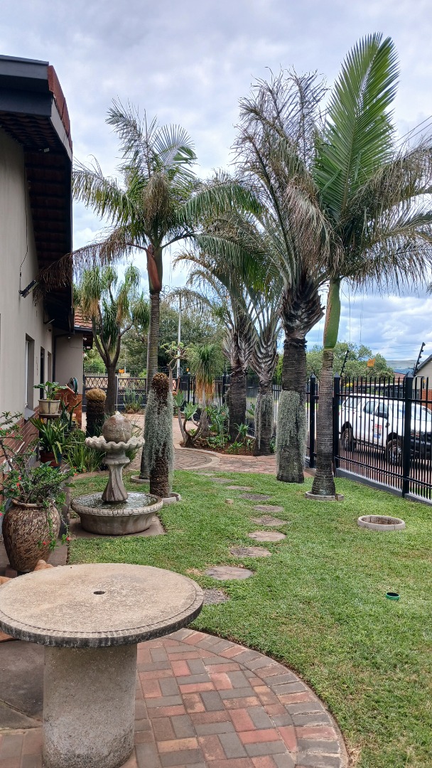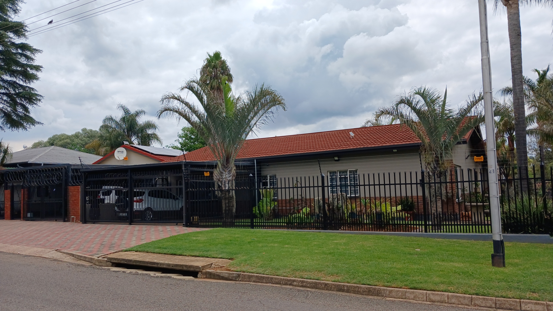 Nestled on a prominent corner lot in Pretoria Gardens, this single-story residence immediately impresses with its well-maintained landscaping, mature palm trees, and attractive tiled roof. The secure black perimeter fencing and access gate provide a welcoming yet protected entrance, setting the stage for a comfortable family lifestyle. Step inside to discover a thoughtfully designed interior spanning 436 sqm, featuring a warm and inviting ambiance. The home boasts a spacious lounge, a dedicated dining room, and an additional family TV room, offering versatile living spaces for relaxation and entertainment. Distinctive wooden panel ceilings add character throughout, complemented by ample natural light from large windows. A functional home office or study provides a quiet space for productivity, complete with built-in wooden cabinetry. The heart of the home, the kitchen, is equipped with extensive dark wooden cabinetry, generous L-shaped counter space, an integrated double oven, and a gas hob on a peninsula, perfect for culinary enthusiasts. A double stainless steel sink and ample storage ensure practicality. Accommodation comprises three comfortable bedrooms, including one with an en-suite bathroom, ensuring privacy and convenience. A total of two well-appointed bathrooms serve the household. The property sits on a generous 991 sqm erf, offering ample outdoor space. Enjoy outdoor living with a charming lapa and a built-in braai, ideal for entertaining. The well-maintained garden, complete with an irrigation system and borehole, ensures lush greenery year-round. Parking is abundant with two garages and additional space for five vehicles, all accessible via a paved driveway. For leisure, a jacuzzi provides a perfect spot for relaxation. Security is paramount, featuring electric fencing, an alarm system, CCTV, burglar bars, and a security gate, providing peace of mind. This home is also equipped for sustainable living with a solar geyser, water tanks, a battery inverter, and solar panels, significantly reducing utility costs. Fibre connectivity is available, catering to modern communication needs. Located in the metropolitan area of Pretoria, Pretoria Gardens offers a convenient and established residential setting, providing easy access to local amenities and transport routes. Key Features: * 3 Bedrooms, 2 Bathrooms (1 En-suite) * Spacious Lounge, Dining Room & Family TV Room * Dedicated Home Study * Well-equipped Kitchen with Integrated Double Oven & Gas Hob * Lapa with Built-in Braai & Jacuzzi * 2 Garages & 5 Additional Parking Spaces * Advanced Security: Electric Fencing, Alarm, CCTV, Burglar Bars * Sustainable Living: Solar Geyser, Solar Panels, Battery Inverter, Borehole, Water Tanks * Fibre Ready * Pets Allowed