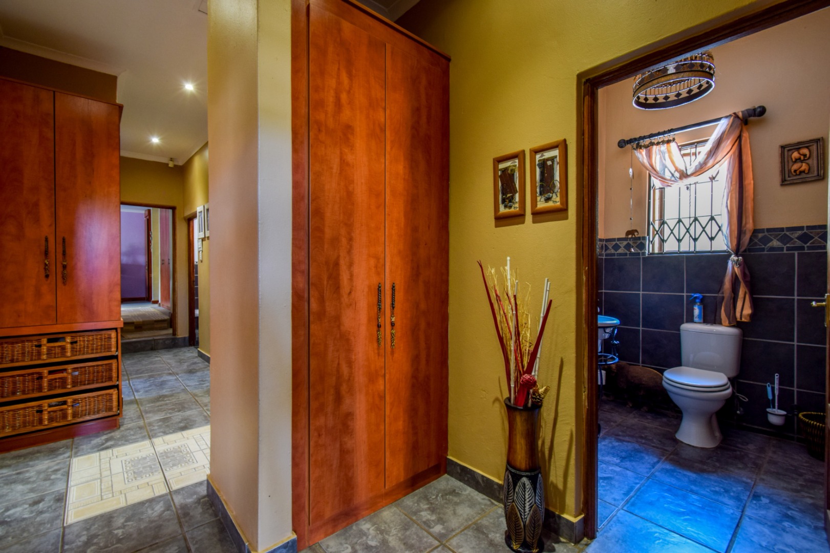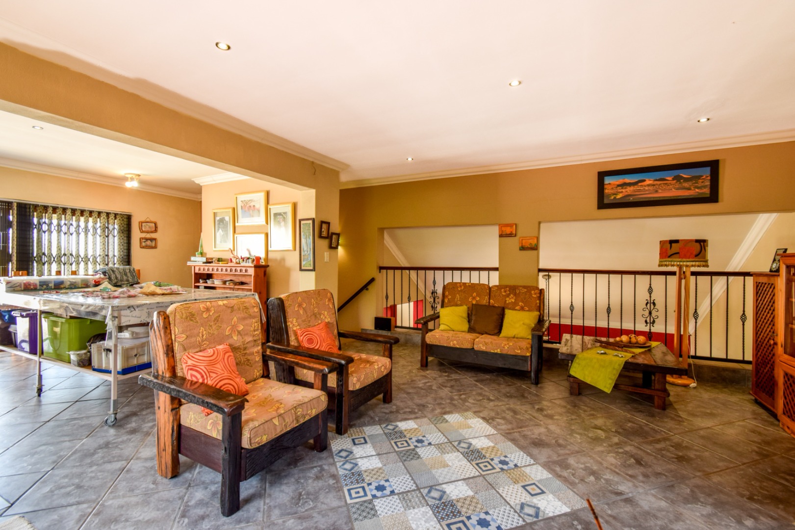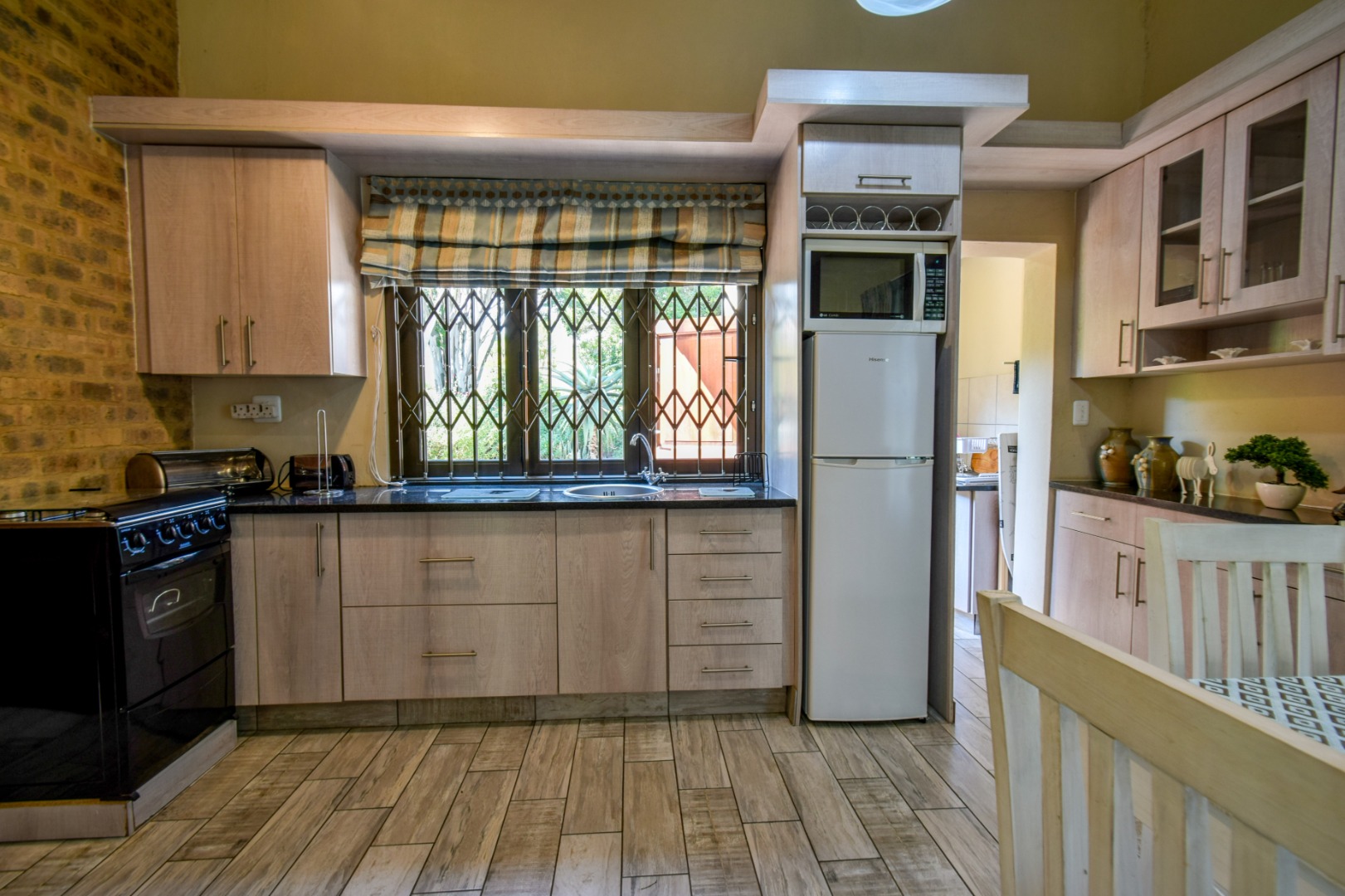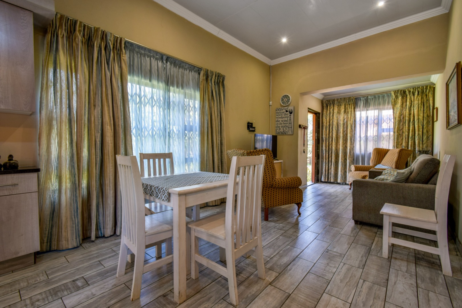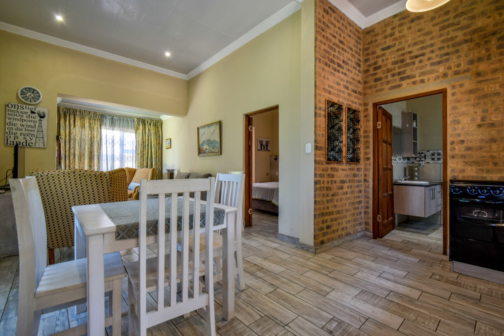 Upstairs, an impressive entertainment area awaits, boasting a lounge, built-in braai, kitchenette, and bathroom. Sliding doors open onto a balcony overlooking the property and the scenic Rietvlei Dam — the perfect setting for relaxed gatherings with family and friends.