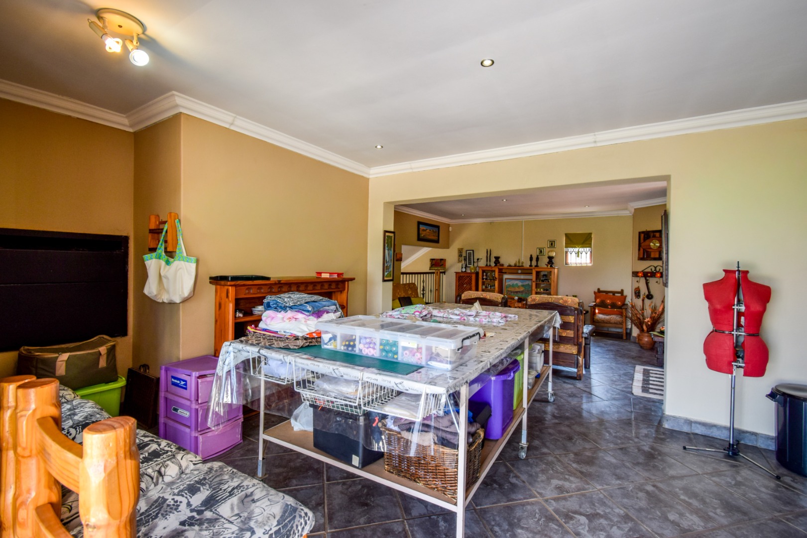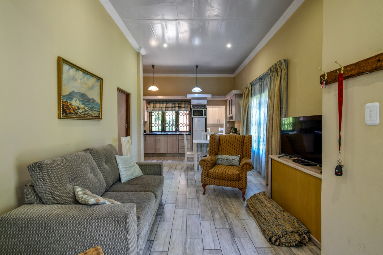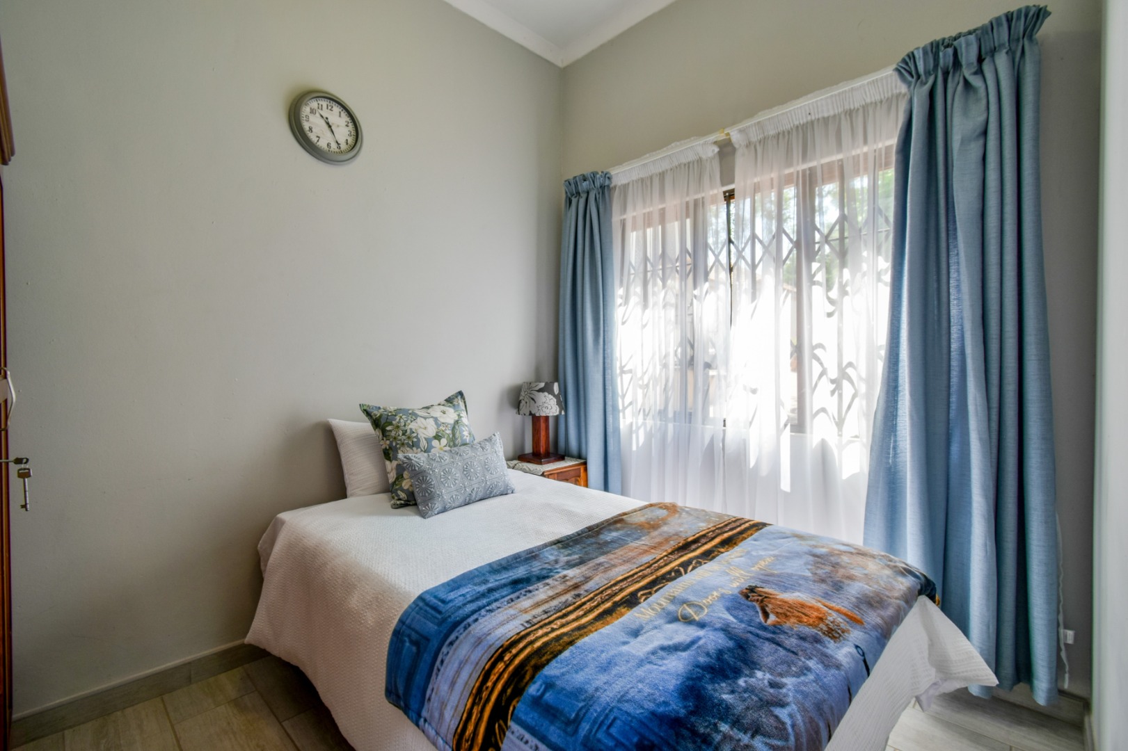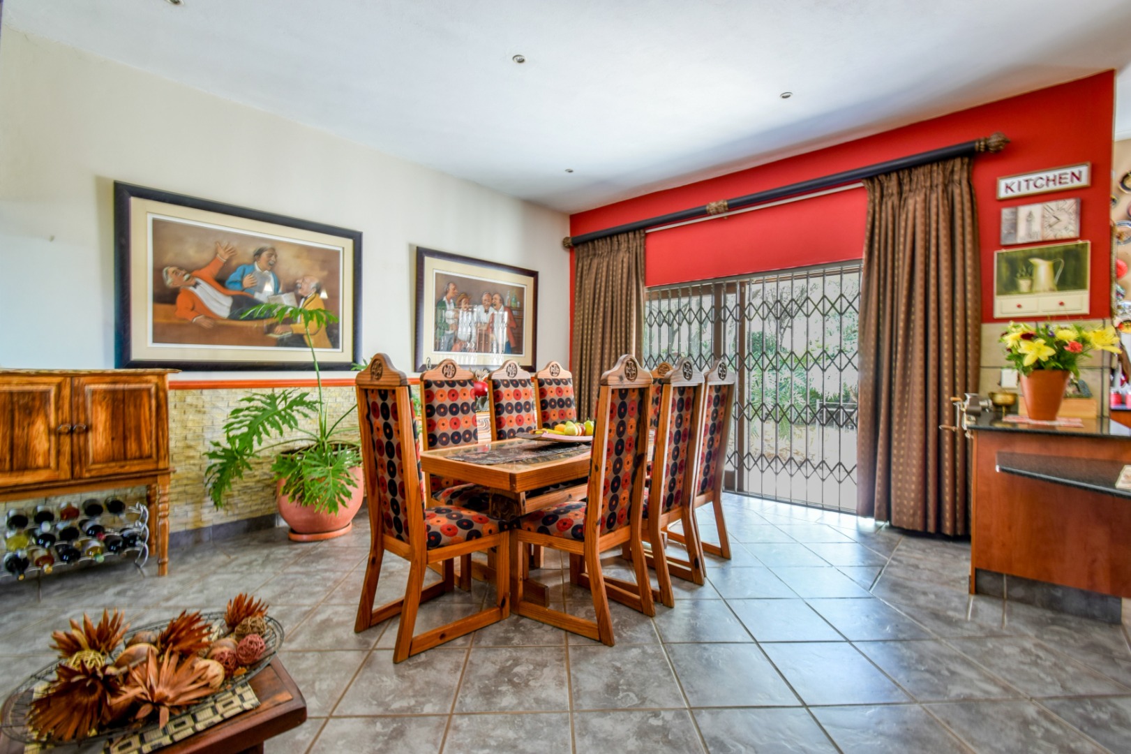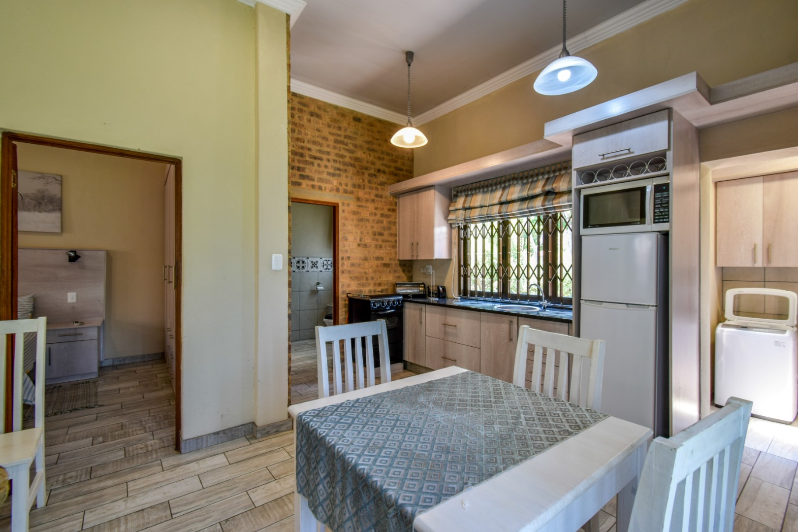 Upstairs, an impressive entertainment area awaits, boasting a lounge, built-in braai, kitchenette, and bathroom. Sliding doors open onto a balcony overlooking the property and the scenic Rietvlei Dam — the perfect setting for relaxed gatherings with family and friends.