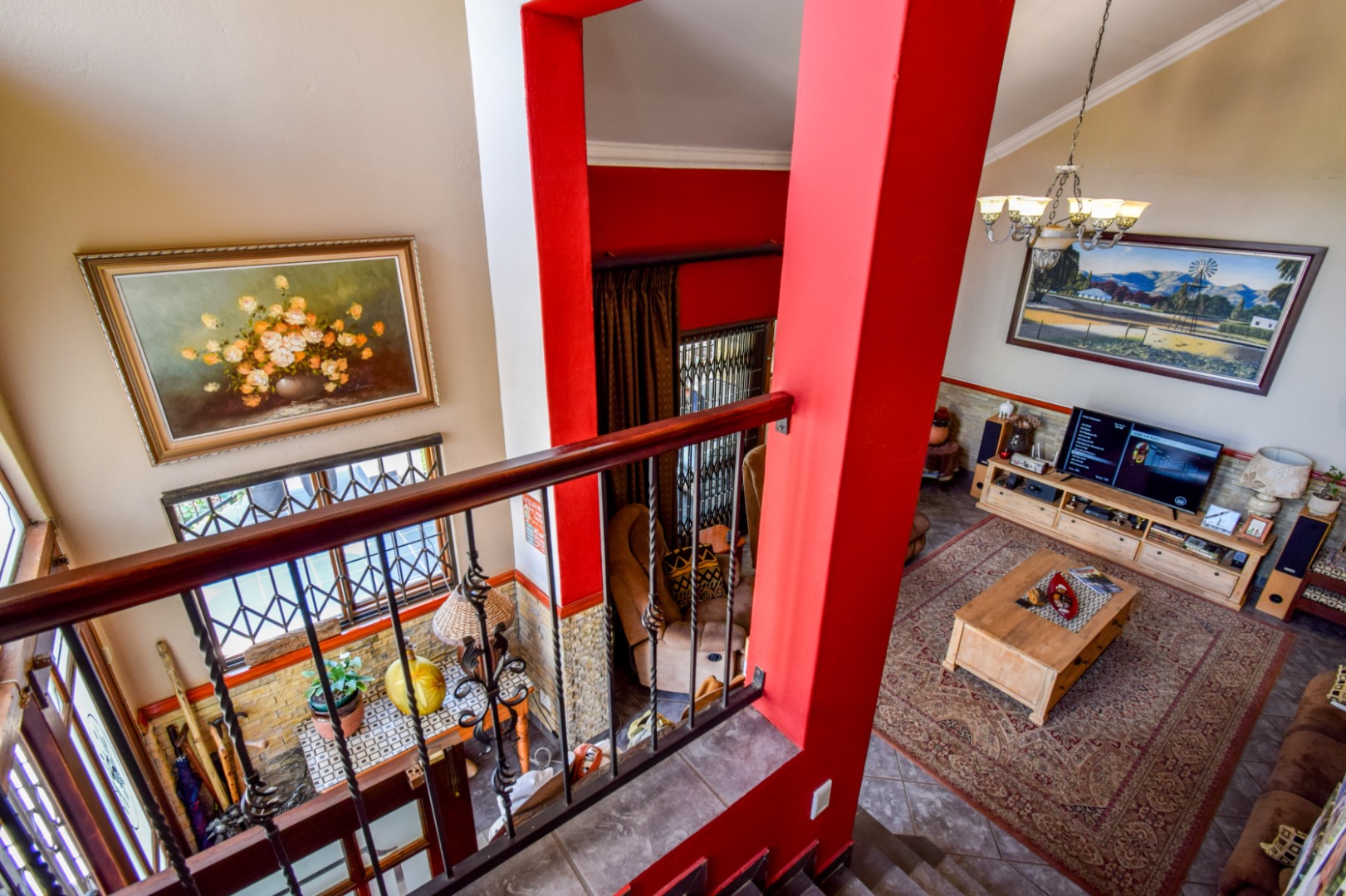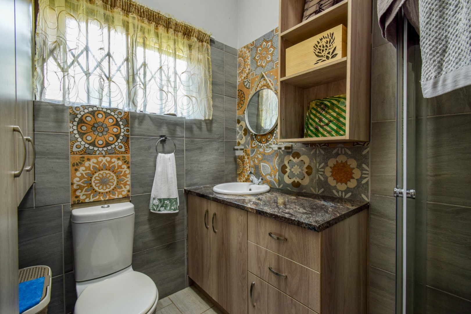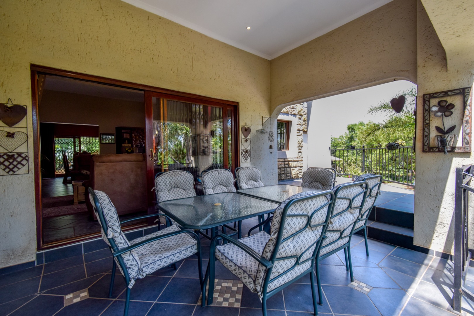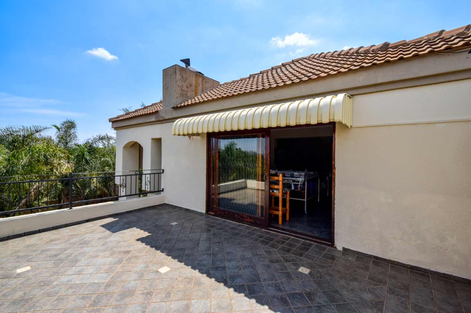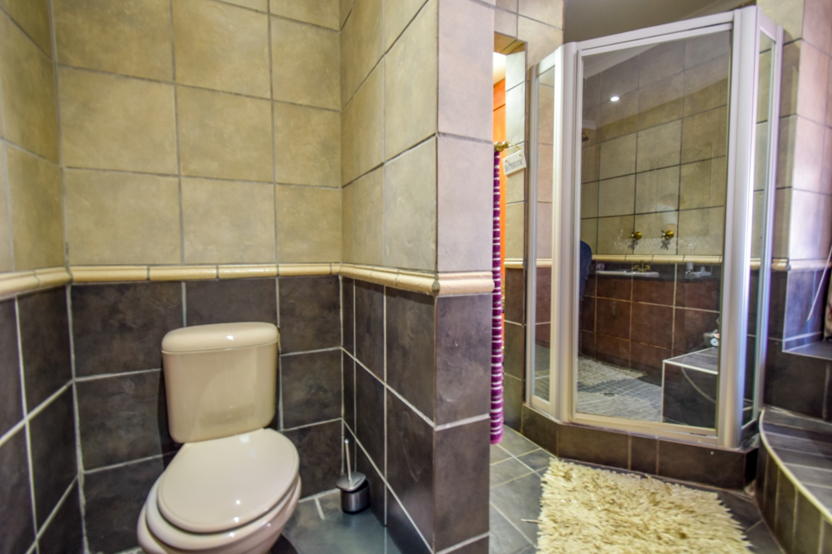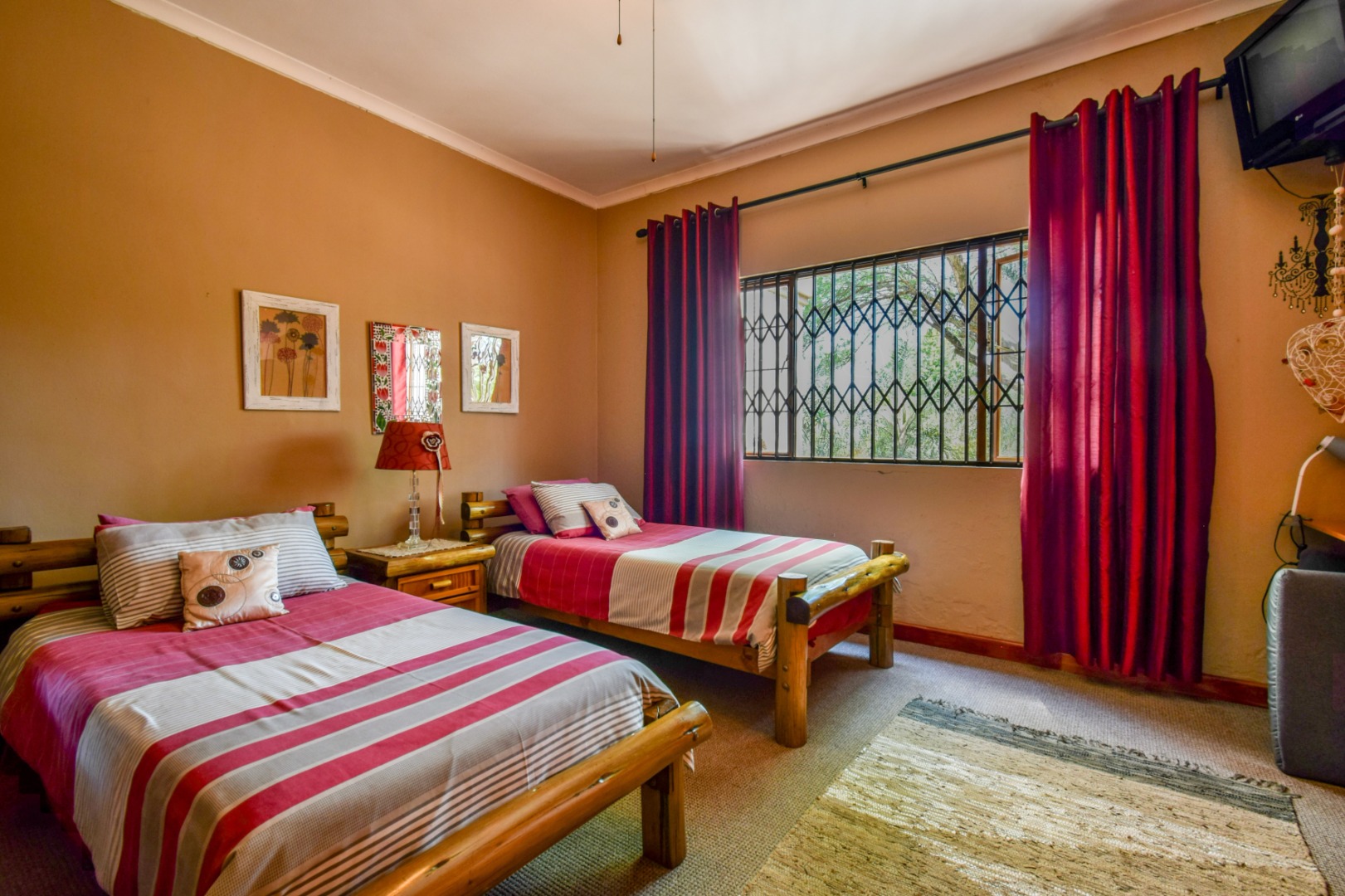 Upstairs, an impressive entertainment area awaits, boasting a lounge, built-in braai, kitchenette, and bathroom. Sliding doors open onto a balcony overlooking the property and the scenic Rietvlei Dam — the perfect setting for relaxed gatherings with family and friends.