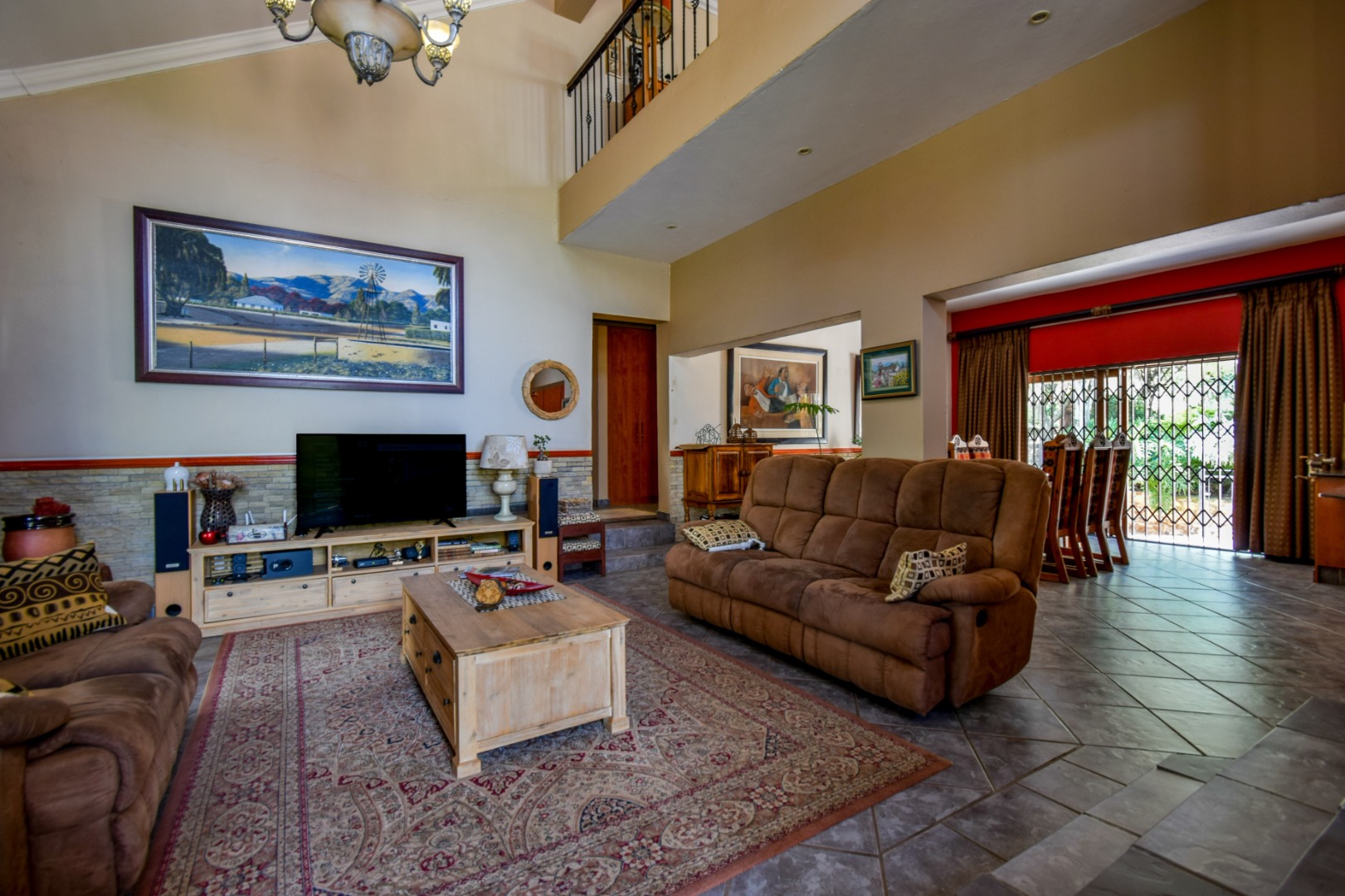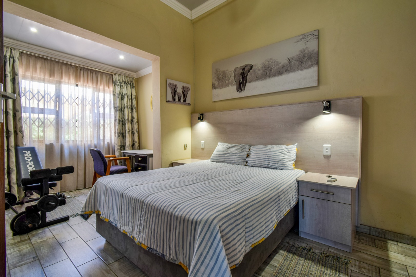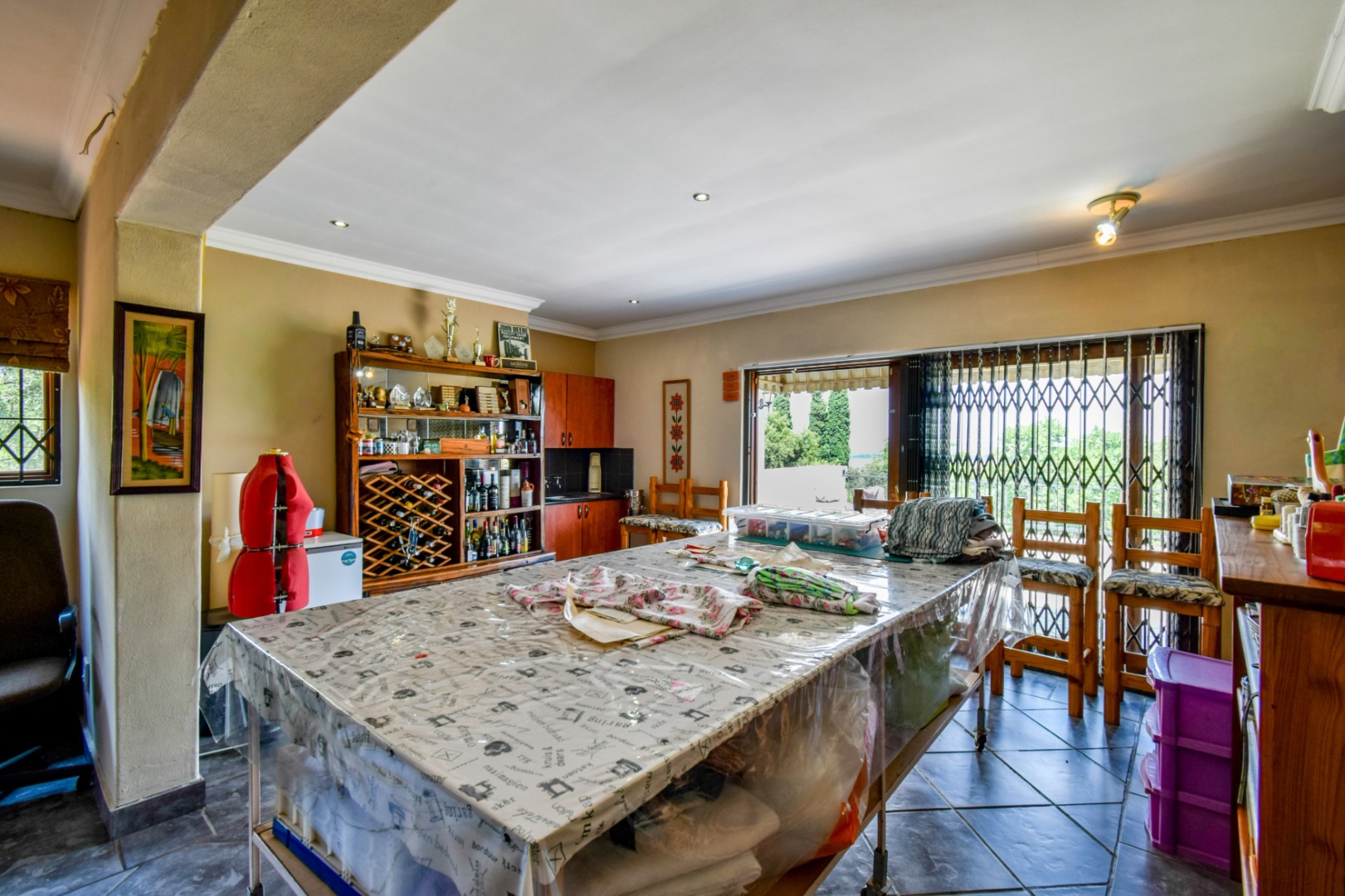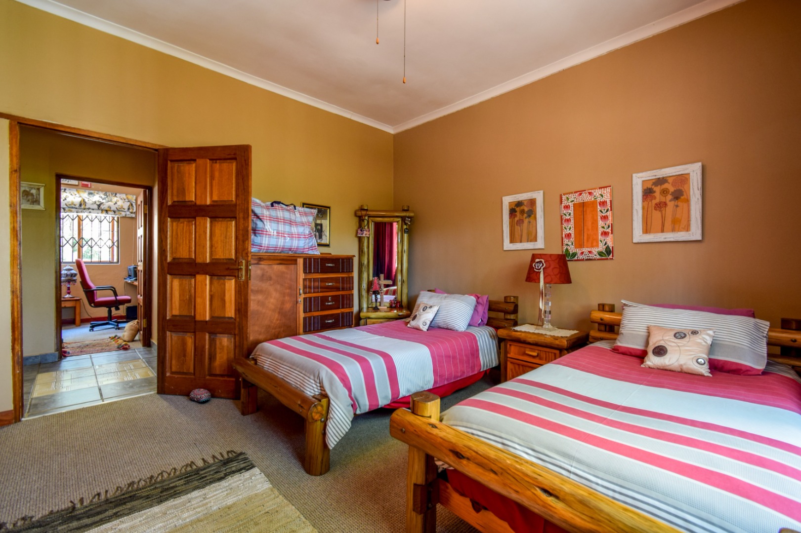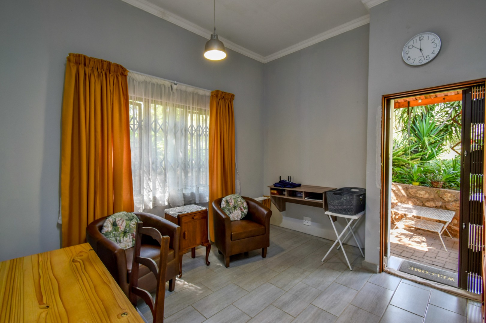 Upstairs, an impressive entertainment area awaits, boasting a lounge, built-in braai, kitchenette, and bathroom. Sliding doors open onto a balcony overlooking the property and the scenic Rietvlei Dam — the perfect setting for relaxed gatherings with family and friends.