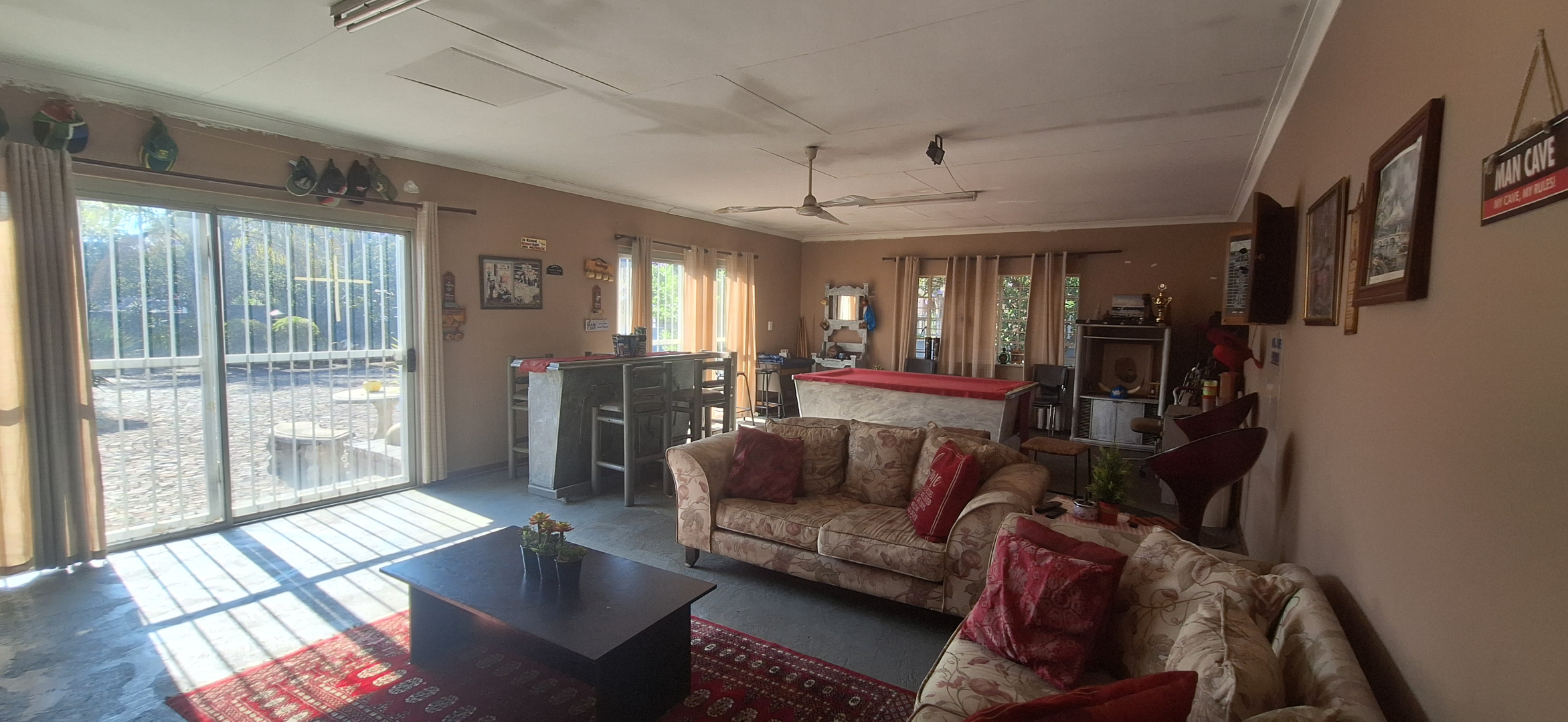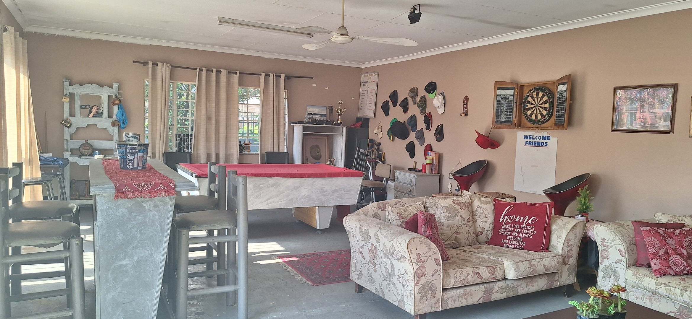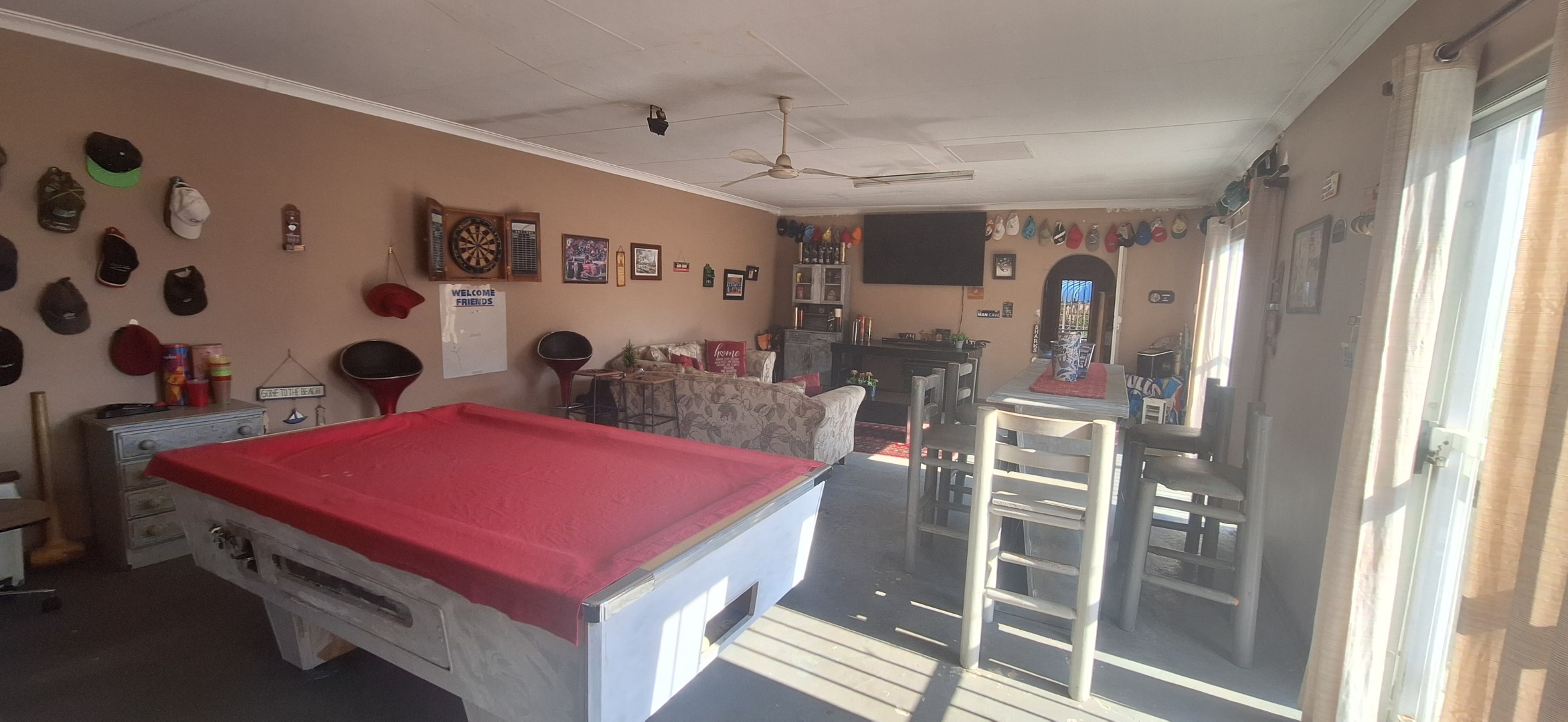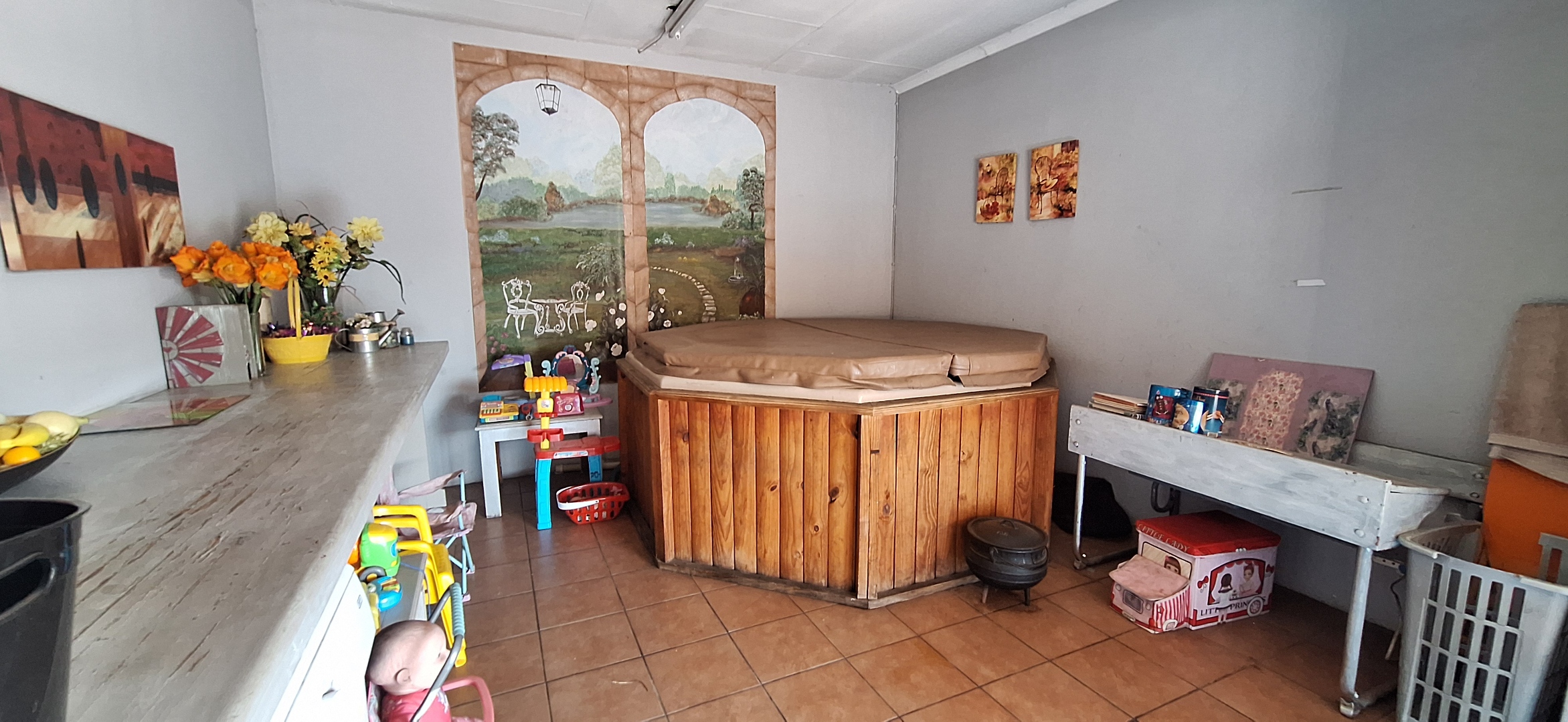 This home is an entertainer's dream, featuring a dedicated recreation room with a bar area and space for a pool table, as seen in the photos. Sliding doors open directly onto the expansive paved outdoor area, which includes a patio and a built-in braai, perfect for alfresco dining. Unwind in the jacuzzi after a long day. Practical amenities include a laundry room, storage, staff quarters, and outside toilet and shower, adding to the property's functionality.
