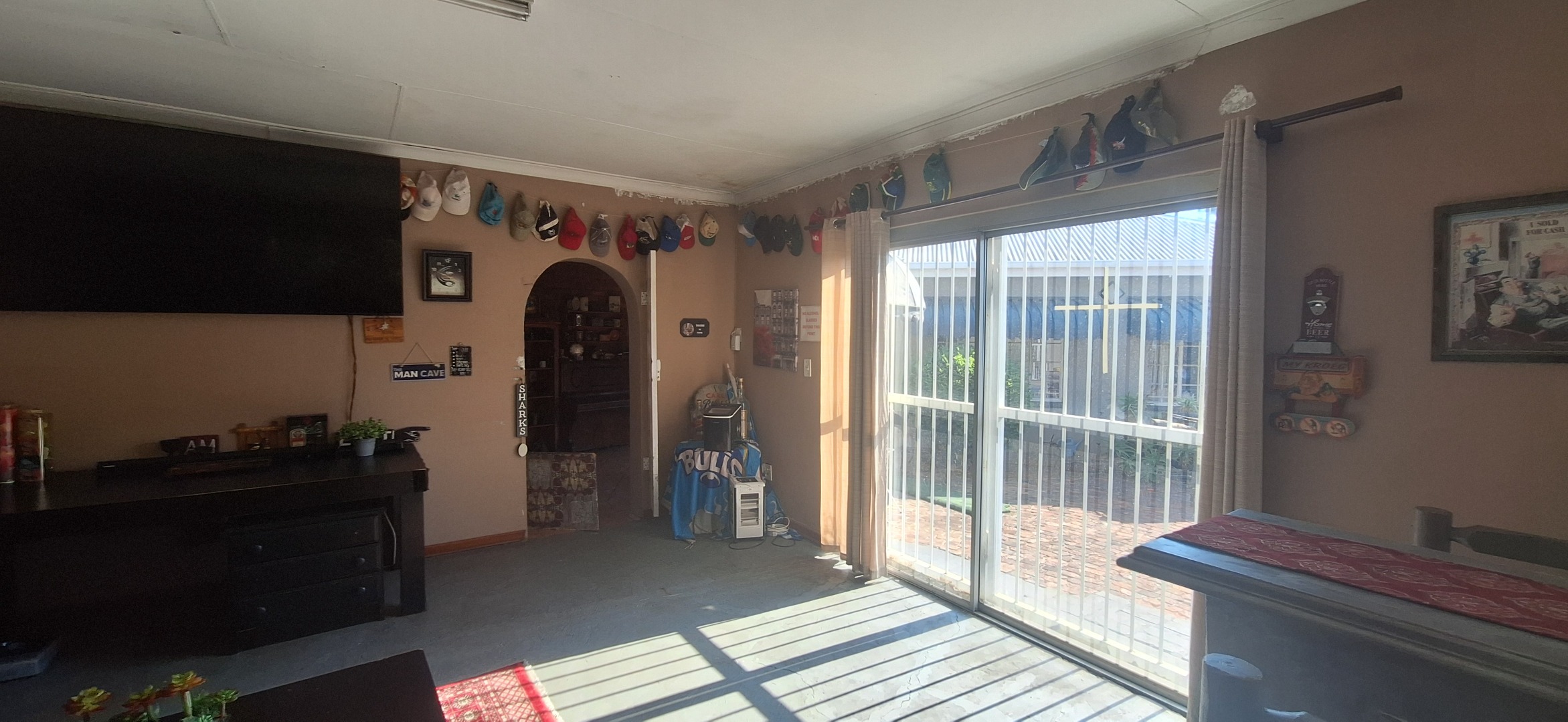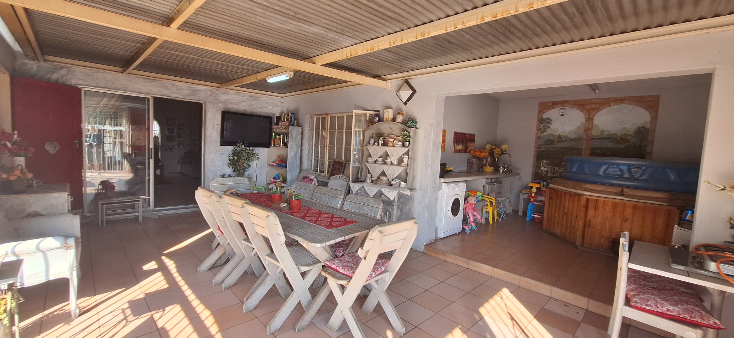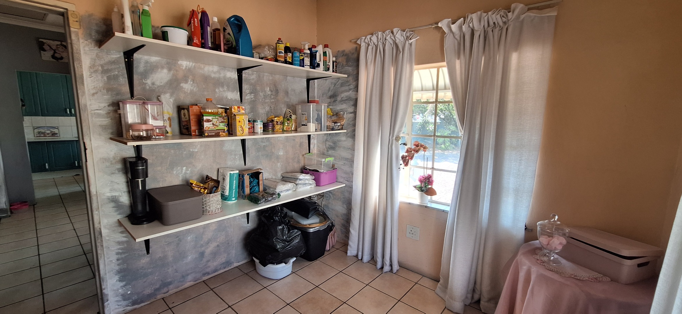 This home is an entertainer's dream, featuring a dedicated recreation room with a bar area and space for a pool table, as seen in the photos. Sliding doors open directly onto the expansive paved outdoor area, which includes a patio and a built-in braai, perfect for alfresco dining. Unwind in the jacuzzi after a long day. Practical amenities include a laundry room, storage, staff quarters, and outside toilet and shower, adding to the property's functionality.