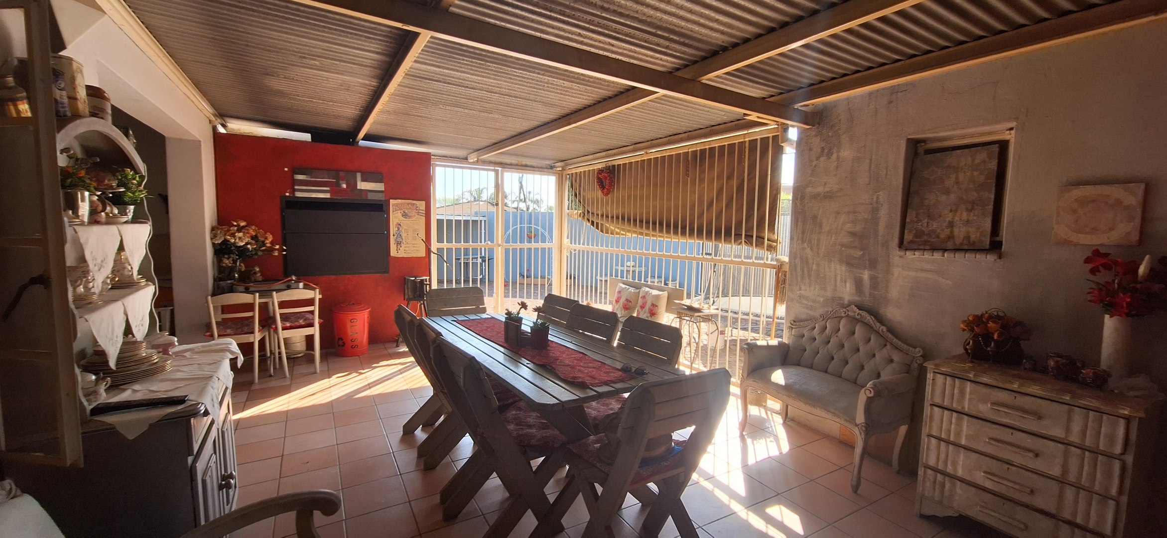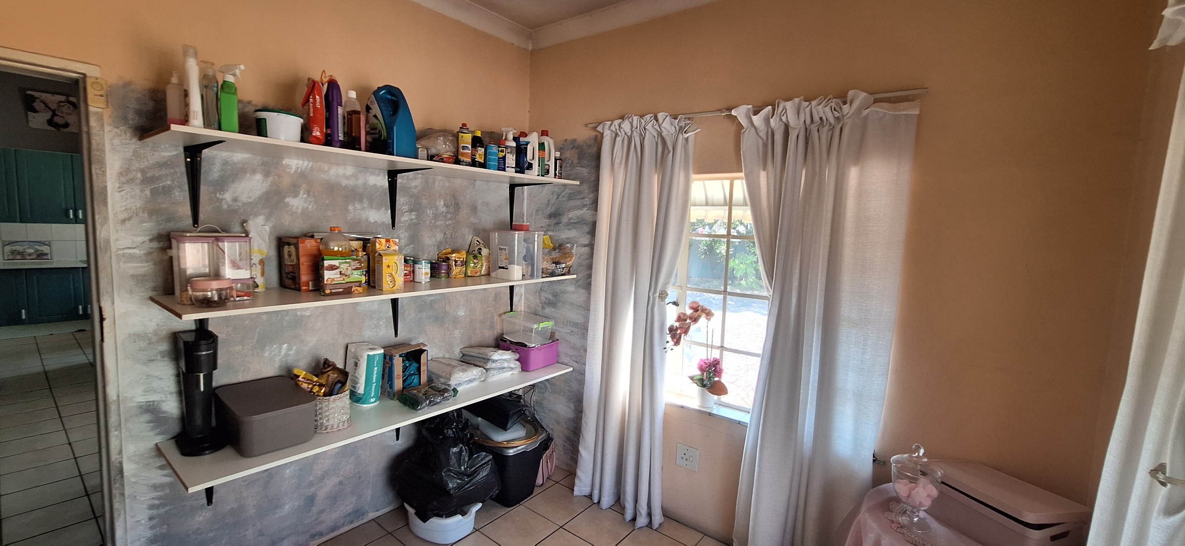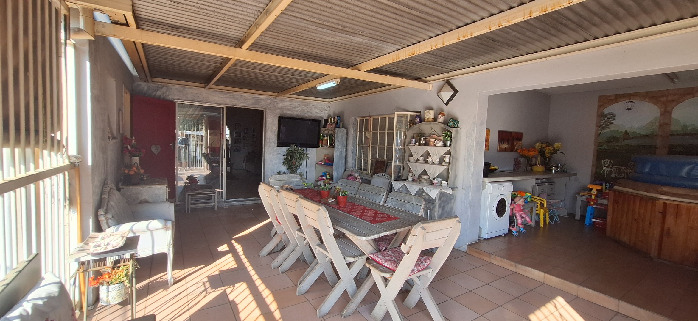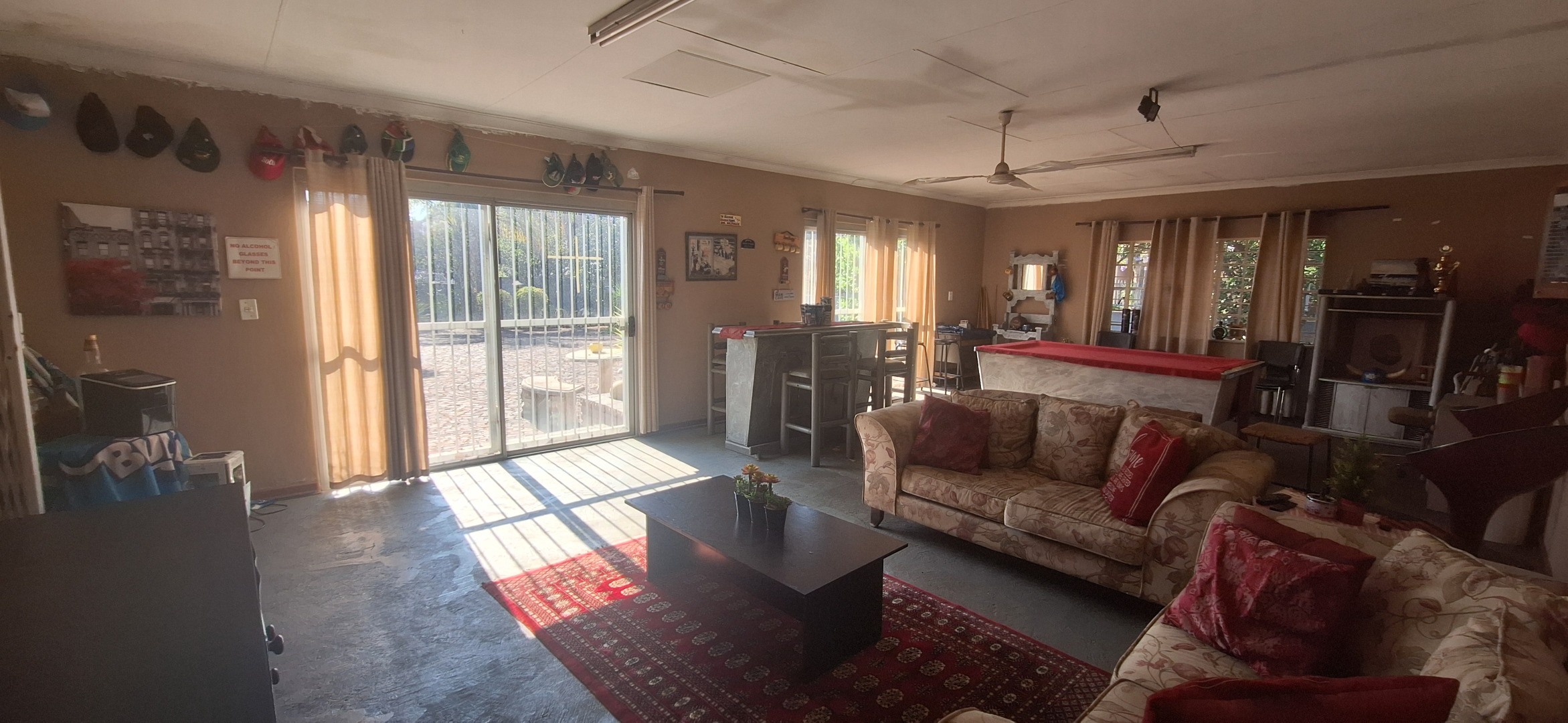 This home is an entertainer's dream, featuring a dedicated recreation room with a bar area and space for a pool table, as seen in the photos. Sliding doors open directly onto the expansive paved outdoor area, which includes a patio and a built-in braai, perfect for alfresco dining. Unwind in the jacuzzi after a long day. Practical amenities include a laundry room, storage, staff quarters, and outside toilet and shower, adding to the property's functionality.