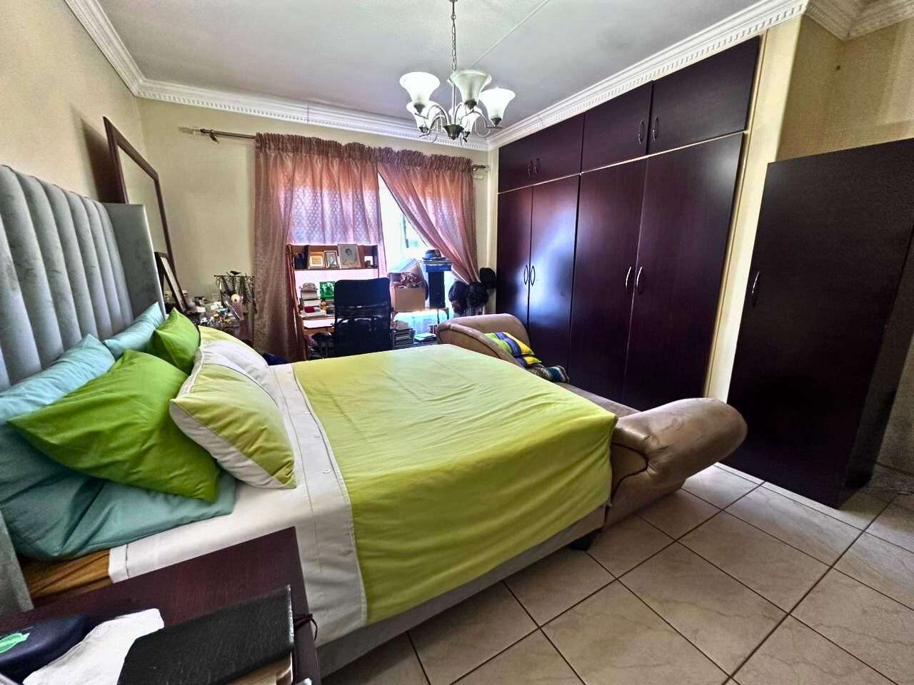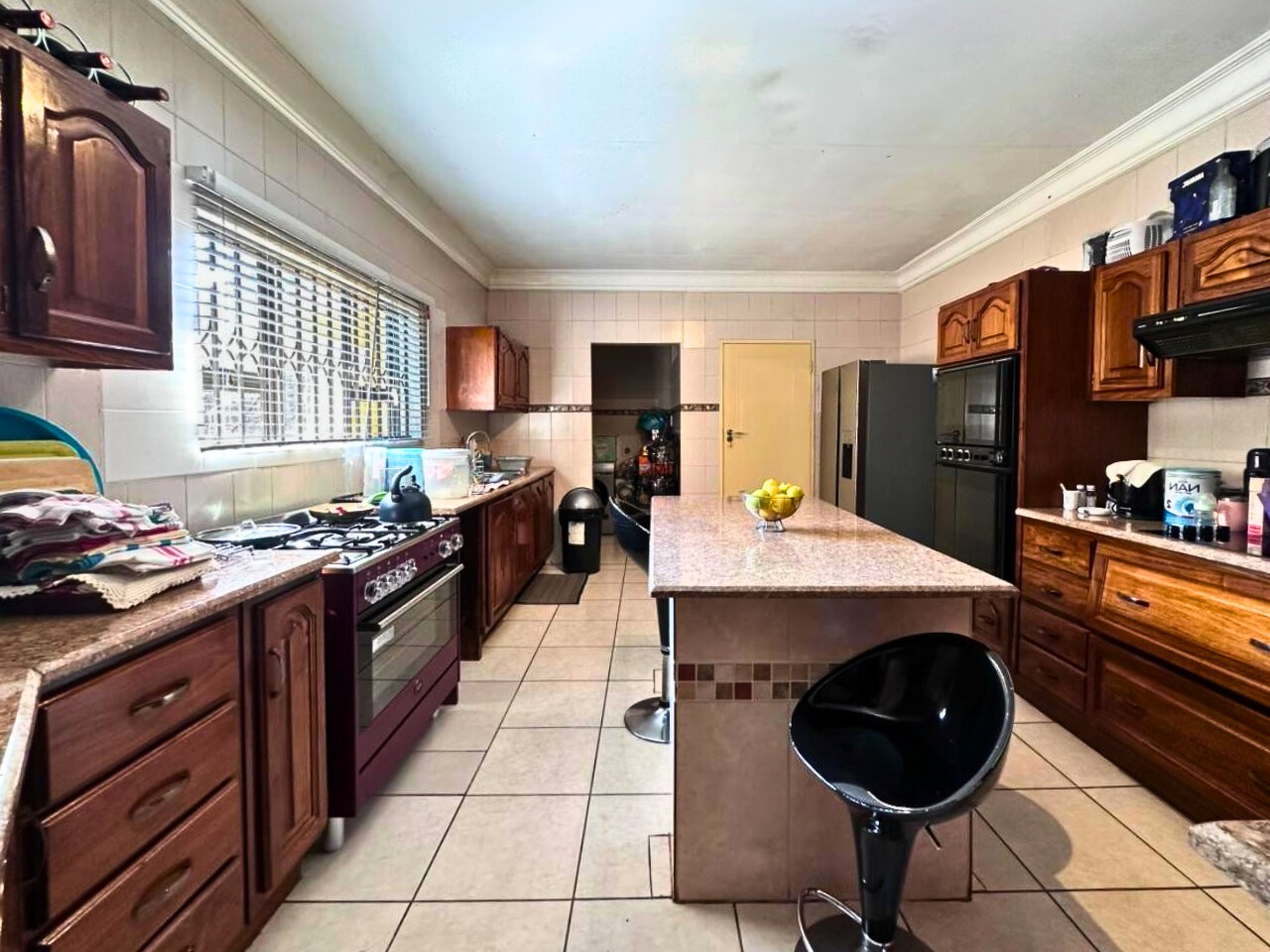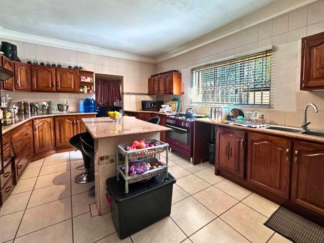 The spacious kitchen forms the heart of the home, featuring extensive wooden cabinetry, ample counter space, a functional central island with a breakfast bar, and a convenient pantry. Natural light streams in through a large window. The residence comprises three well-proportioned bedrooms, including a main bedroom with an en-suite bathroom. A second full bathroom serves the remaining rooms, complemented by a guest toilet. All bedrooms offer built-in wardrobes and dedicated desk/study areas.