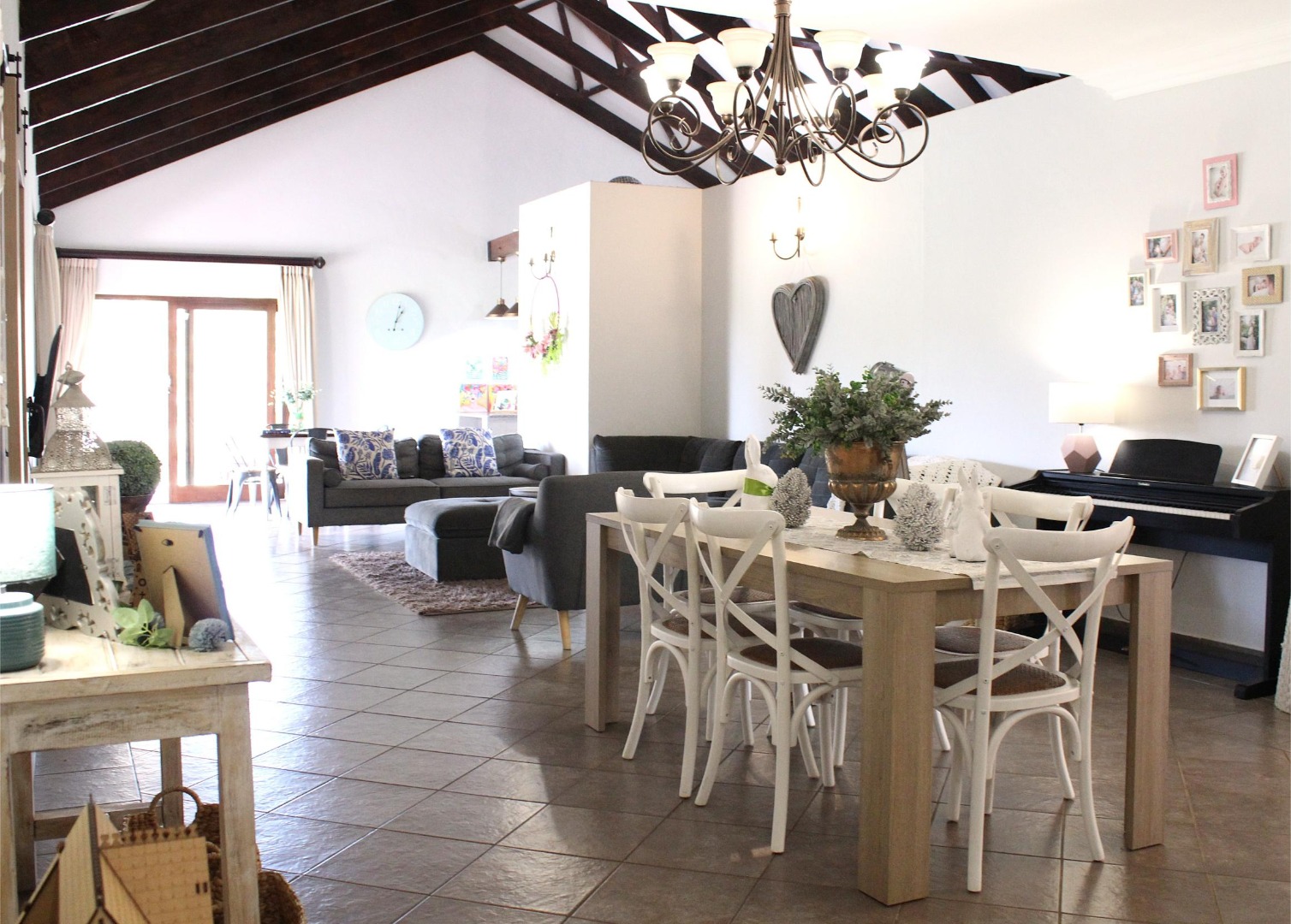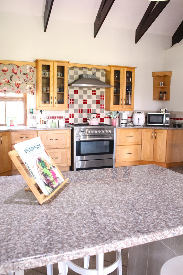 The open-plan living area has a double volume roof with exposed wooden beams and the space flows freely into the large farm style kitchen. The open-plan area also connects through double sliding doors that open up to a big outside undercover wrap around veranda, which provides space for multiple covered seating areas and outside entertainment.