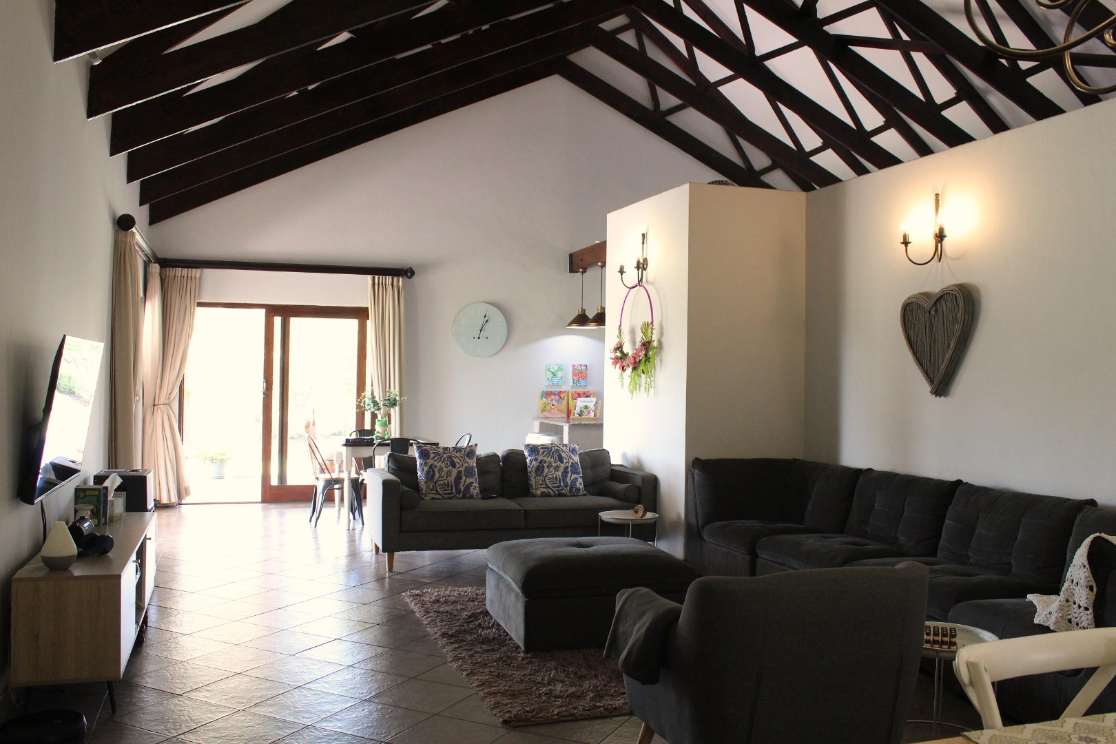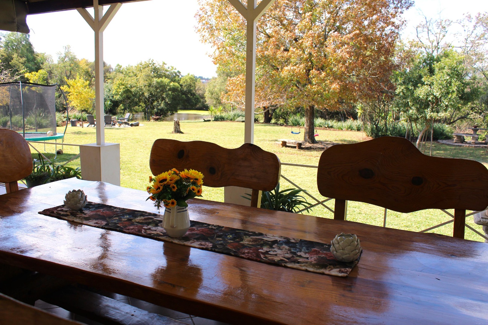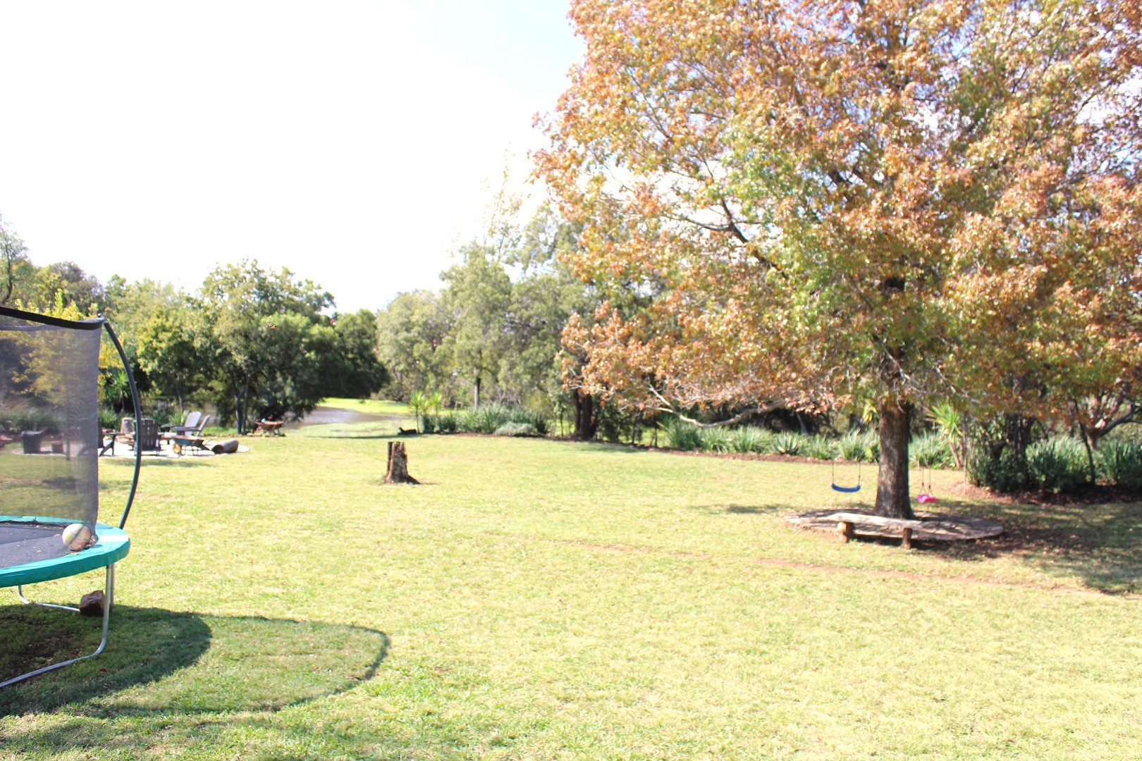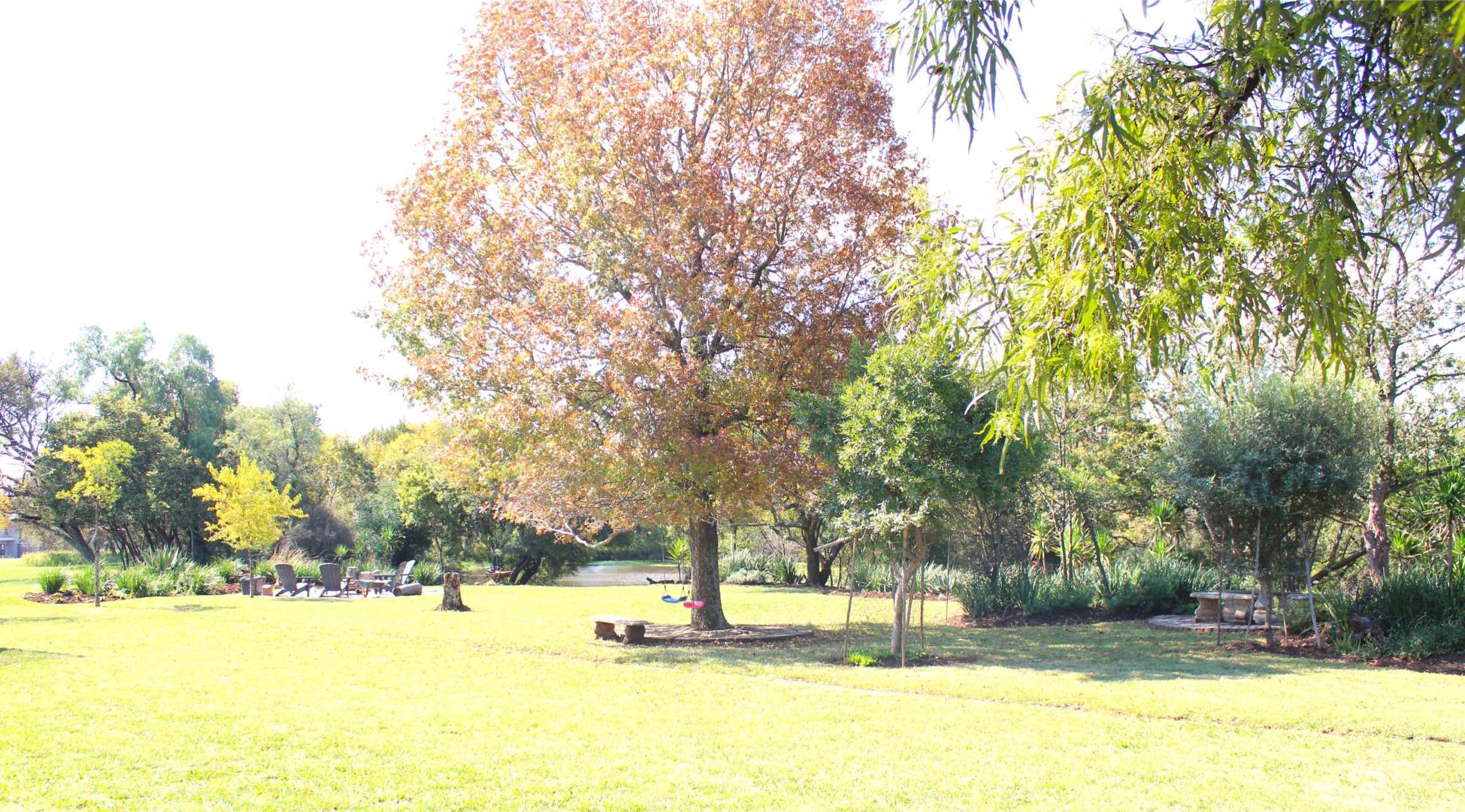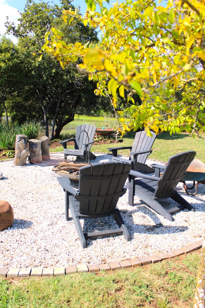 Outside is a lovely manicured garden and a firepit, ideal for an outside bbq or to enjoy sundowners while you feel surrounded by nature.