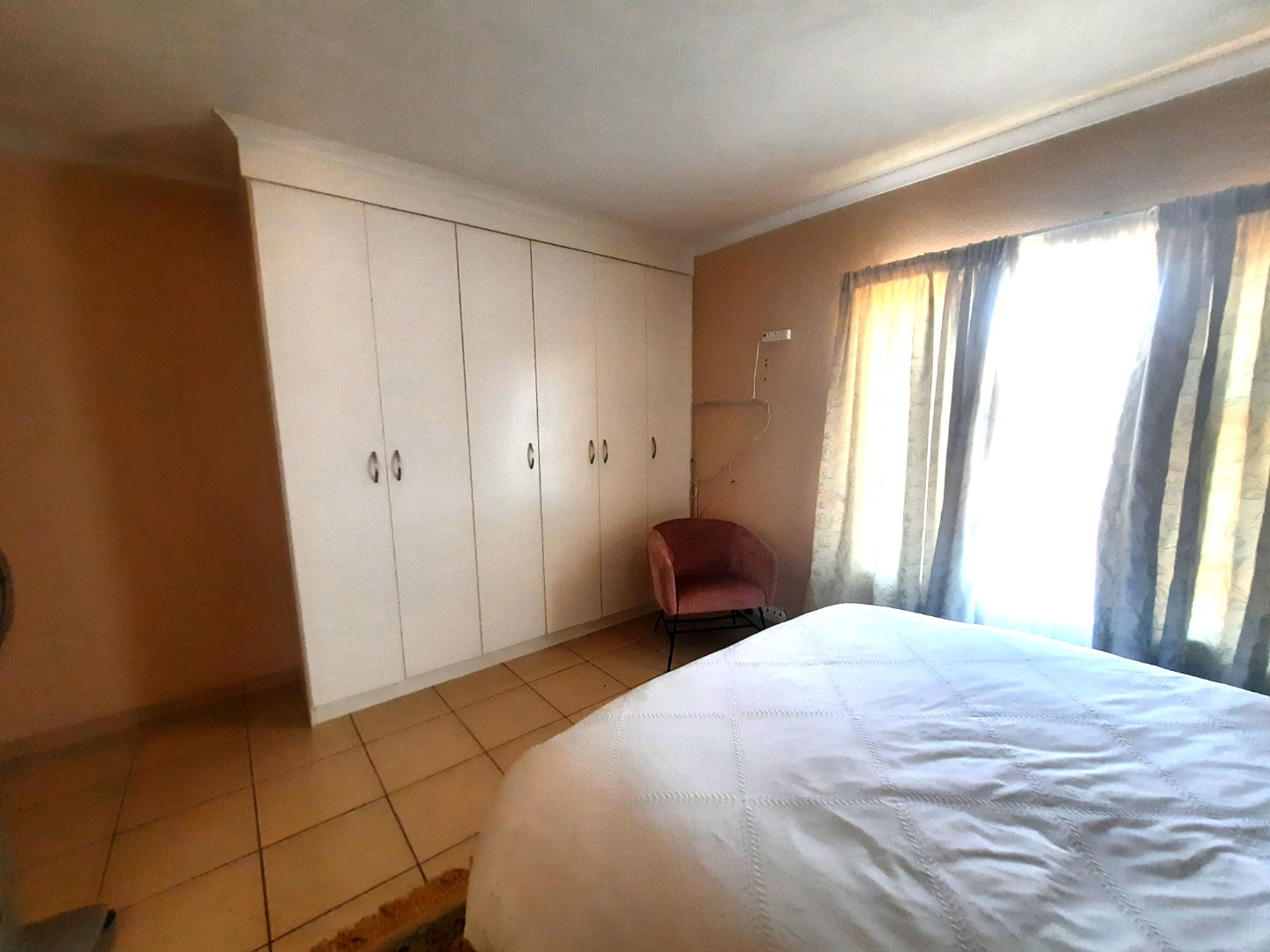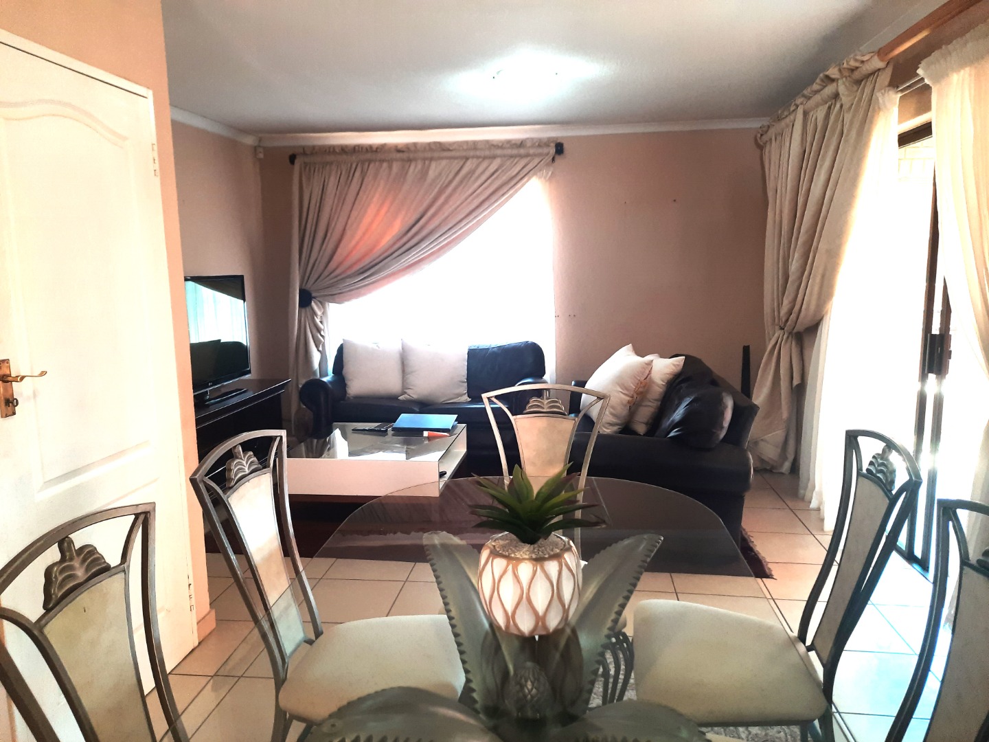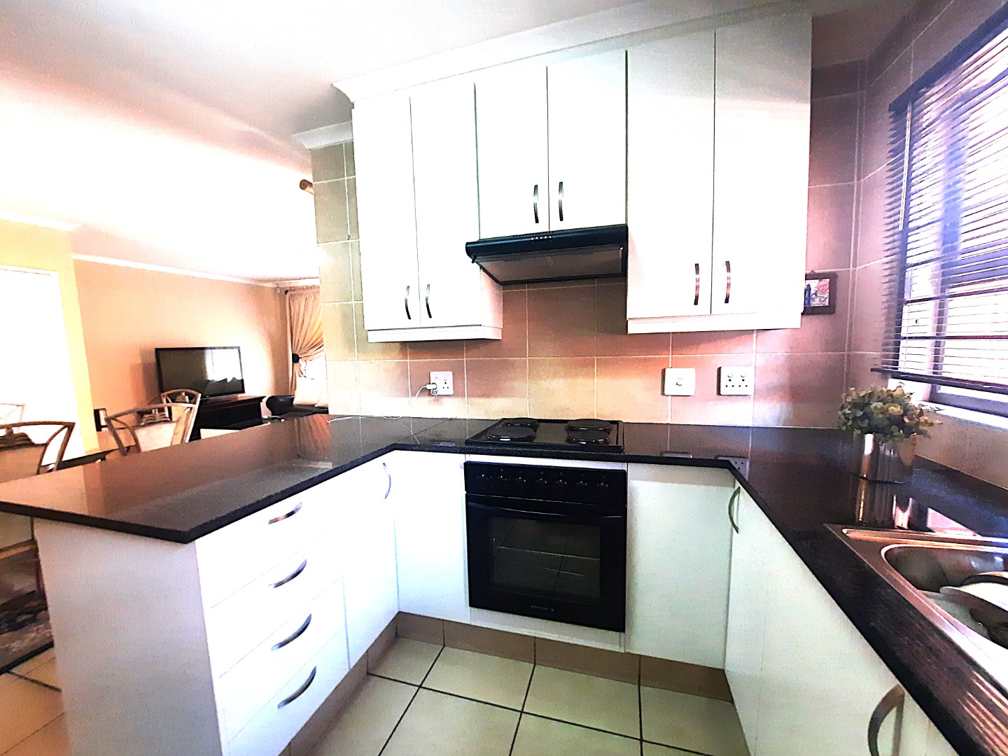 Upon entering, you are greeted by an inviting open-plan living and dining area, characterized by durable tiled flooring that extends throughout the main spaces.