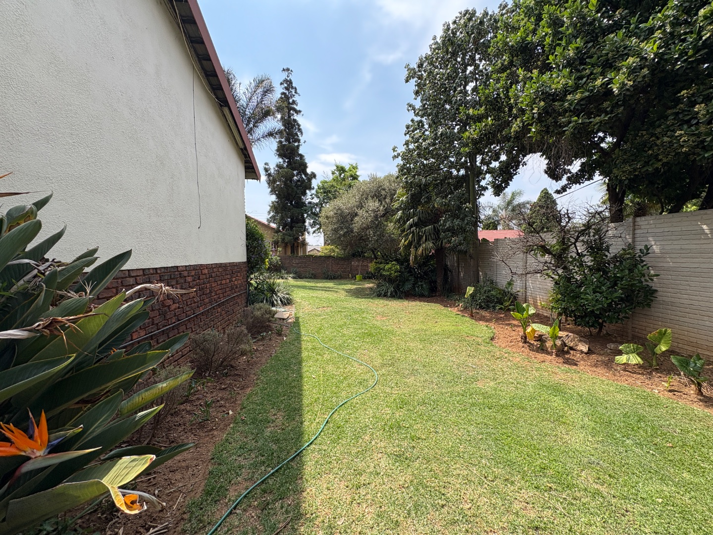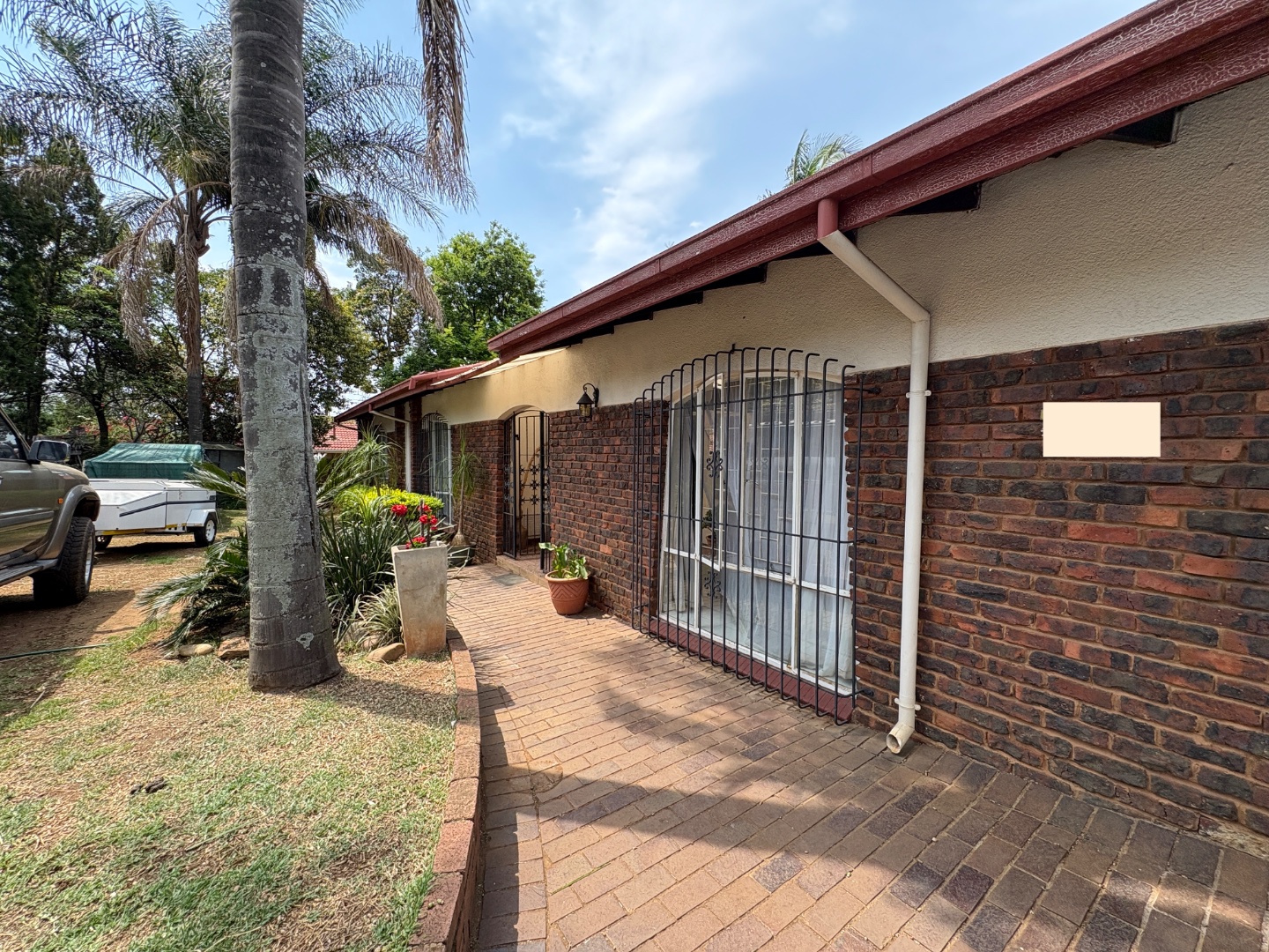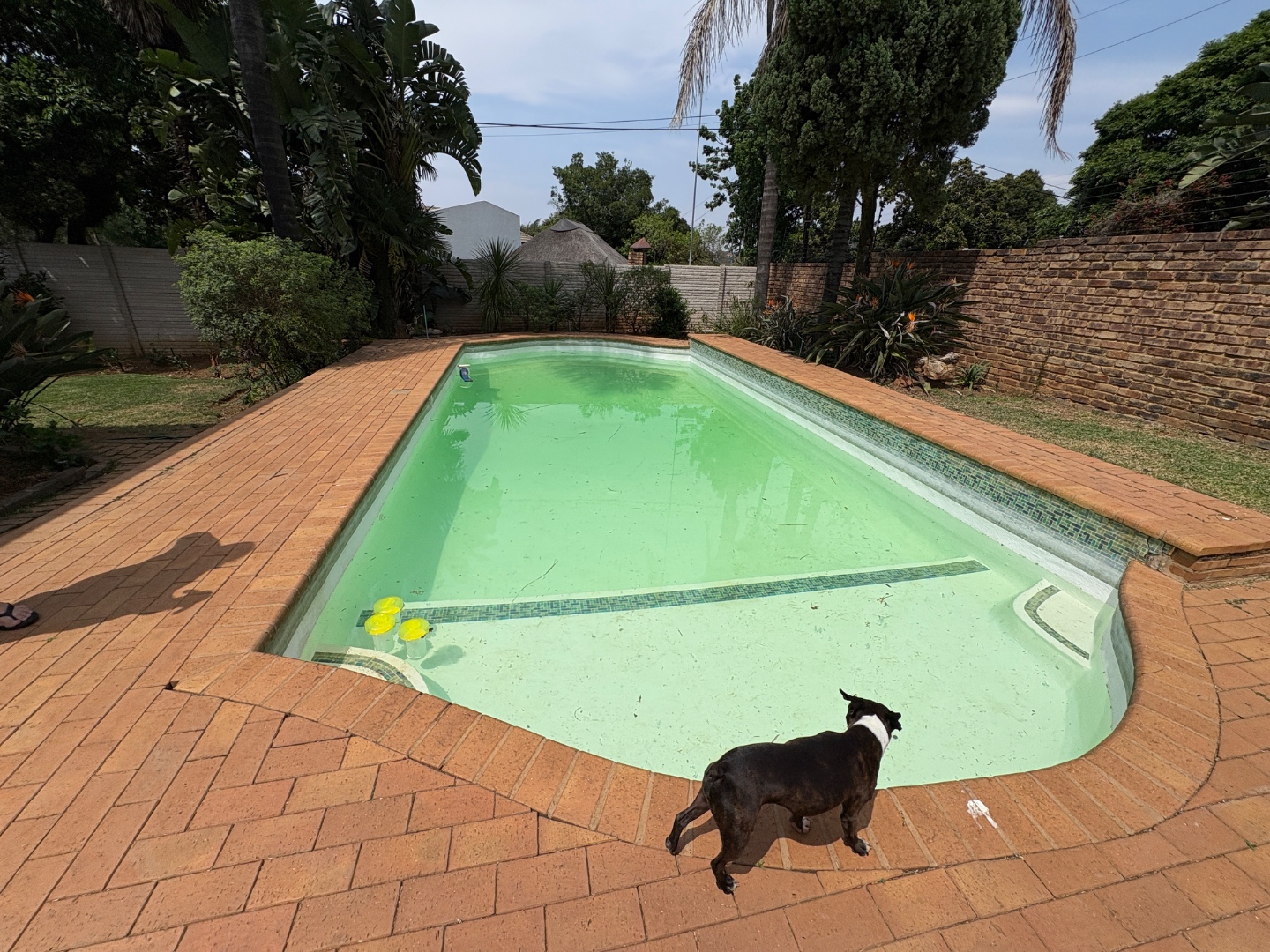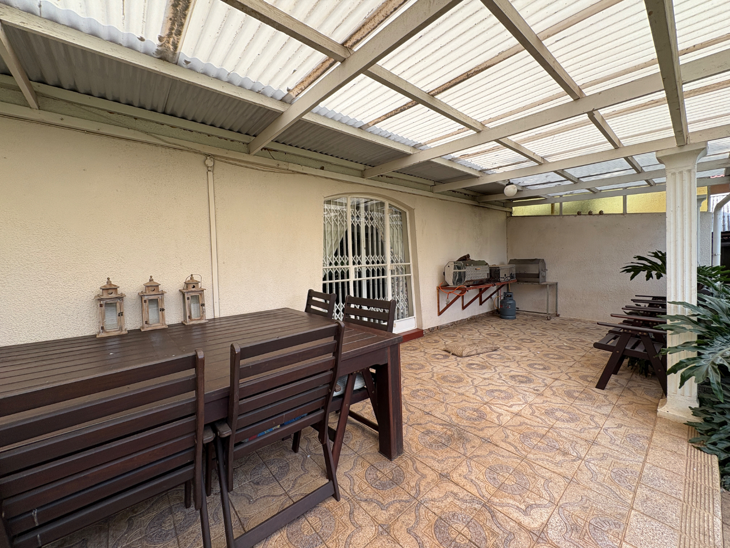 This single story 4-bedroom family home, nestled on a generous 1242 sqm erf in Wingate Park, Pretoria, offers an inviting lifestyle. The property boasts a large, well-maintained garden with mature trees and a sparkling pool, perfect for outdoor enjoyment. A spacious covered patio provides an ideal setting for entertaining or relaxing, overlooking the lush surroundings.