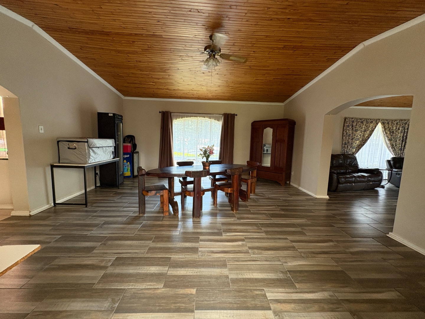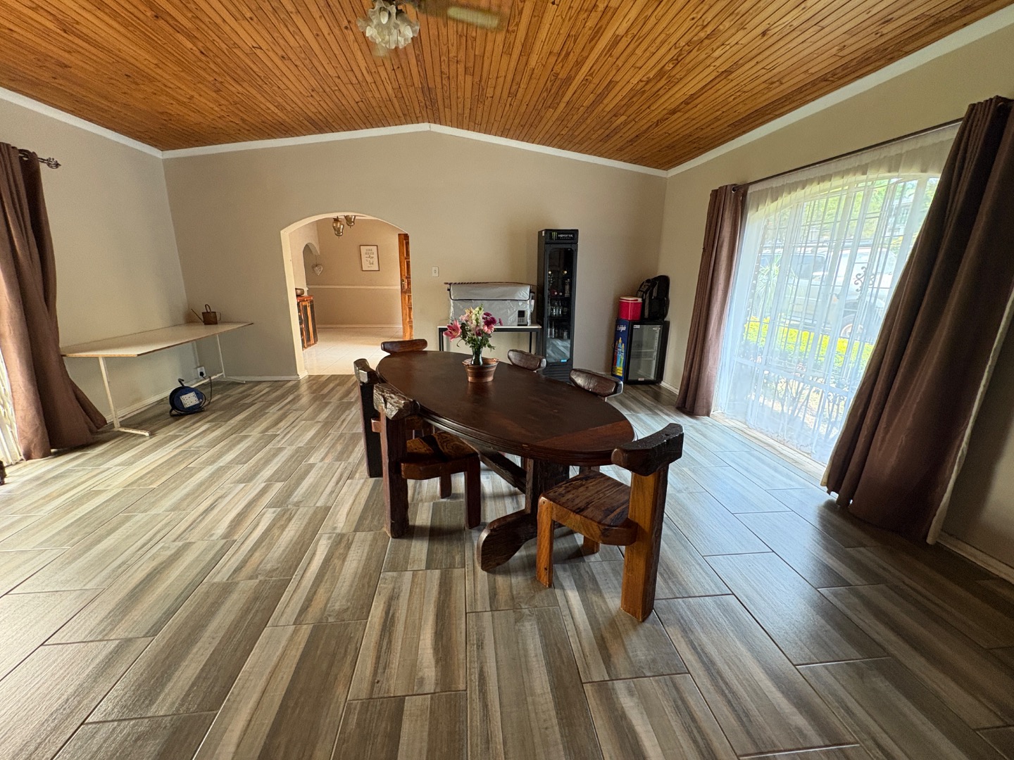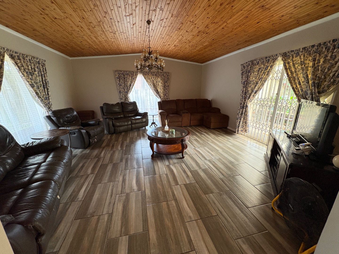 Inside, an open-concept layout features two comfortable lounges and a dedicated dining room, all adorned with unique wooden plank ceilings and modern wood-look tiled flooring. Large windows ensure abundant natural light throughout these versatile living spaces. The functional kitchen is equipped with ample cabinetry, granite-look countertops, and a convenient pantry, catering to all culinary needs. A dedicated laundry room with a double utility sink adds practicality.