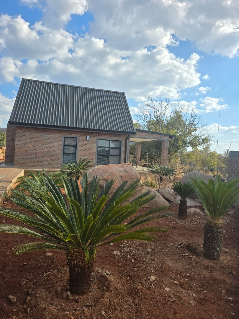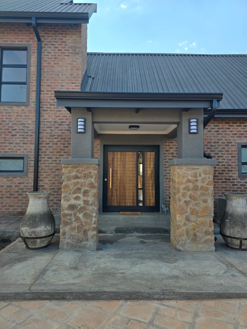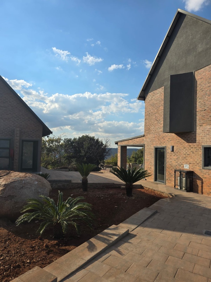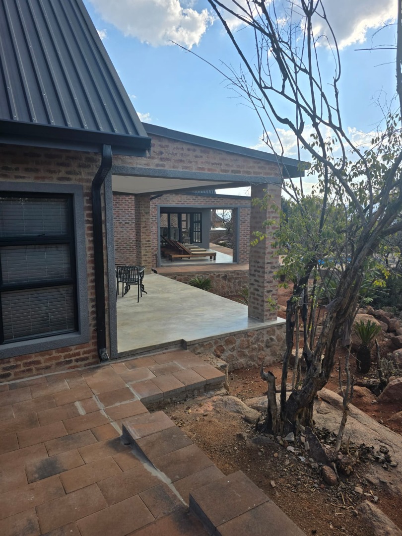 Discover an exceptional bushveld retreat within the prestigious Mabalingwe Nature Reserve, Bela Bela, South Africa. This modern, furnished residence, spanning 561 square metres on an expansive 9,658,601 square metre erf, offers a harmonious blend of contemporary design and natural serenity. The property immediately impresses with its striking brick architecture, distinctive dark metal roof, and terraced landscaping, seamlessly integrating into the arid yet beautiful surroundings.