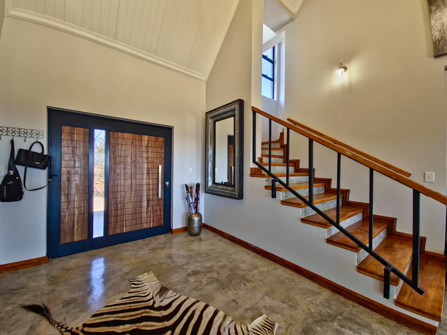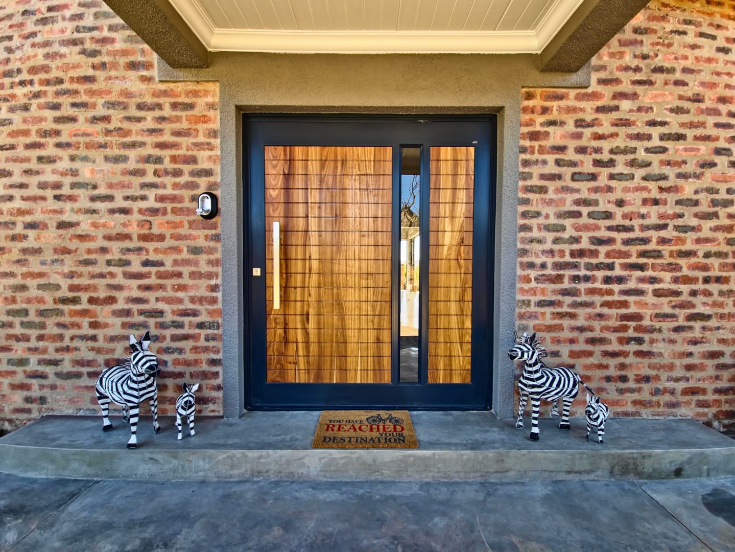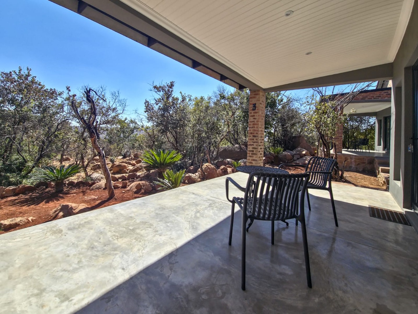Discover an exceptional bushveld retreat within the prestigious Mabalingwe Nature Reserve, Bela Bela, South Africa. This modern, furnished residence, spanning 561 square metres on an expansive 9,658,601 square metre erf, offers a harmonious blend of contemporary design and natural serenity. The property immediately impresses with its striking brick architecture, distinctive dark metal roof, and terraced landscaping, seamlessly integrating into the arid yet beautiful surroundings.