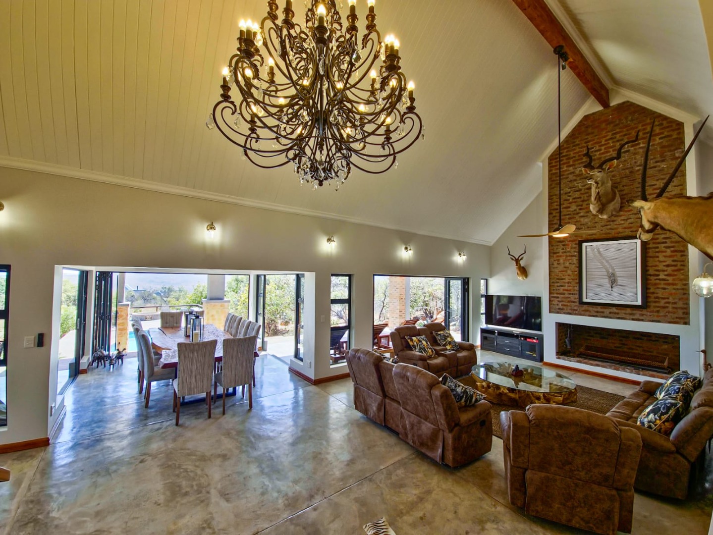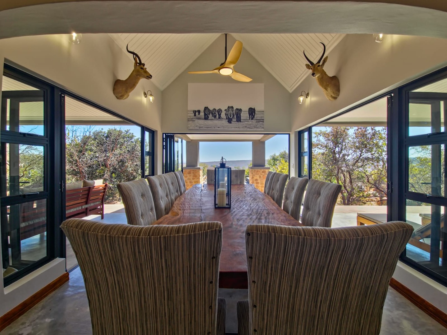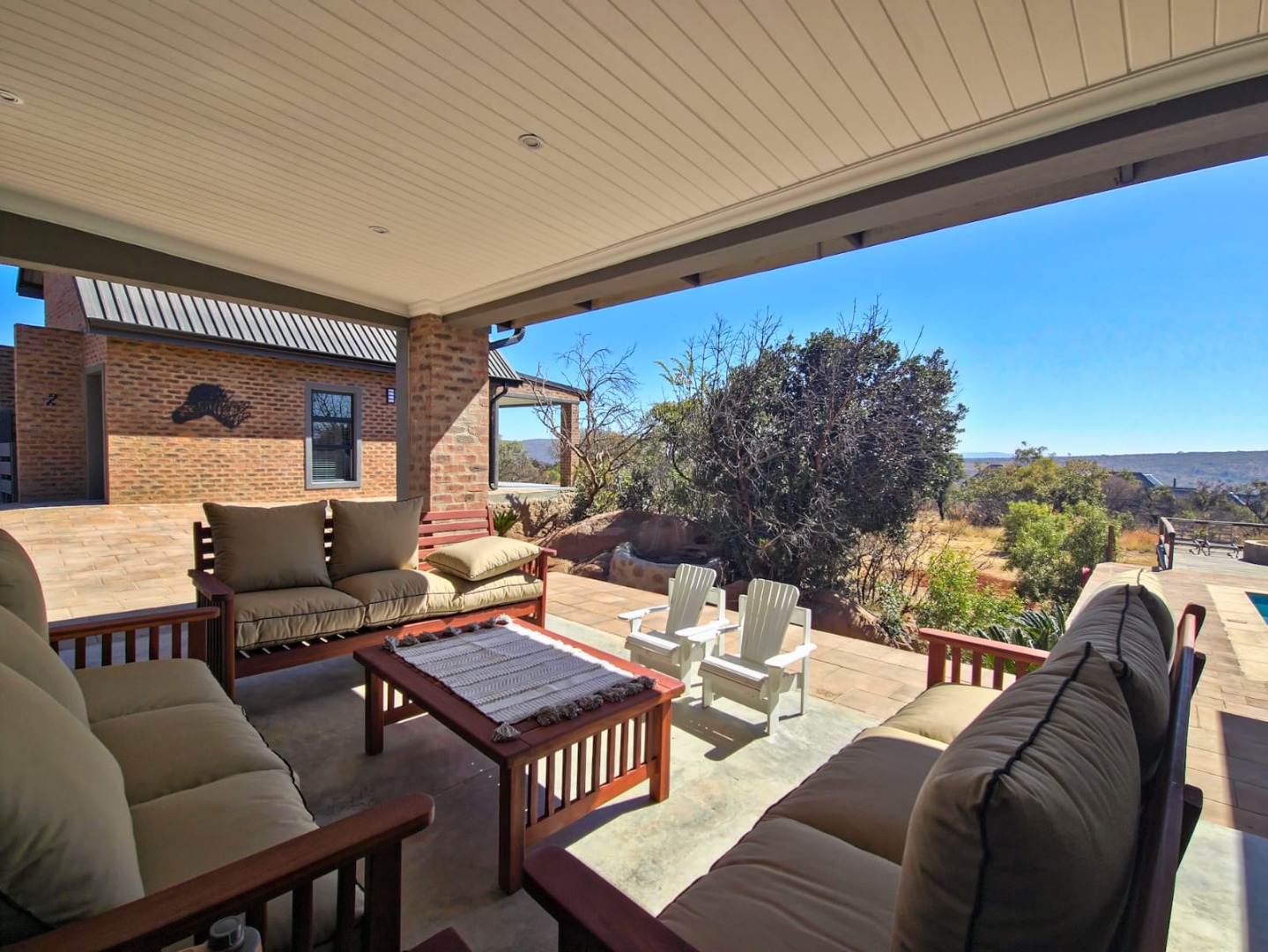 Outdoor living is a highlight, with multiple covered patios and an expansive wooden deck providing ideal spaces for relaxation and social gatherings. A large private swimming pool with clear water offers a refreshing escape, while a dedicated fire pit area and a built-in braai promise memorable evenings under the stars. The property also features a unique outdoor shower, adding to the bushveld experience. Panoramic bushveld views are a constant backdrop, creating a tranquil and picturesque setting. Parking is abundant with four garages and three additional parking spaces, including a covered carport, all accessible via a paved driveway.