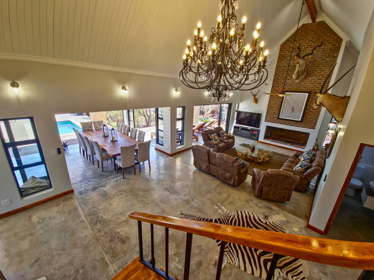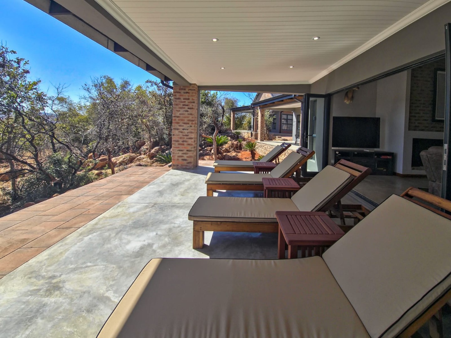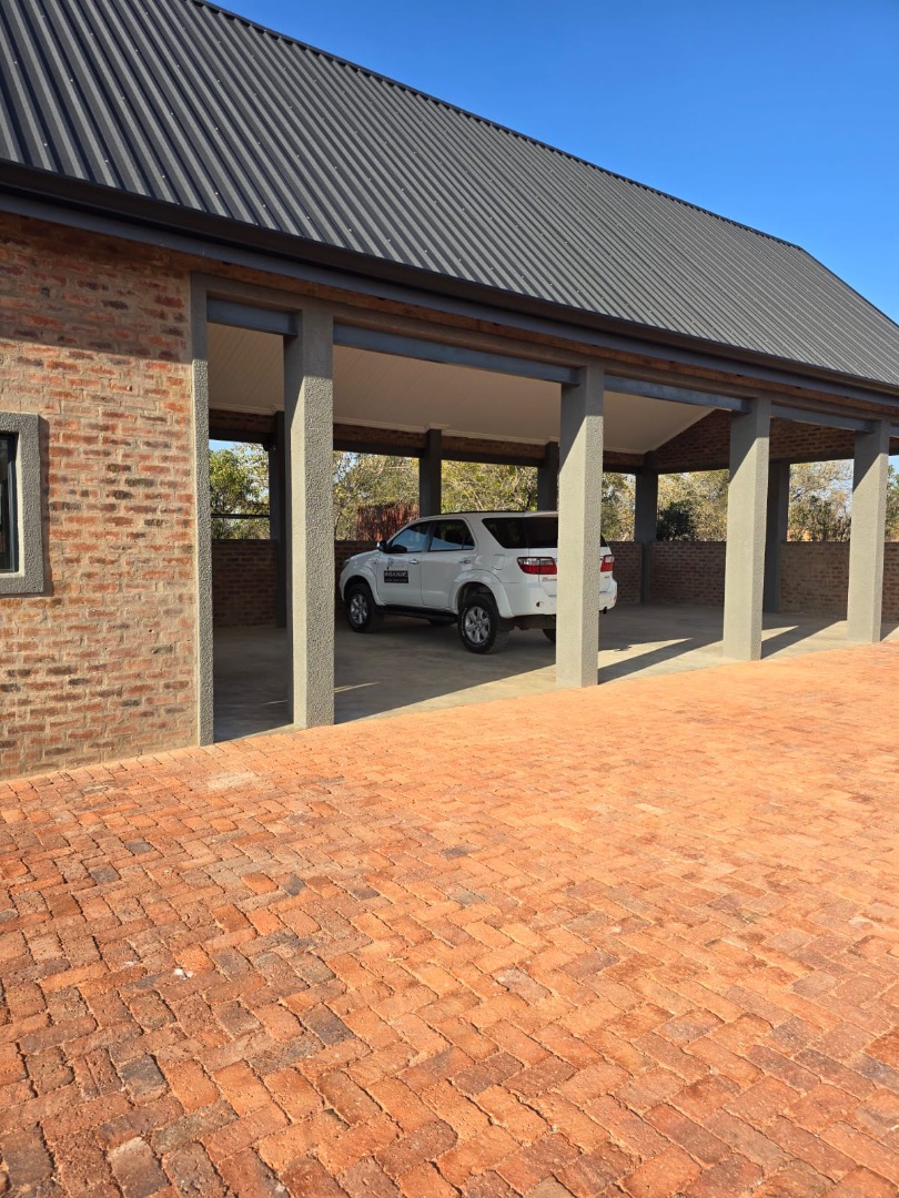 Outdoor living is a highlight, with multiple covered patios and an expansive wooden deck providing ideal spaces for relaxation and social gatherings. A large private swimming pool with clear water offers a refreshing escape, while a dedicated fire pit area and a built-in braai promise memorable evenings under the stars. The property also features a unique outdoor shower, adding to the bushveld experience. Panoramic bushveld views are a constant backdrop, creating a tranquil and picturesque setting. Parking is abundant with four garages and three additional parking spaces, including a covered carport, all accessible via a paved driveway.