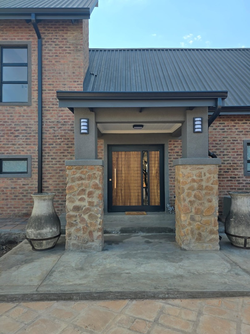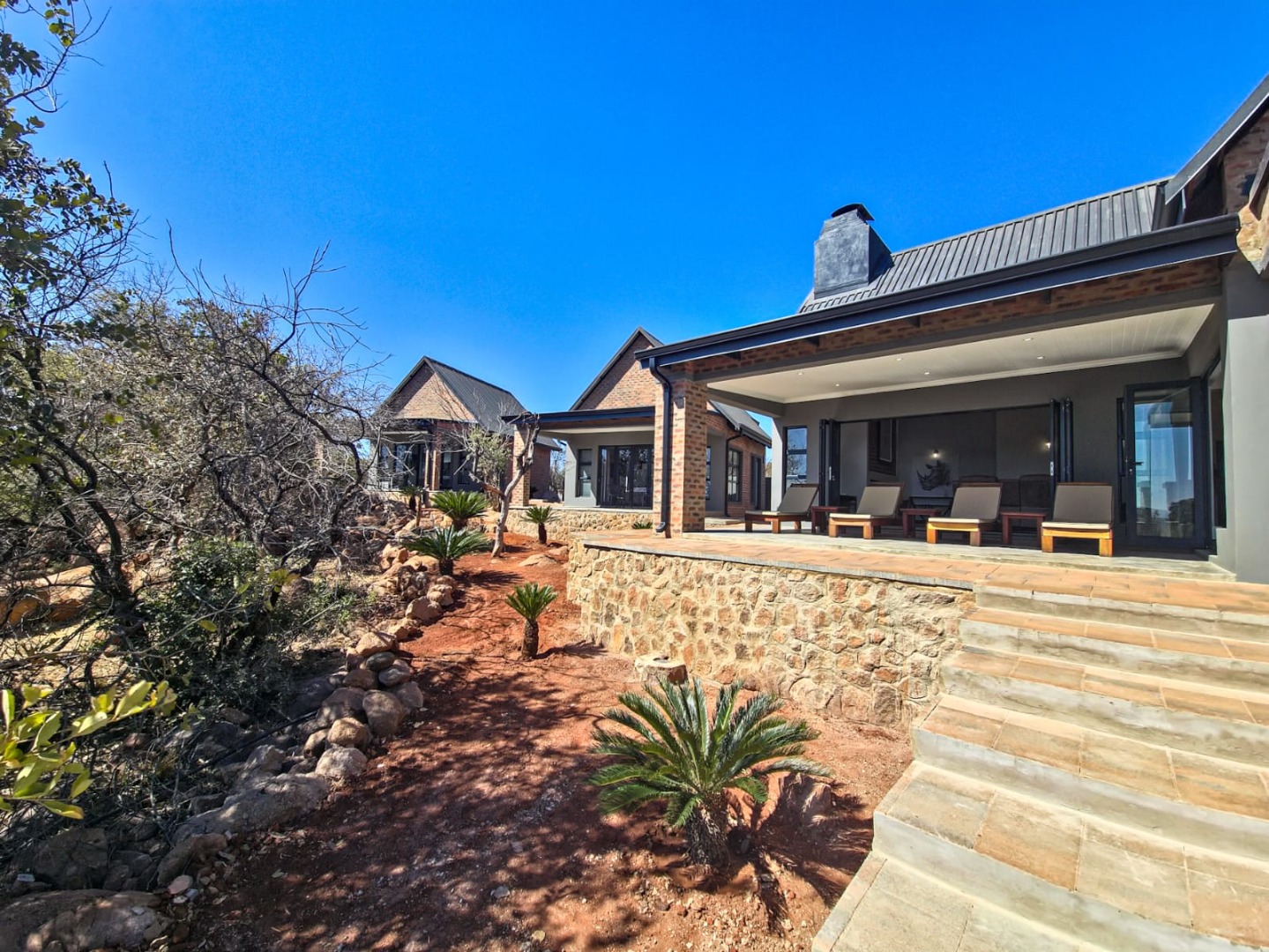 Discover an exceptional bushveld retreat within the prestigious Mabalingwe Nature Reserve, Bela Bela, South Africa. This modern, furnished residence, spanning 561 square metres on an expansive 9,658,601 square metre erf, offers a harmonious blend of contemporary design and natural serenity. The property immediately impresses with its striking brick architecture, distinctive dark metal roof, and terraced landscaping, seamlessly integrating into the arid yet beautiful surroundings.