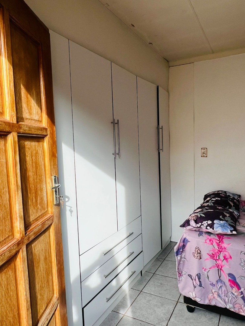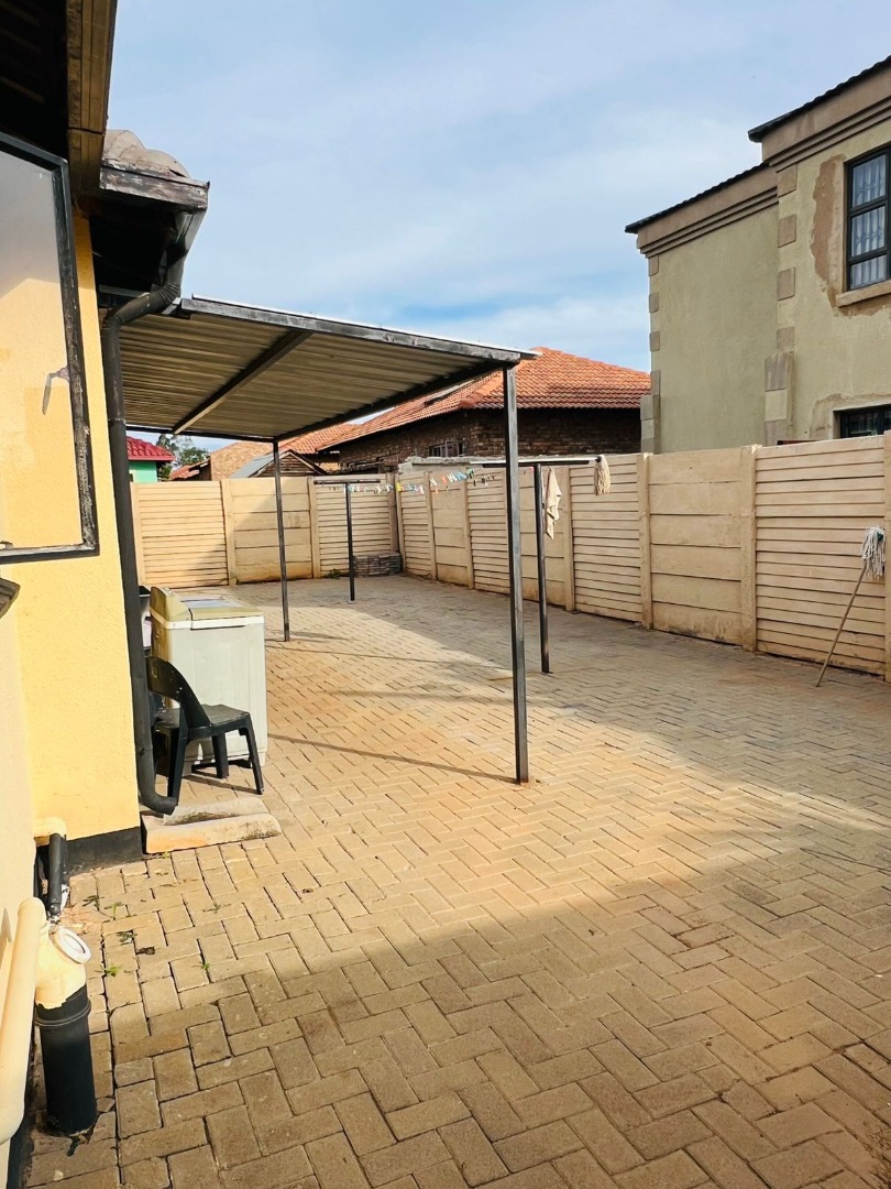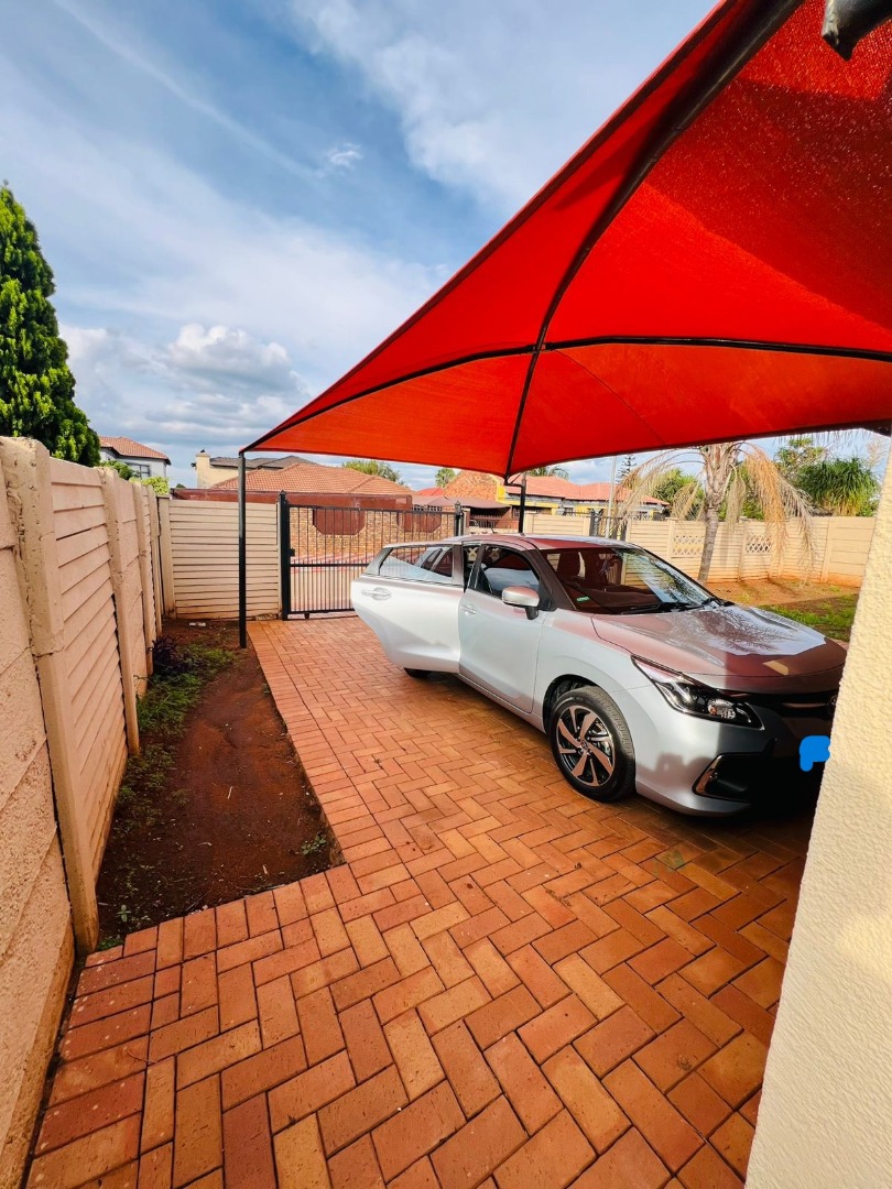 The property boasts a well-maintained exterior with a paved driveway leading to a convenient shade net carport, offering protection for one vehicle. Security is a priority, with a sliding security gate at the entrance and security bars fitted on windows, enhancing peace of mind for residents. An additional metal security gate further secures the main entrance.