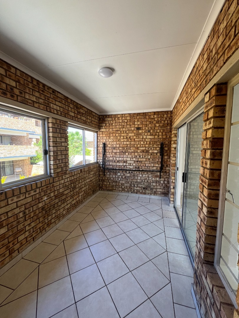 The property includes a comfortable lounge area. Enhancing the living experience are versatile enclosed spaces: an enclosed balcony or sunroom, providing additional natural light, and a dedicated braai room with a built-in barbecue, ideal for year-round entertaining. Practical storage solutions are also integrated within the unit.