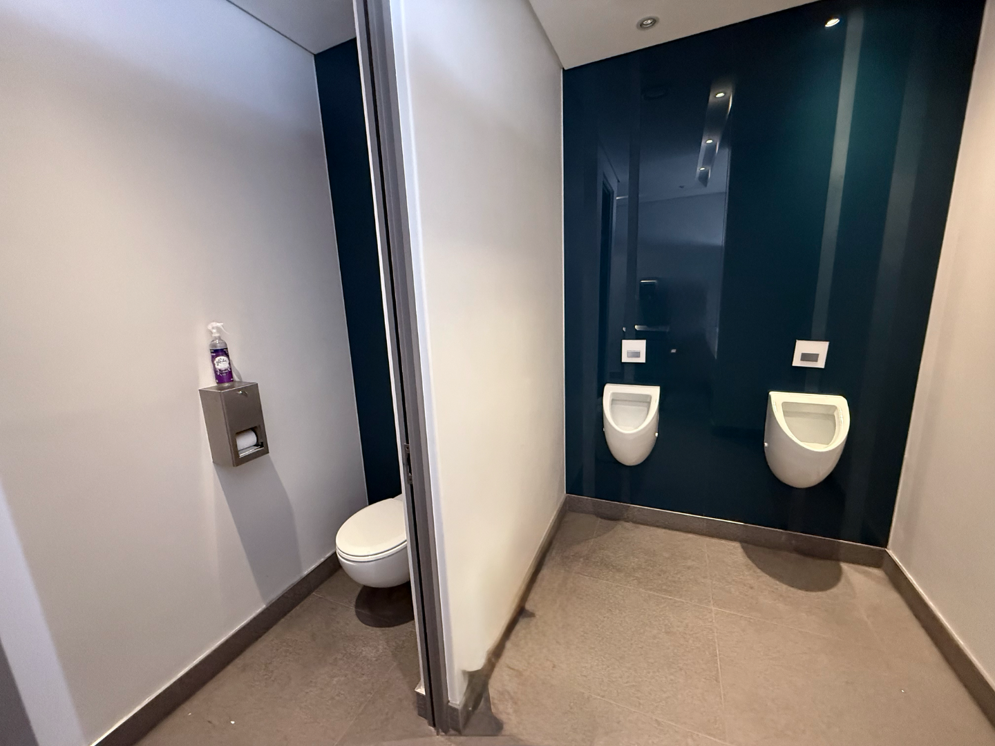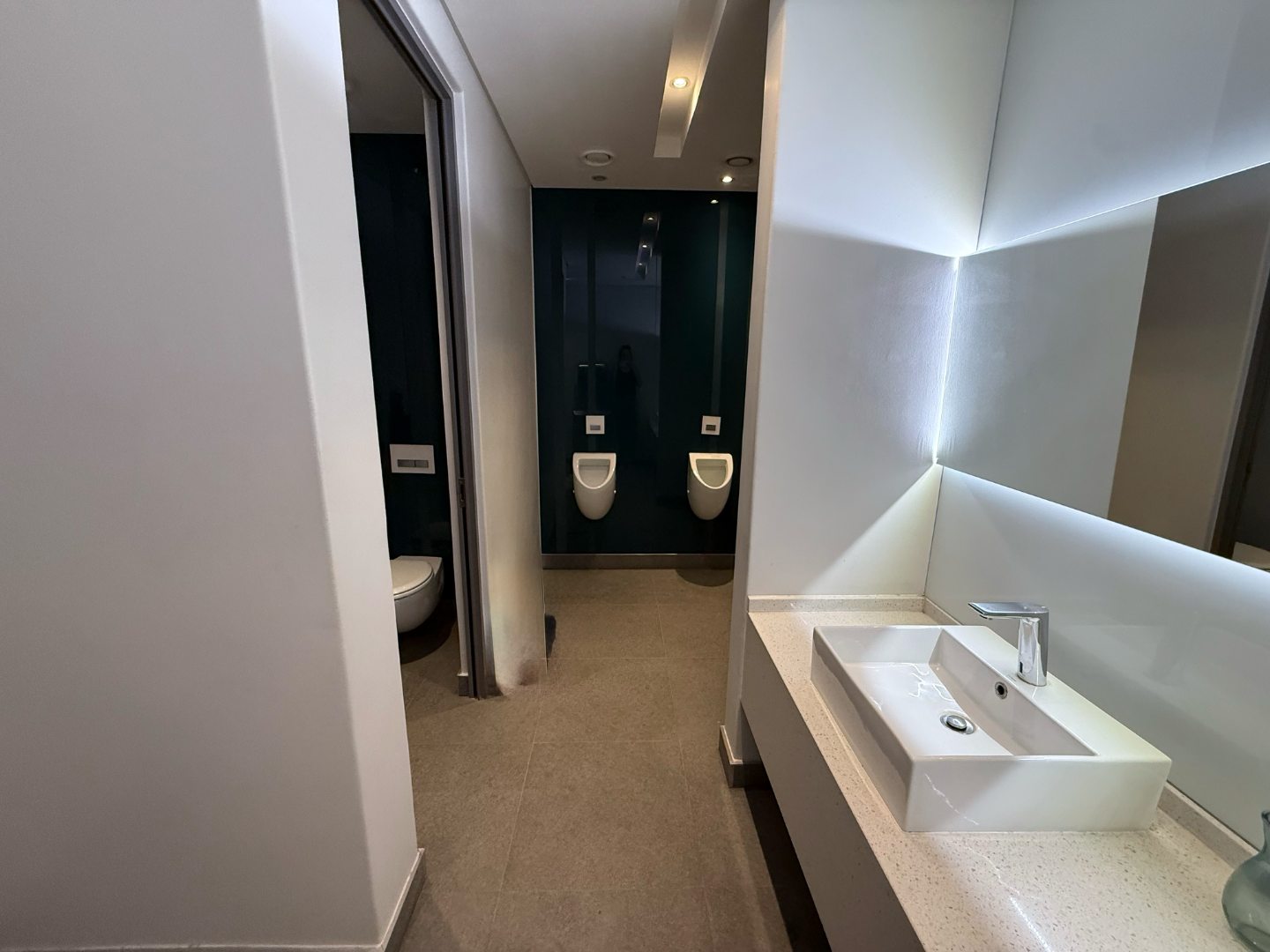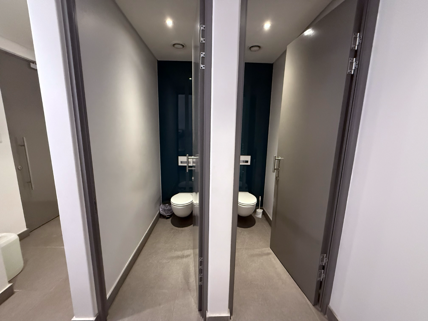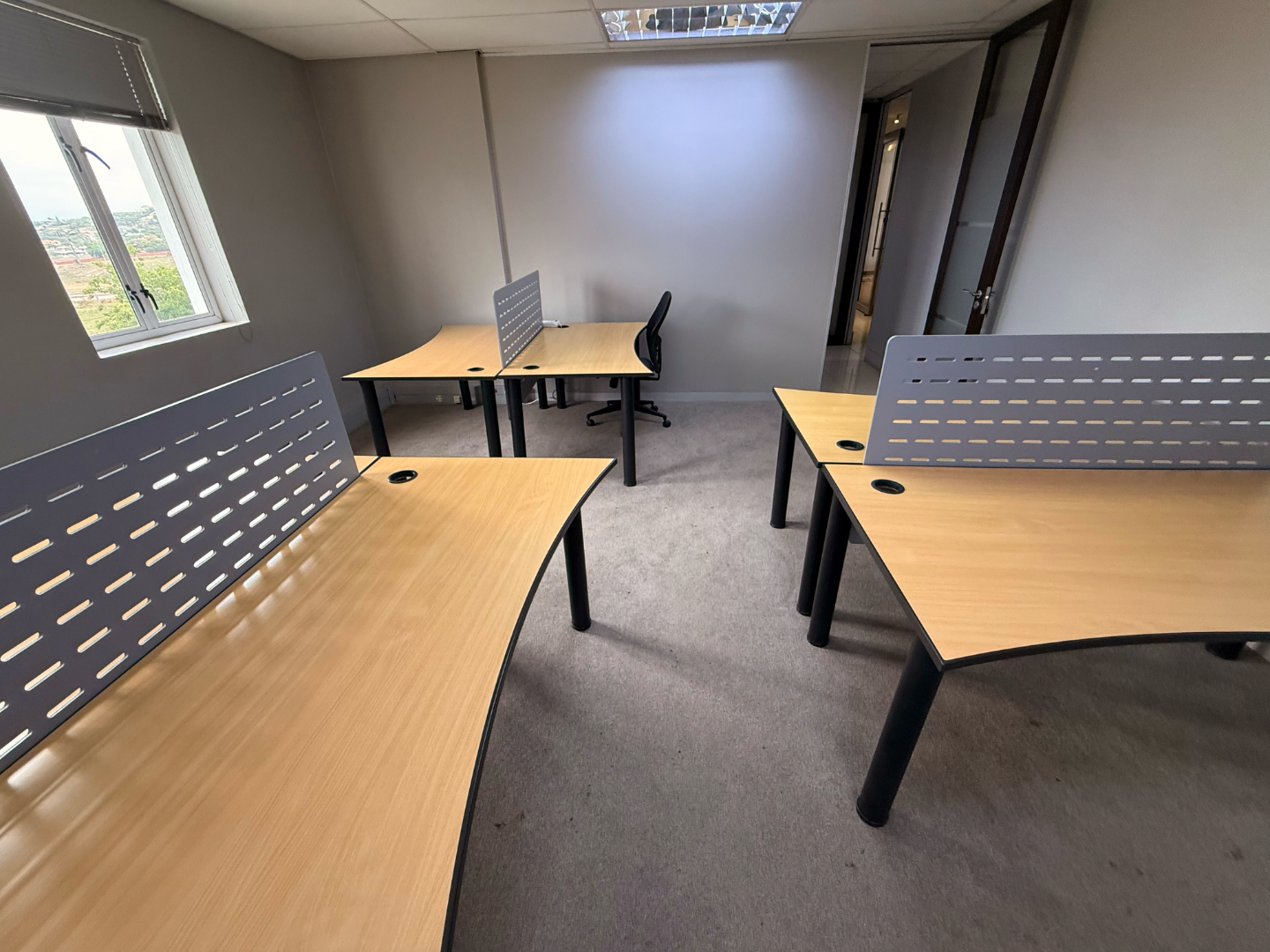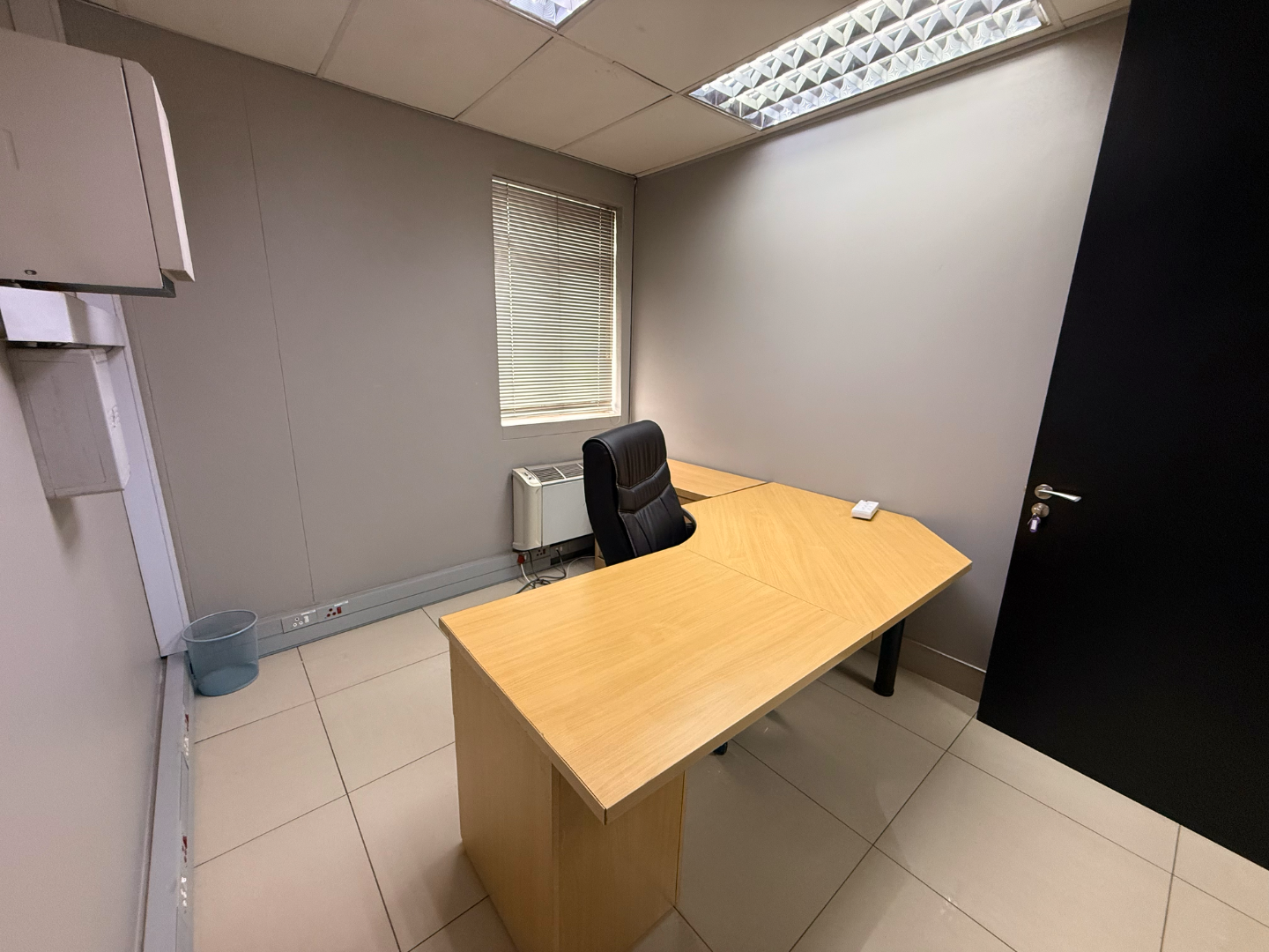 Inside, the property features bright and contemporary common areas, including a welcoming reception or lounge space. These areas are characterized by large arched windows that flood the interior with natural light, elegant glass railings, and stylish wall finishes, including wood paneling. The layout offers a combination of open and segmented spaces, with private offices providing dedicated work environments. Each office benefits from natural light and is equipped with functional L-shaped desks, making it suitable for a variety of business operations. The premises include two well-appointed bathrooms and a functional kitchen, catering to daily operational needs.