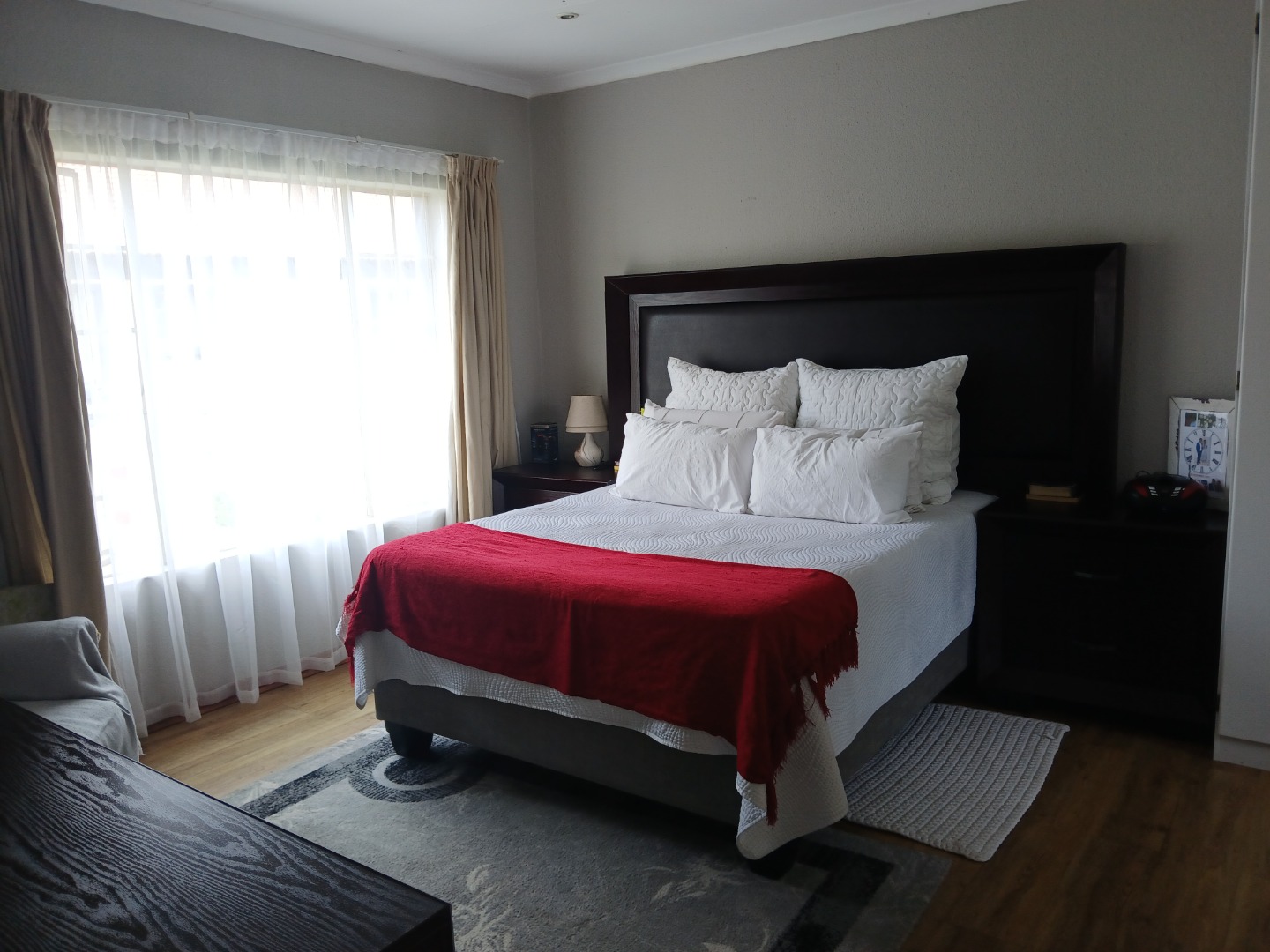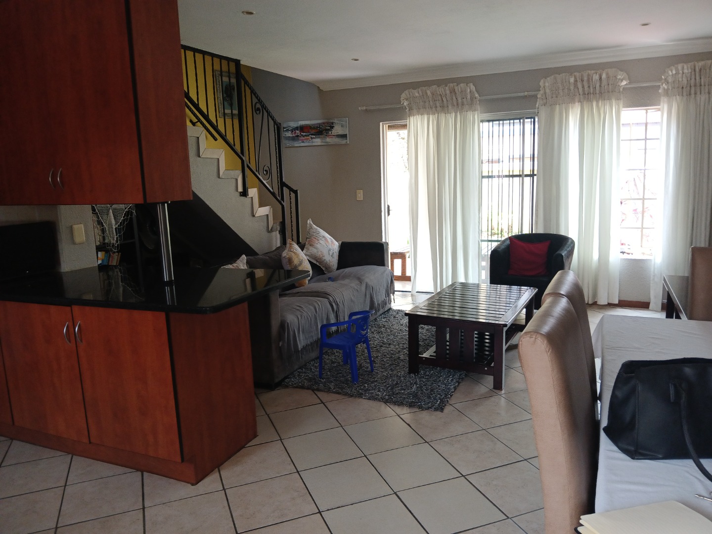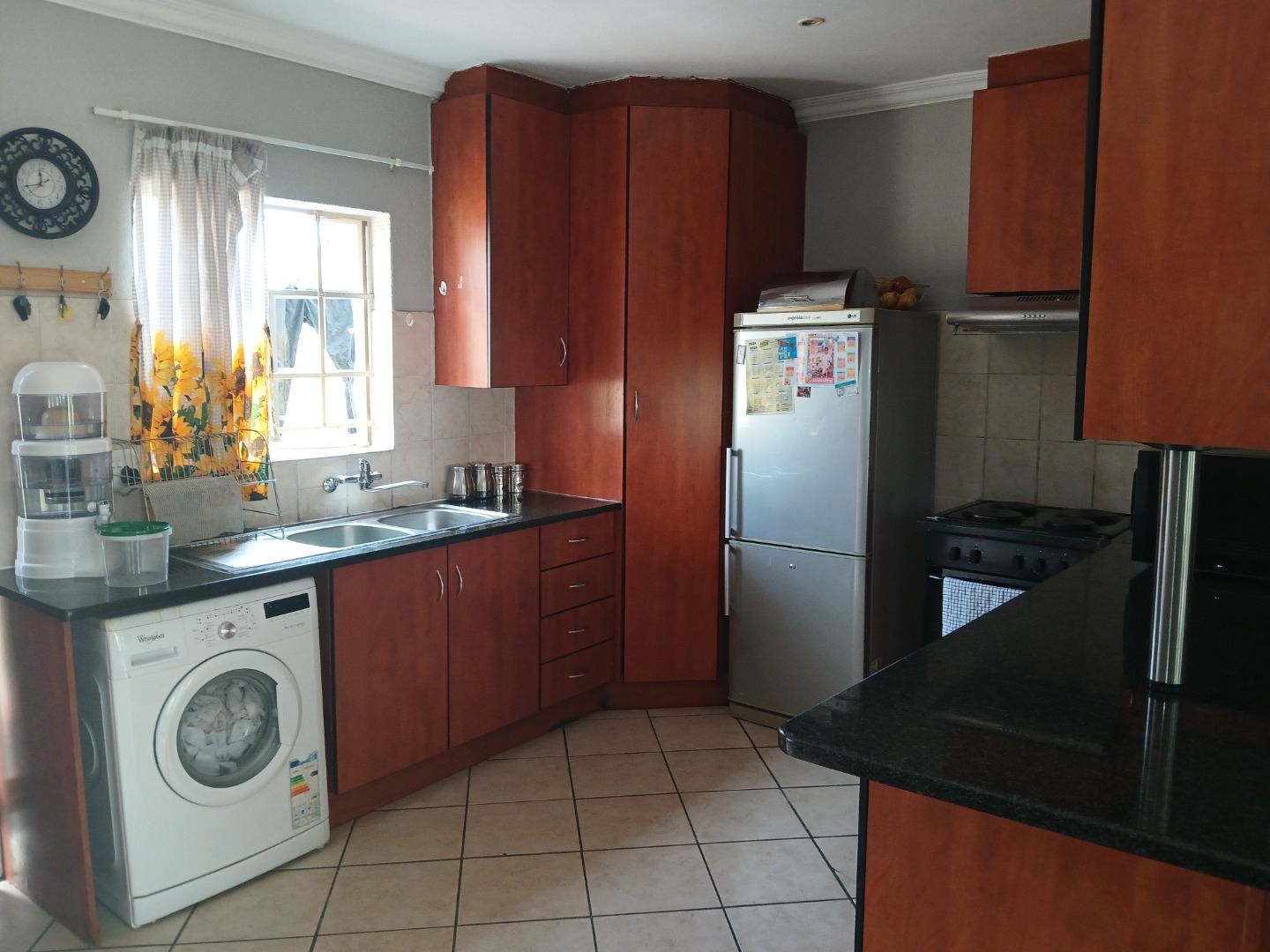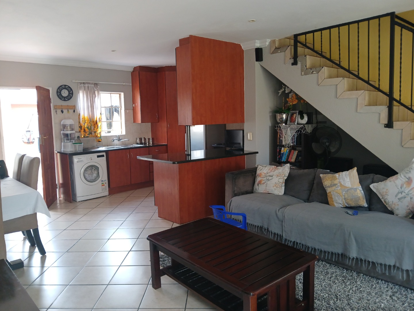 Open plan kitchen - with granite tops, pantry and ample cupboards - and lounge flowing onto a covered stoep with built-in braai;