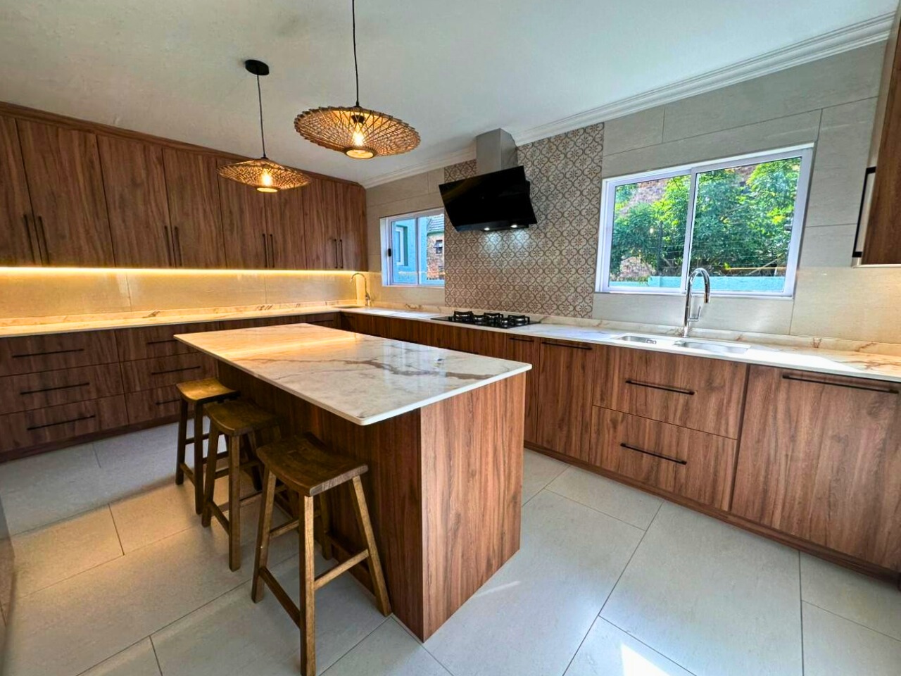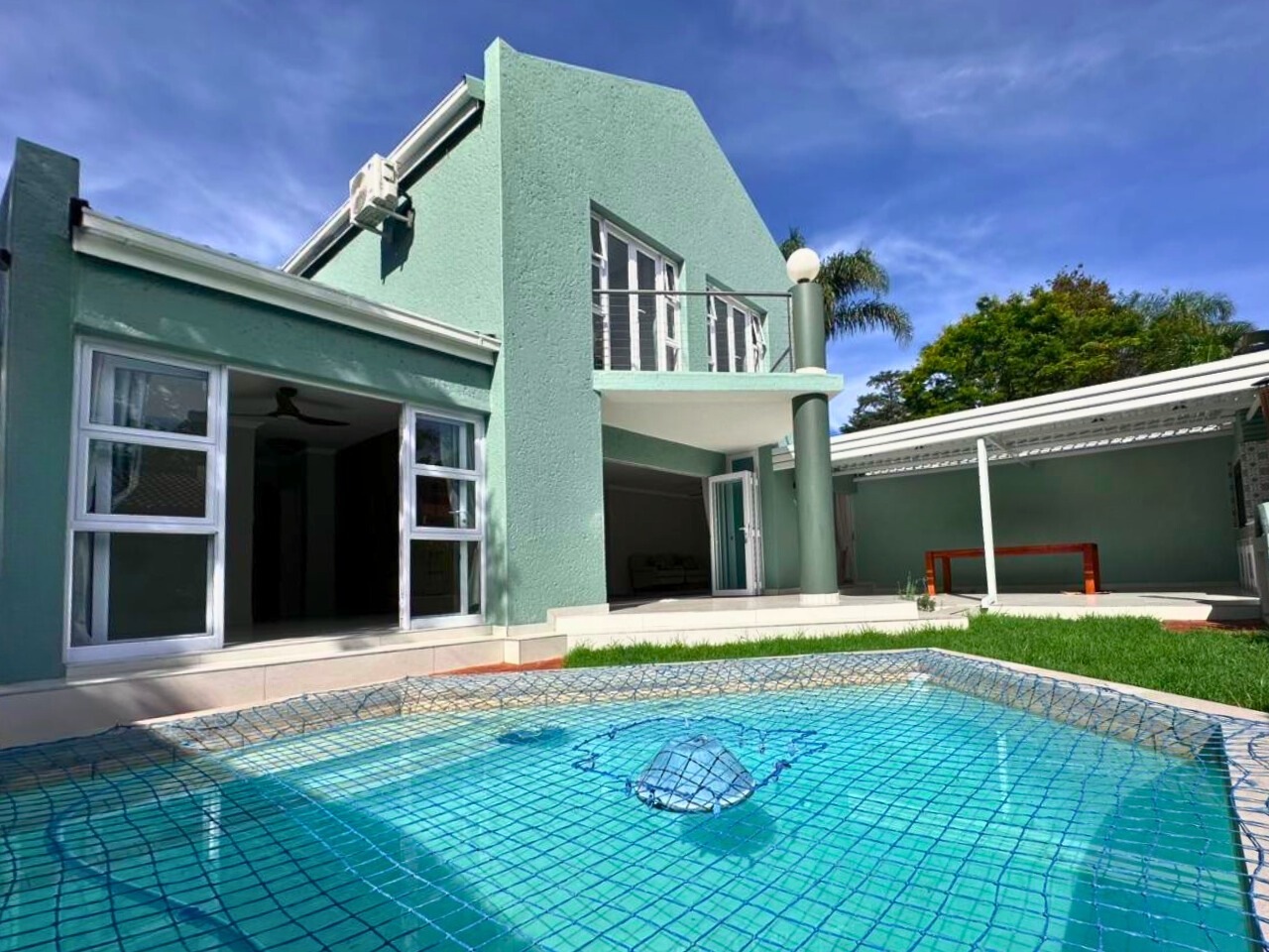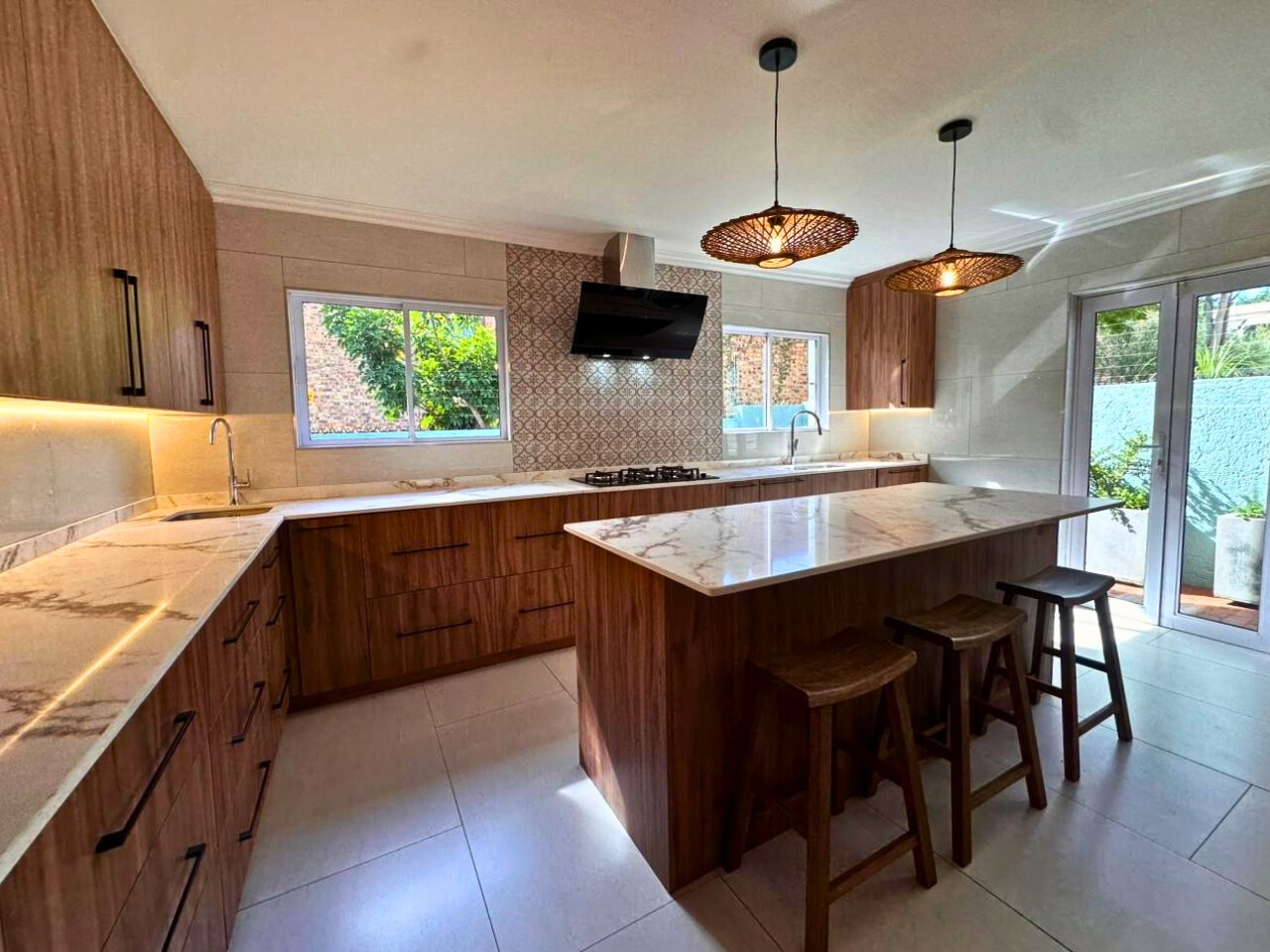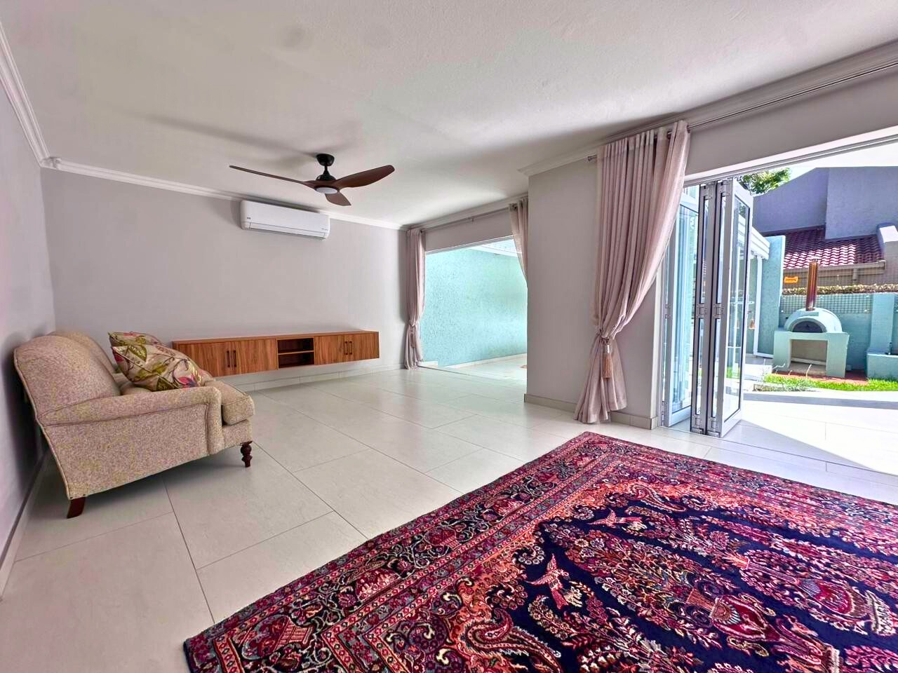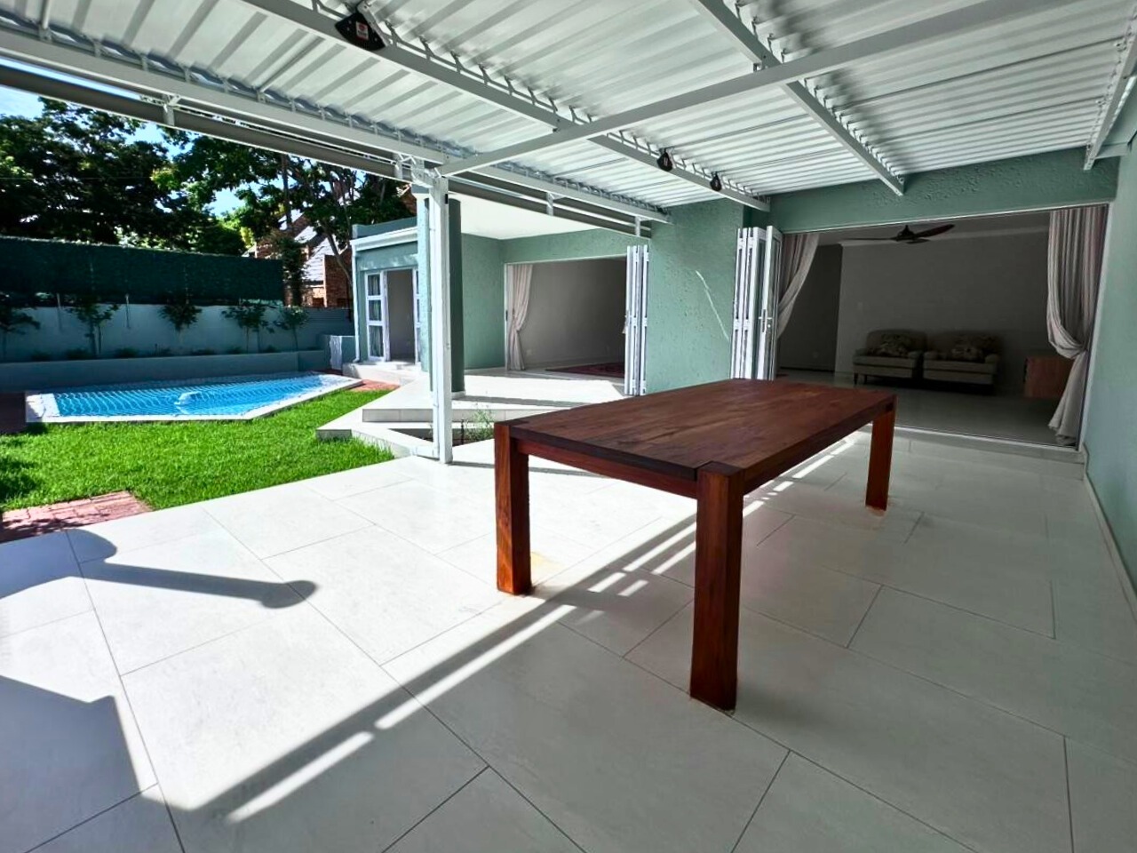 Every finish is new. Clean lines, light tiled floors and a calm, beach house feel run throughout the space. The open-plan living area opens fully with bi-fold doors to a covered patio, built-in braai, pizza oven, landscaped garden and private swimming pool. It feels tucked away and quiet.