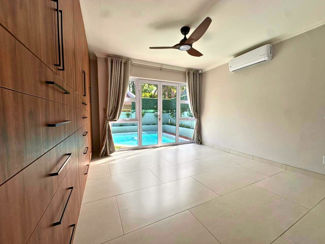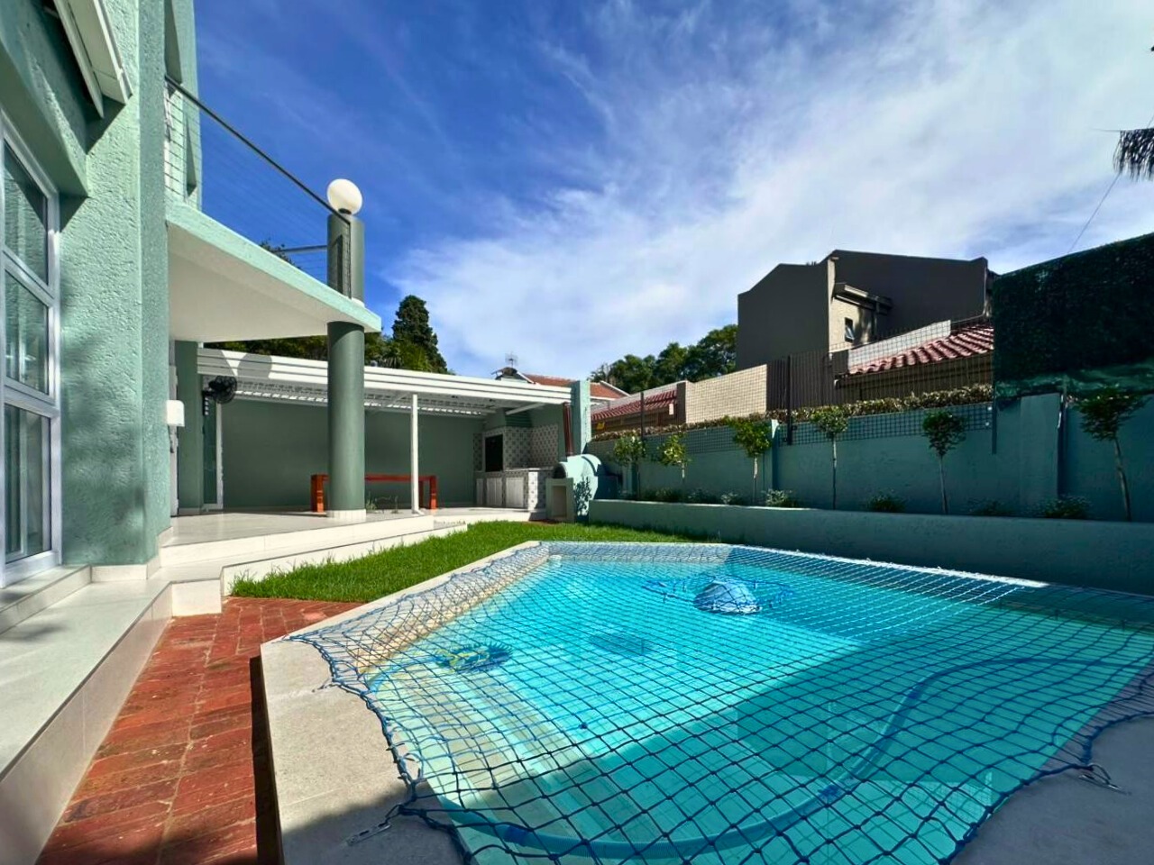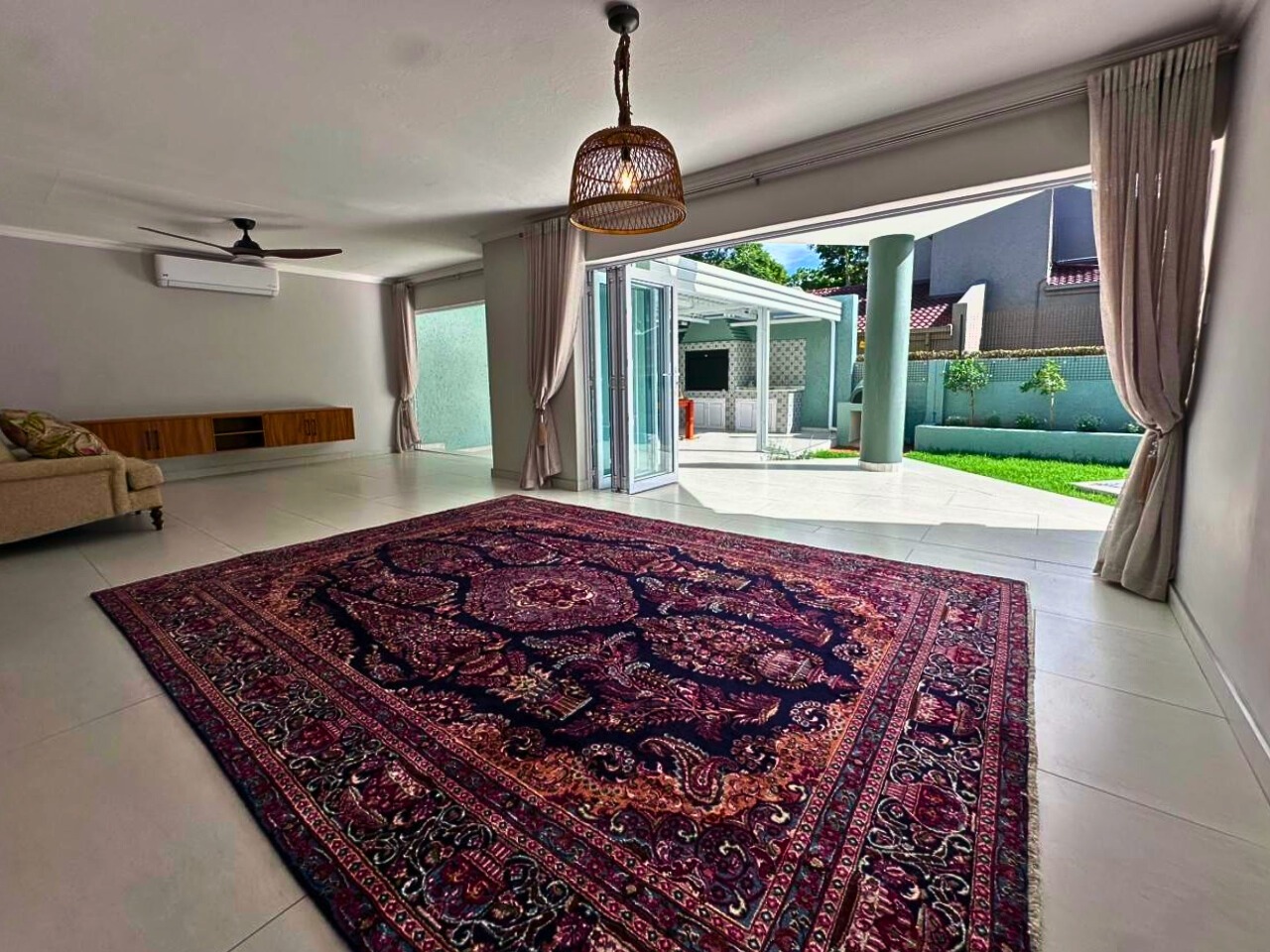 Every finish is new. Clean lines, light tiled floors and a calm, beach house feel run throughout the space. The open-plan living area opens fully with bi-fold doors to a covered patio, built-in braai, pizza oven, landscaped garden and private swimming pool. It feels tucked away and quiet.