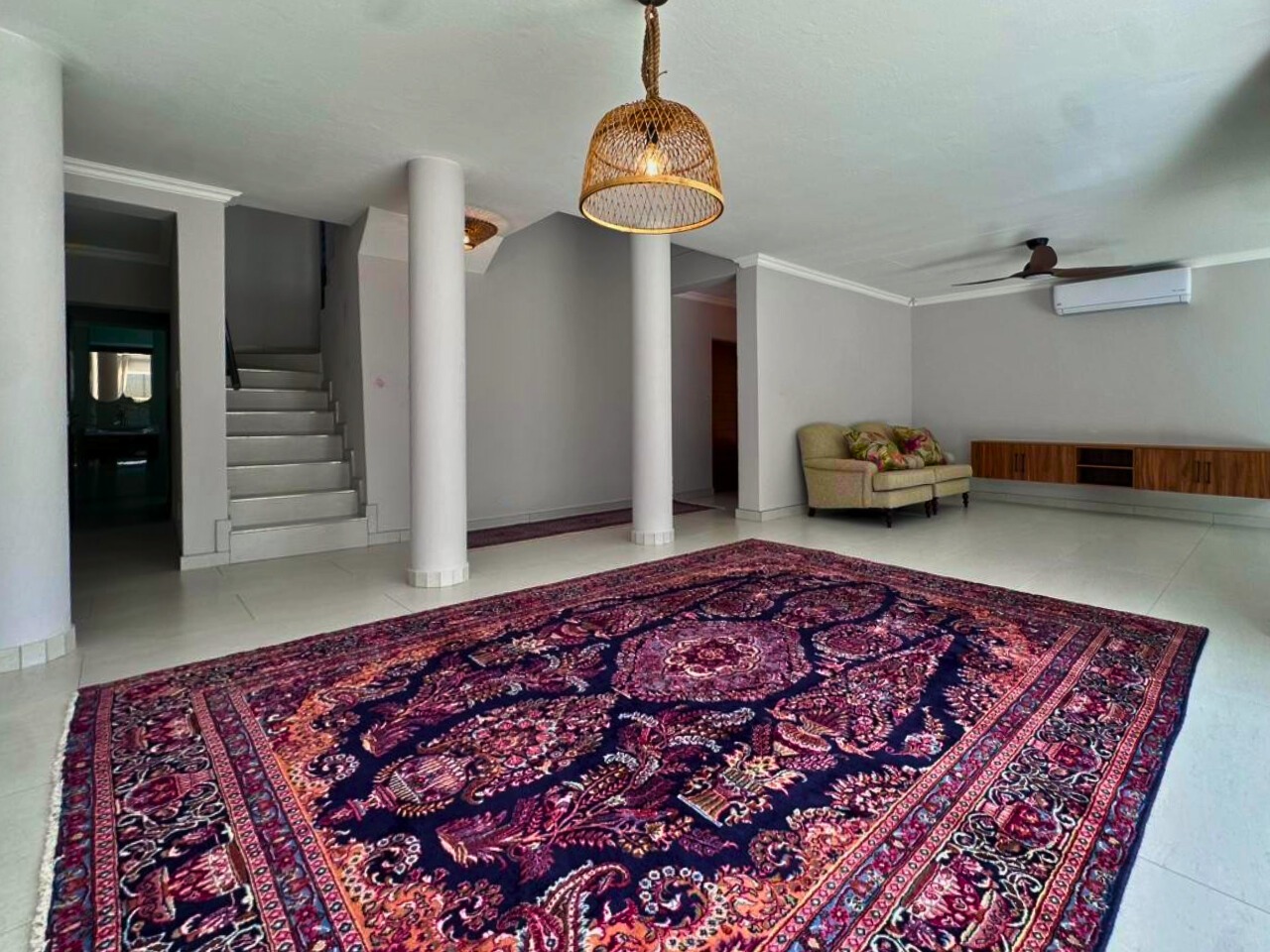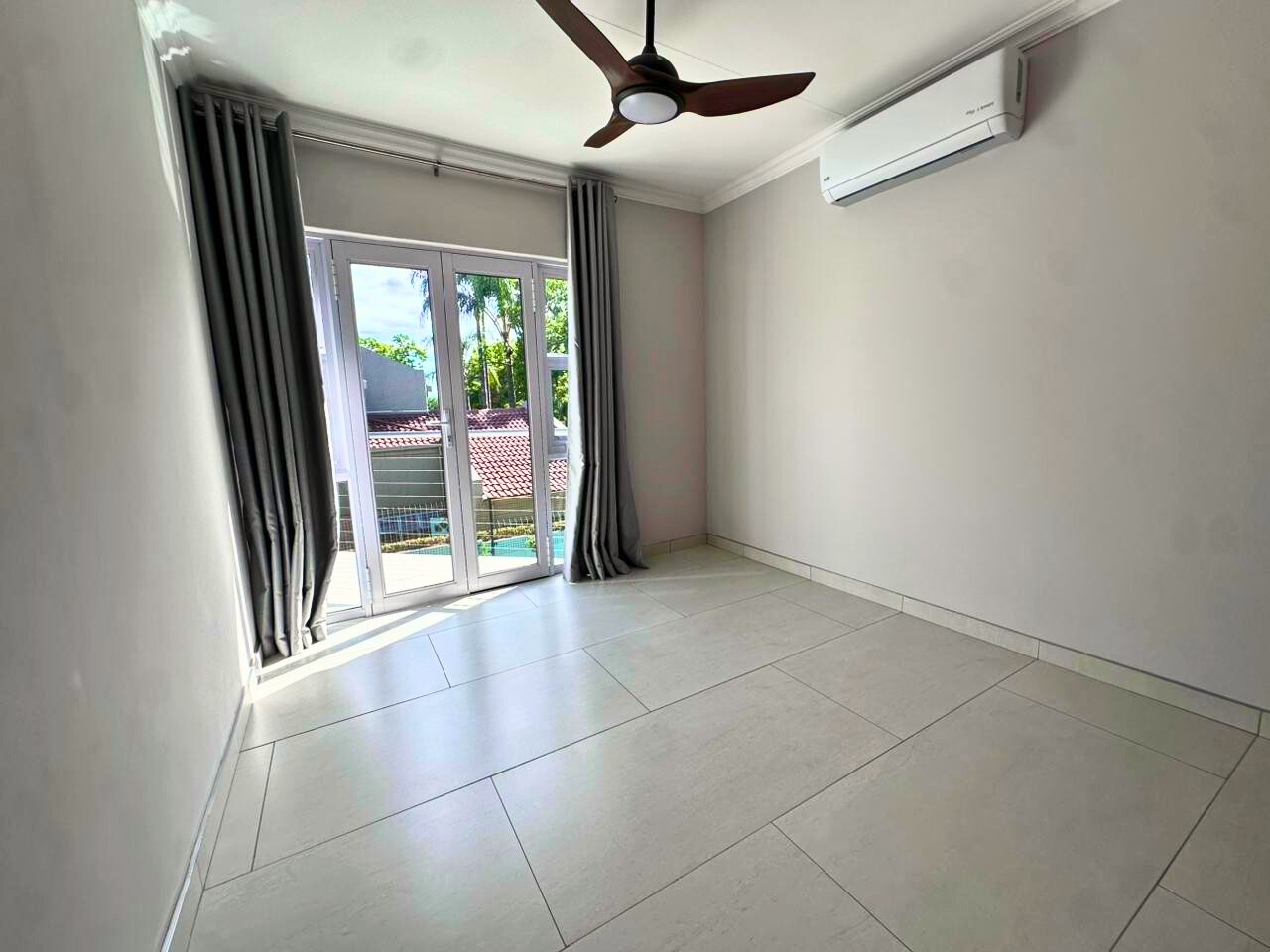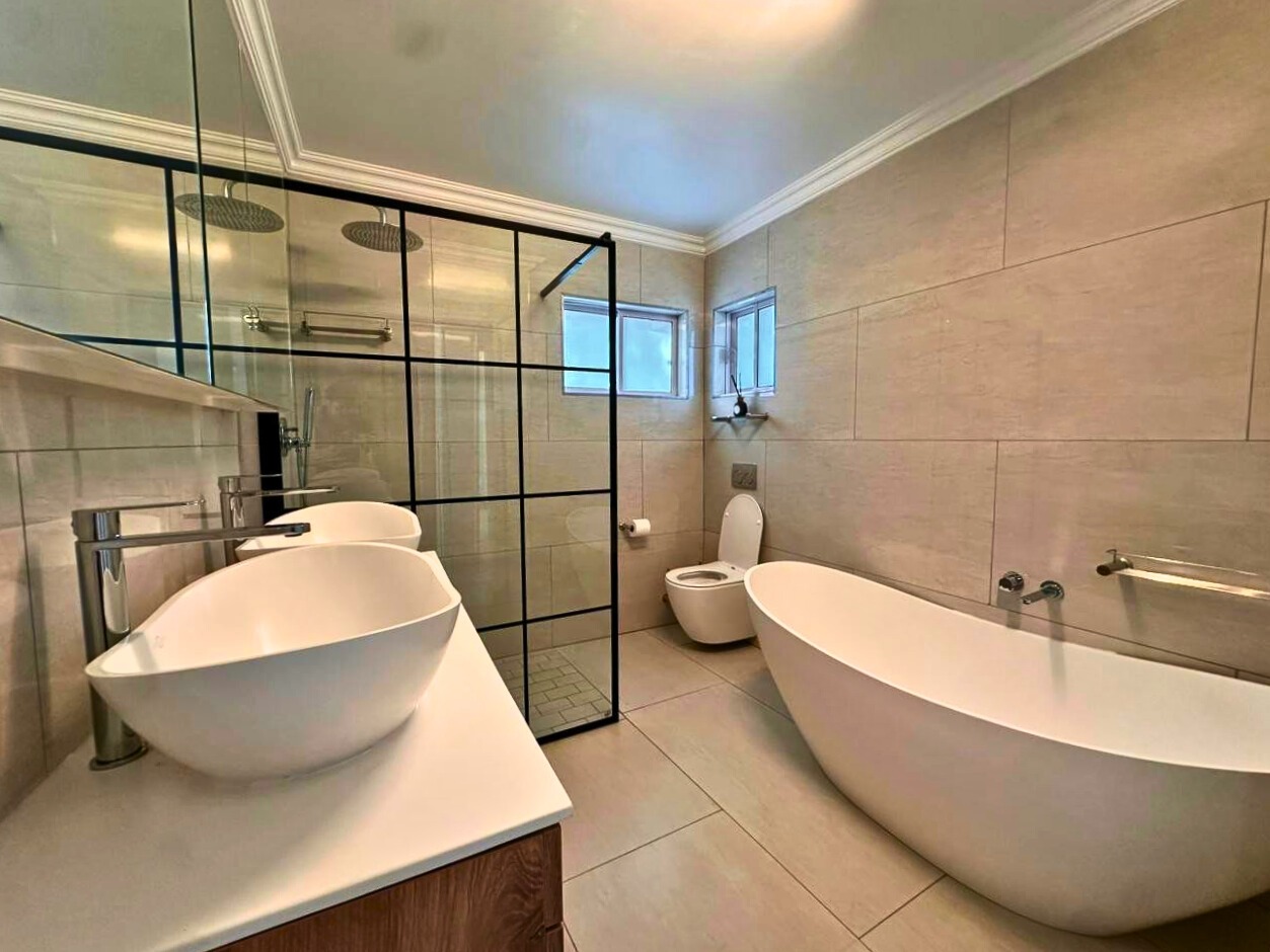Every finish is new. Clean lines, light tiled floors and a calm, beach house feel run throughout the space. The open-plan living area opens fully with bi-fold doors to a covered patio, built-in braai, pizza oven, landscaped garden and private swimming pool. It feels tucked away and quiet.