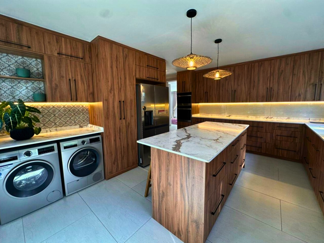 The kitchen is entirely redone with wood-grain cabinetry, marble tops and a central island. Integrated fridge, double oven, washer and dryer are included.