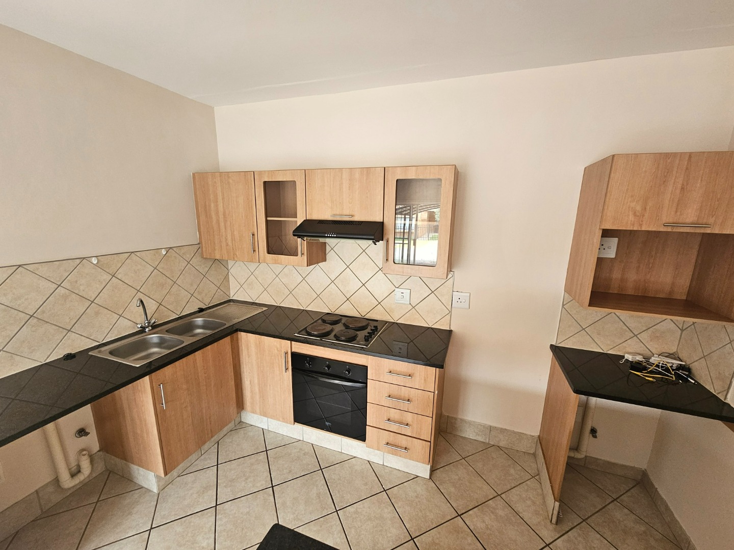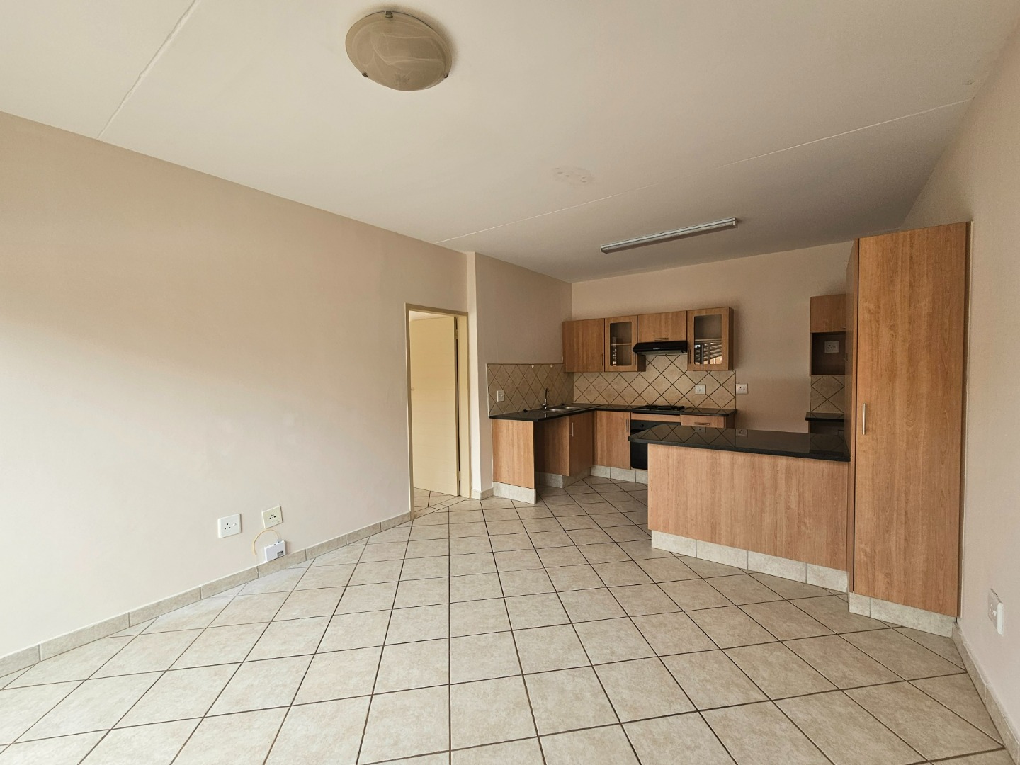 Discover modern living in this well-appointed 1-bedroom, 1-bathroom apartment available for rent in the secure Elarduspark complex, Pretoria. Spanning 66 sqm, this unit features an inviting open-plan layout that seamlessly connects the living area with a contemporary kitchen. The kitchen is equipped with sleek light wood cabinetry, dark countertops, a built-in oven, hob, extractor fan, and a convenient breakfast bar, all complemented by durable tiled flooring throughout the main living spaces.