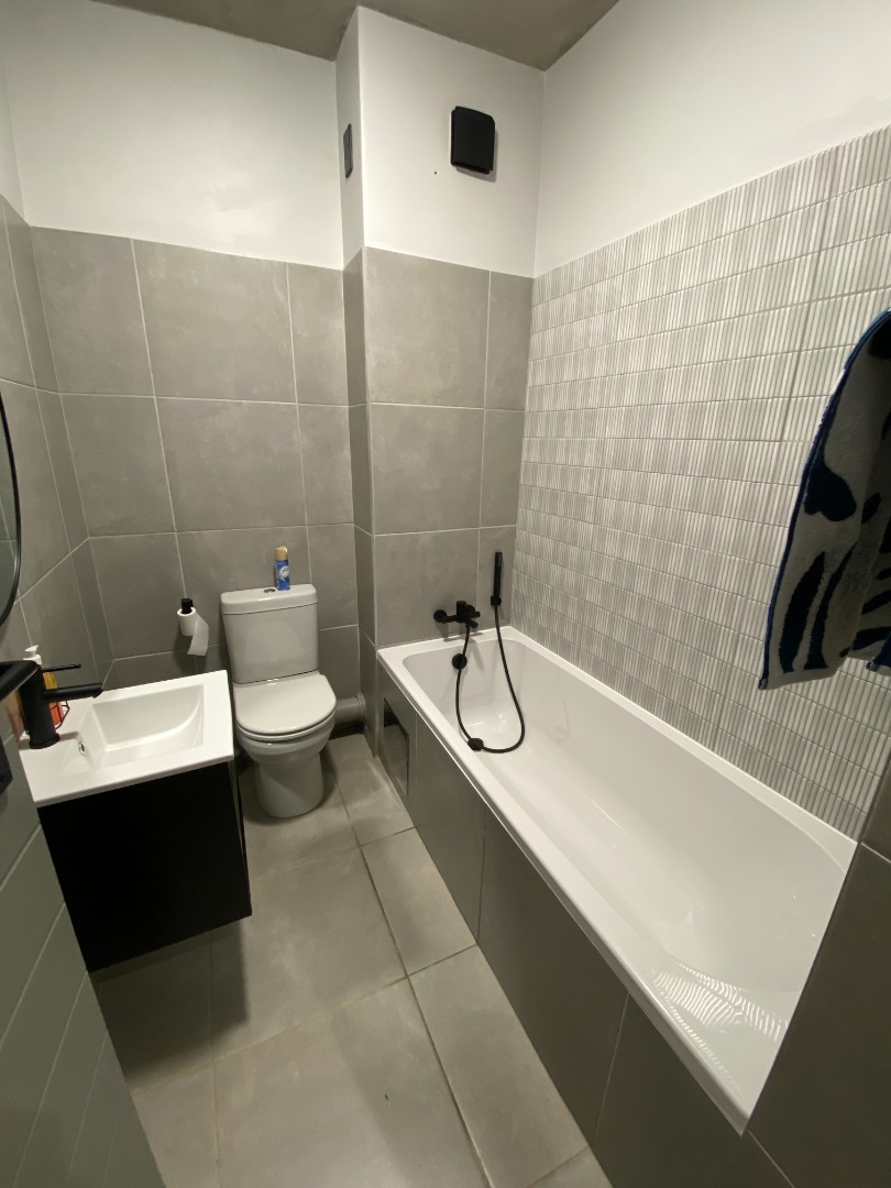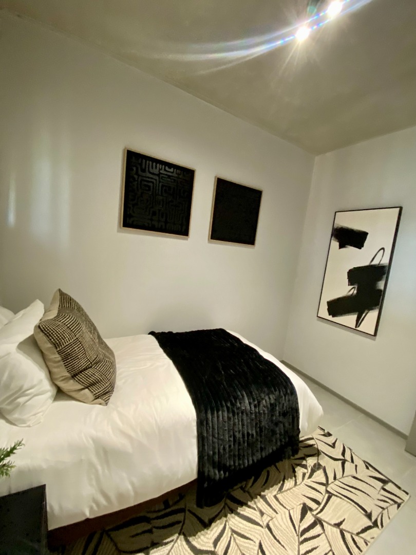 The second bedroom also features built-in cupboards and excellent ventilation, offering comfort and practicality. Both bedrooms are finished with stylish black light fittings and plug covers, adding a bold, modern touch throughout.