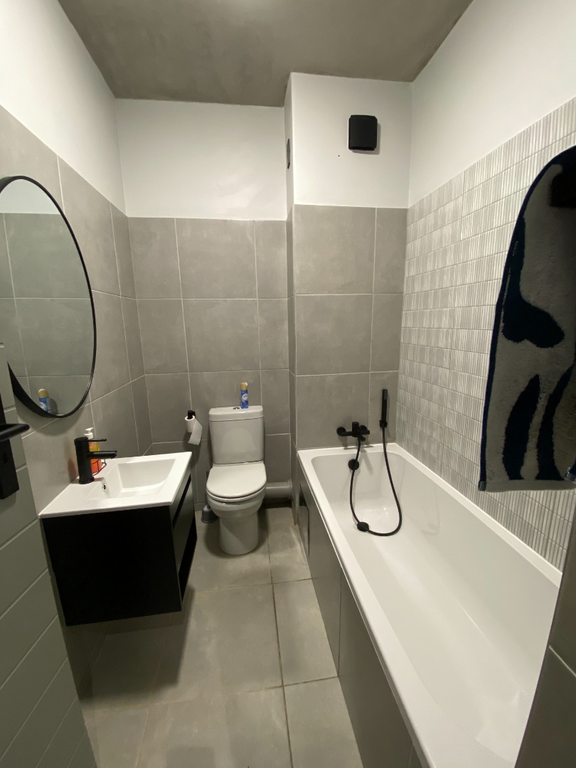 The second bathroom is beautifully designed and includes a bathtub, basin, and toilet, ideal for guests or family use.