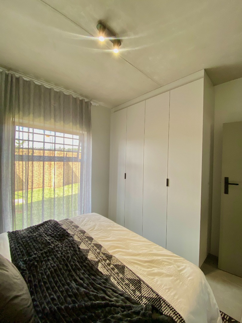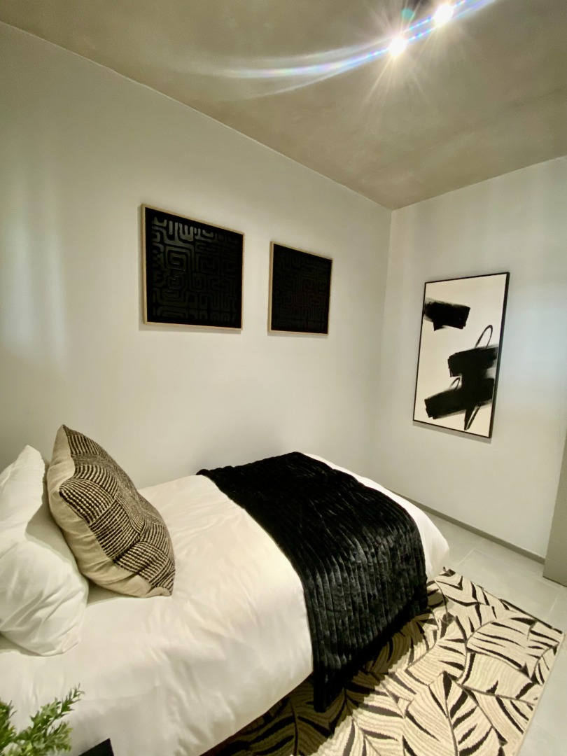 The second bedroom also features built-in cupboards and excellent ventilation, offering comfort and practicality. Both bedrooms are finished with stylish black light fittings and plug covers, adding a bold, modern touch throughout.