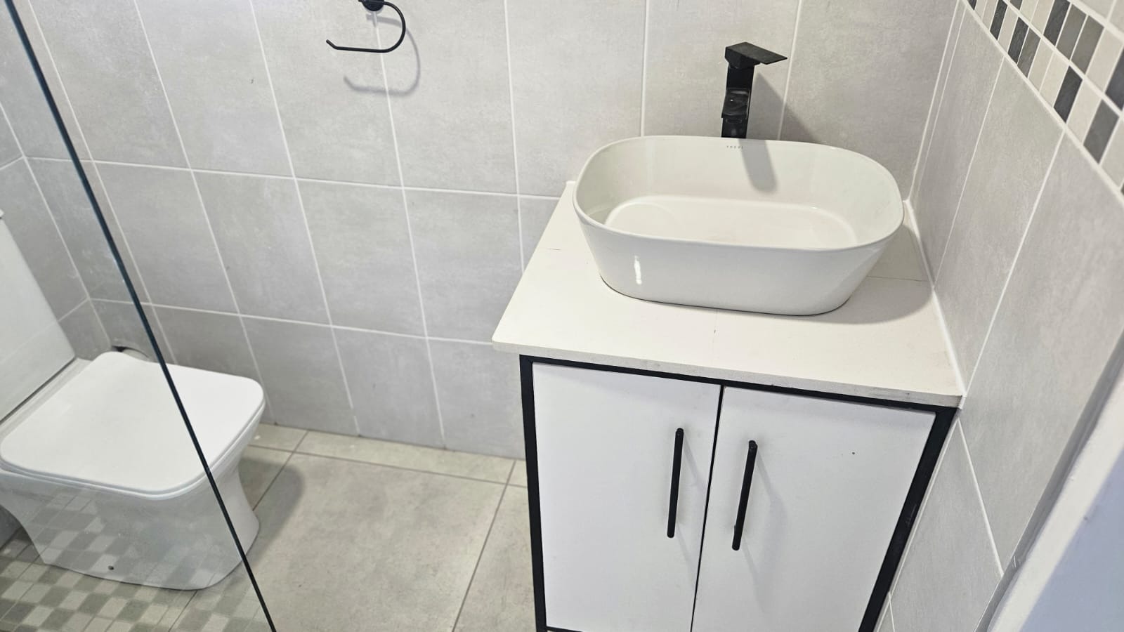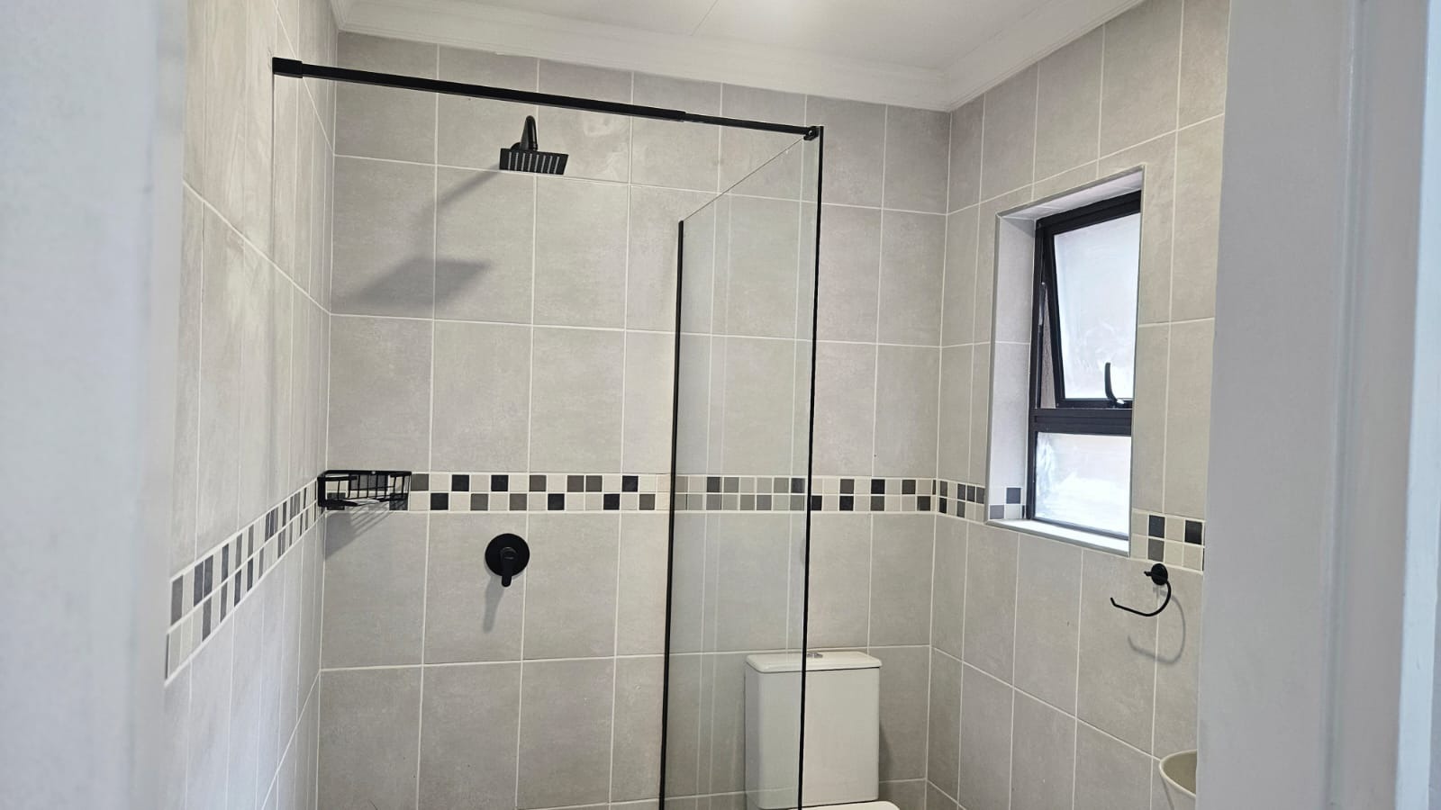 The home features two tiled bedrooms and a spacious bathroom, thoughtfully designed to accommodate a top-loader washing machine.