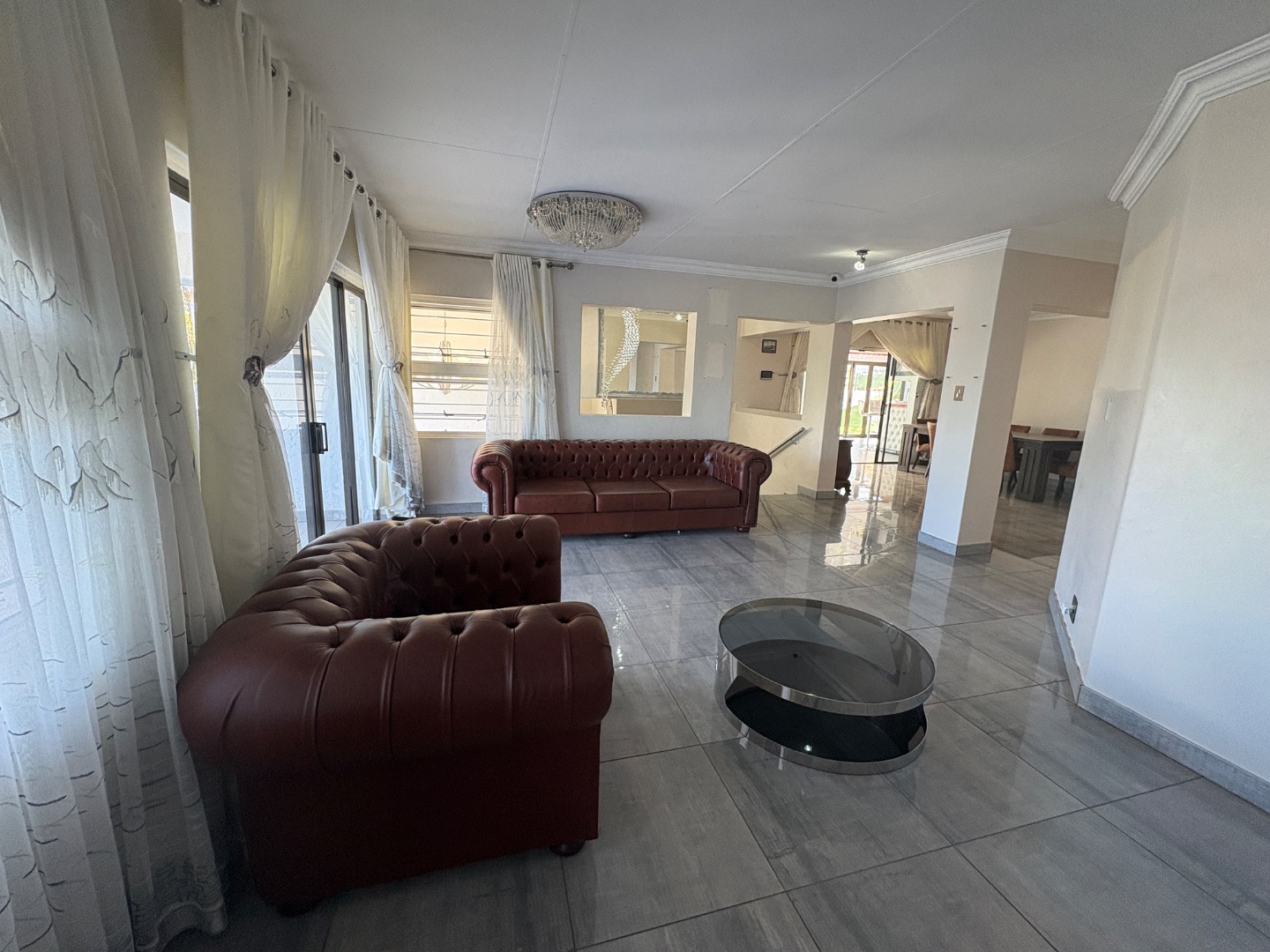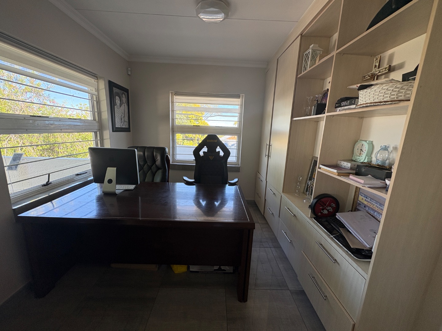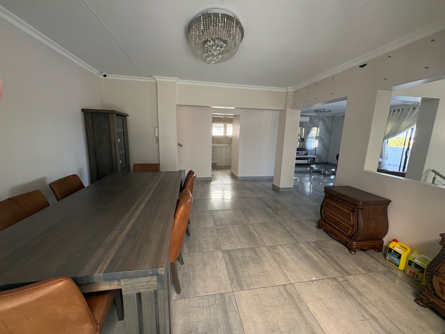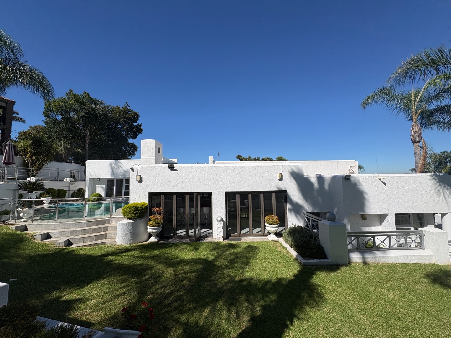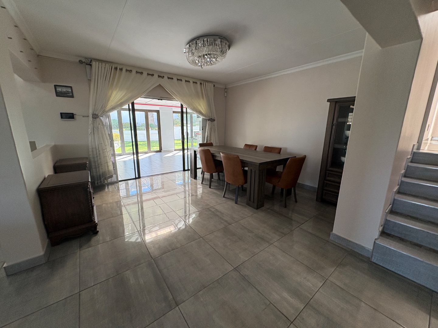 The spacious and sunny living areas open out to the large covered patio with a built-in braai overlooking the beautiful garden and with an additional deck area ideal for entertaining.