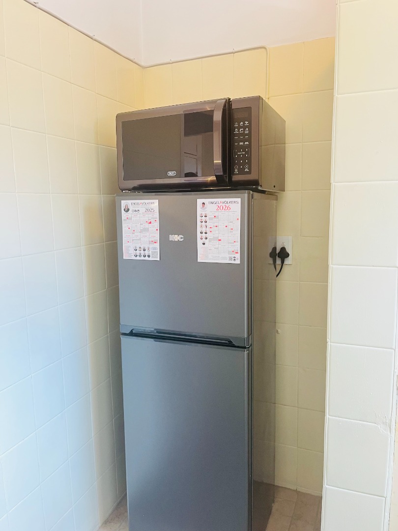 The compact kitchen with upper and lower cabinet storage. Essential appliances, including a refrigerator and microwave, are included, ensuring immediate occupancy. A functional pass-through window connects to a dining area, which also features built-in storage, maximizing space utility. The apartment includes one dedicated parking bay.