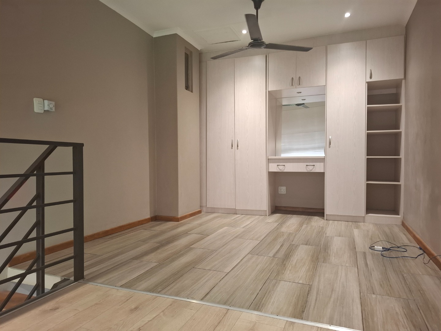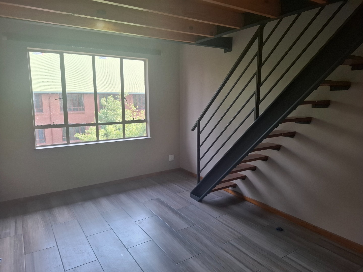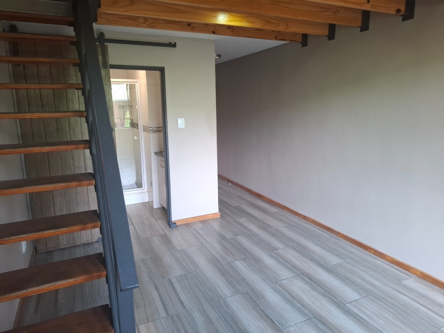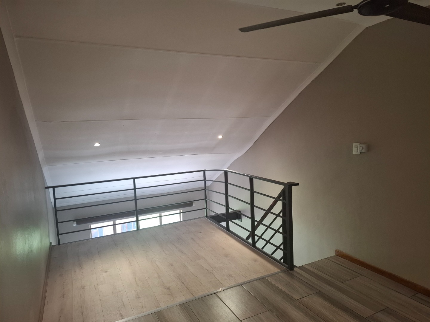 It features a kitchenette with a built in oven and a four plate stove. The open plan layout includes a contemporary staircase leading to a versatile loft area, complete with a ceiling fan and built-in wardrobes. A single bathroom with a shower serves the unit. This property includes one parking bay, 24-hour security and perimeter electric fencing. This bustling hub is known for its proximity to educational institutions and convenient amenities.