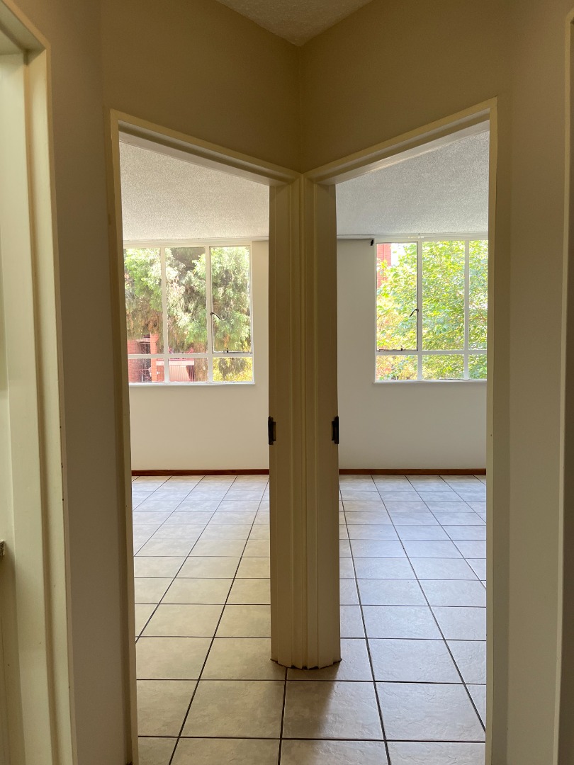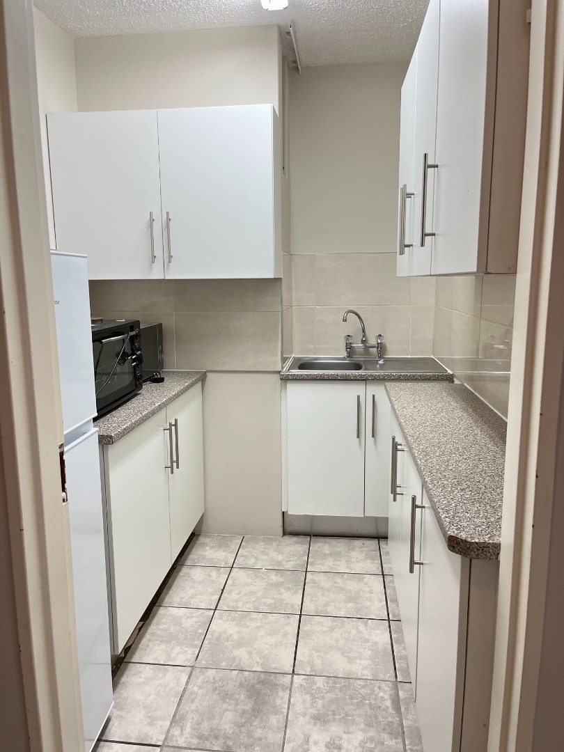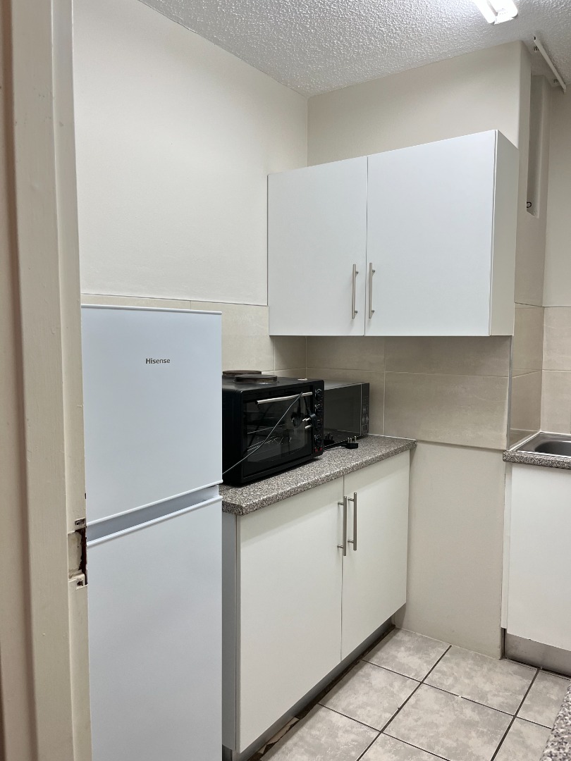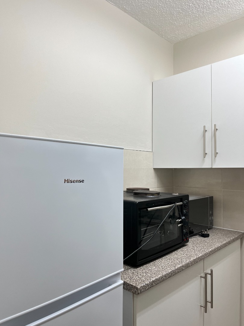 Discover this 2 bedroom, 1 bathroom apartment located in a secure complex in Hatfield, Pretoria. The unit features durable tiled flooring throughout and receives abundant natural light from large windows. The compact kitchen is equipped with modern white cabinets, a Hisense refrigerator, and essential tabletop appliances.