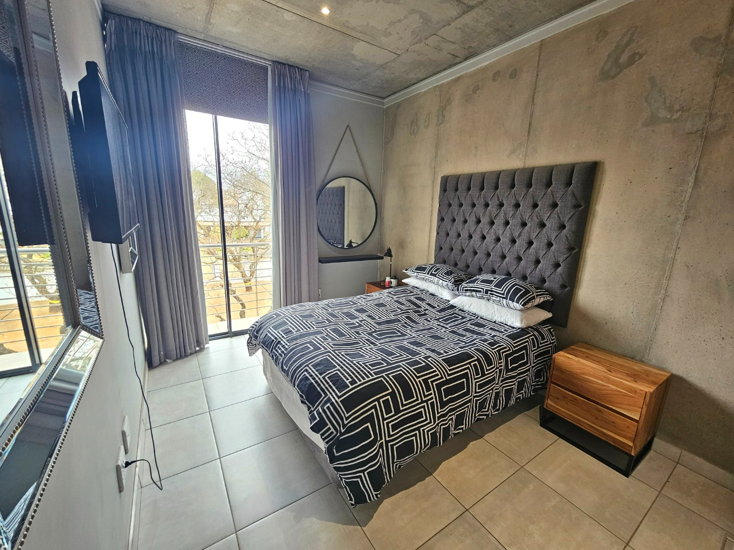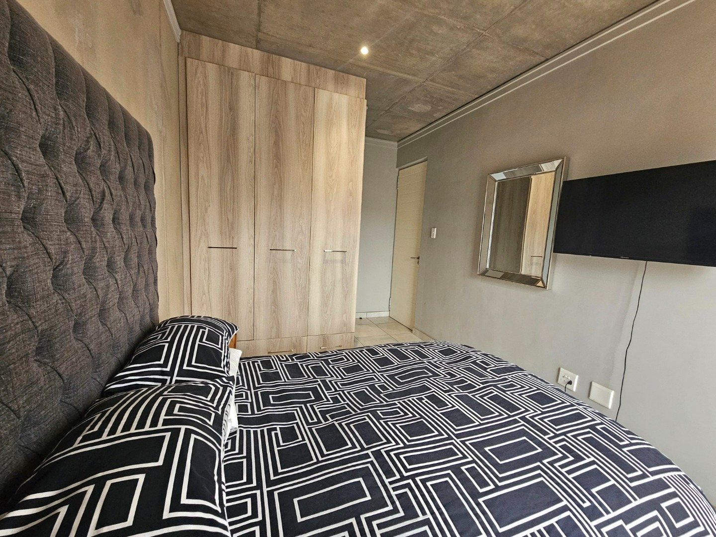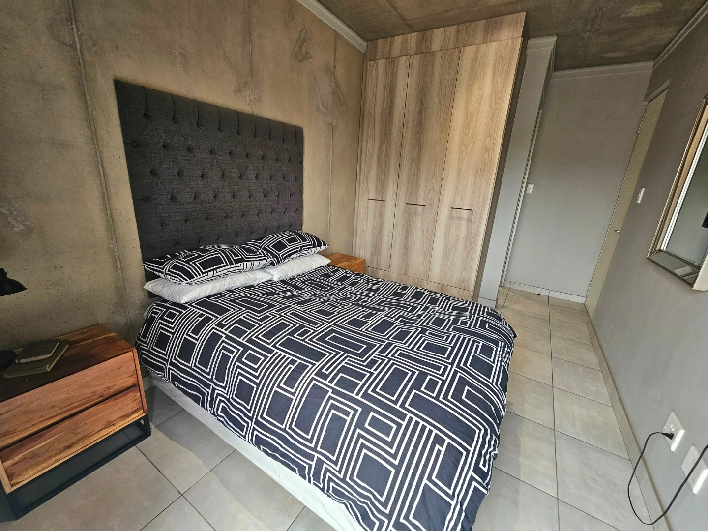 Both bedrooms are generously sized and offer the convenience of en-suite bathrooms, ensuring privacy and comfort. Each bedroom maintains the property's modern industrial aesthetic, complete with built-in wooden wardrobes for ample storage and large sliding doors that invite natural light. The bathrooms are equally impressive, showcasing a clean design with grey tiled walls, white fixtures, and unique black and white checkered shower floors within glass enclosures.
