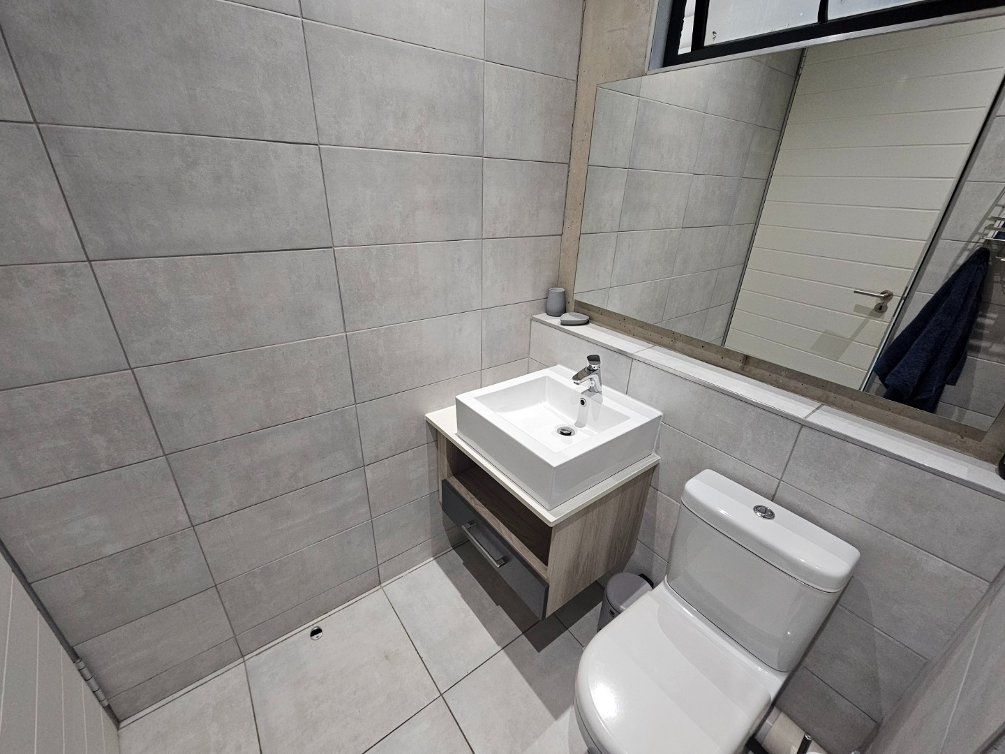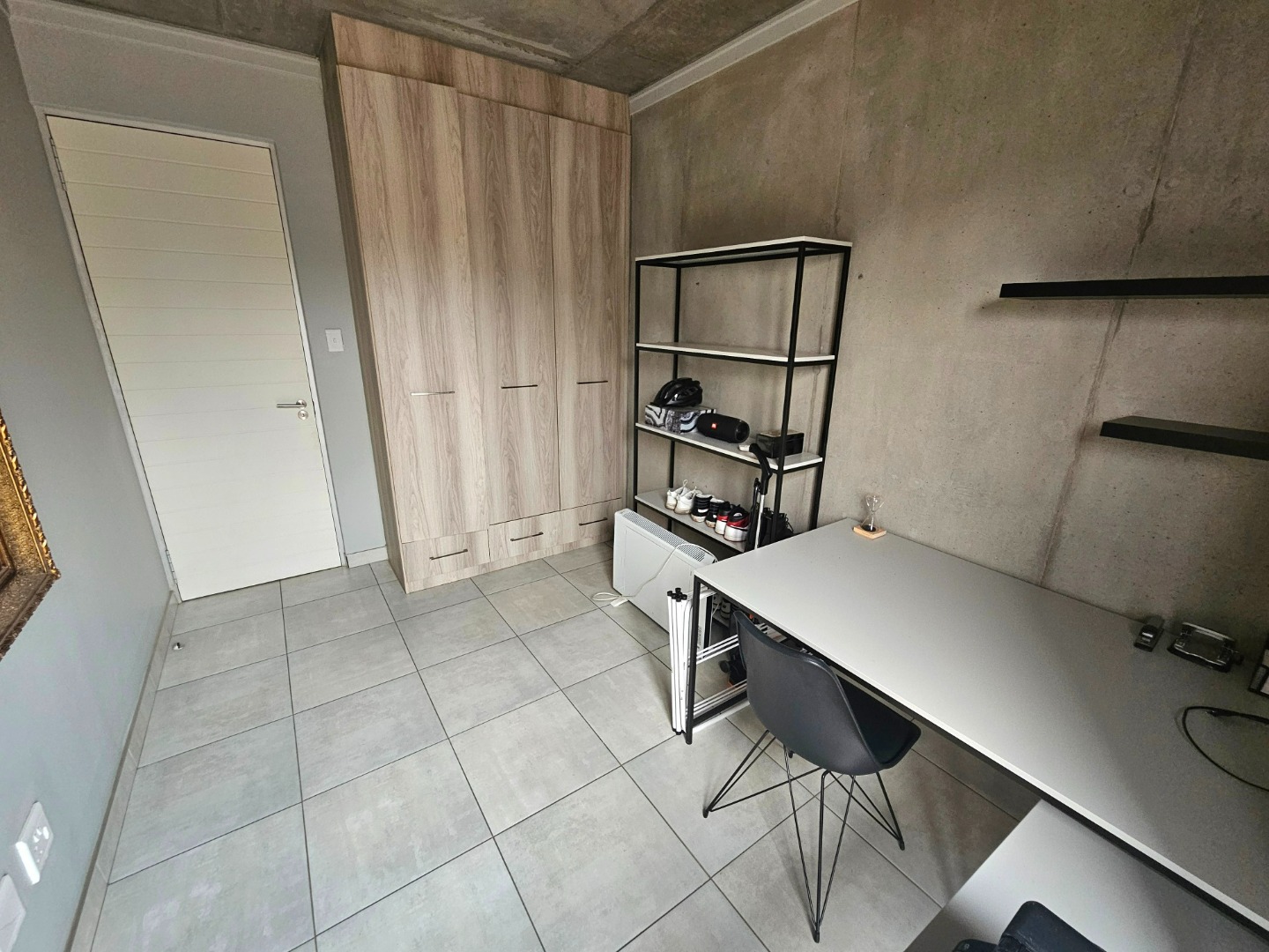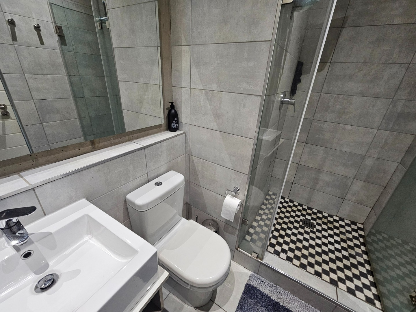 Both bedrooms are generously sized and offer the convenience of en-suite bathrooms, ensuring privacy and comfort. Each bedroom maintains the property's modern industrial aesthetic, complete with built-in wooden wardrobes for ample storage and large sliding doors that invite natural light. The bathrooms are equally impressive, showcasing a clean design with grey tiled walls, white fixtures, and unique black and white checkered shower floors within glass enclosures.