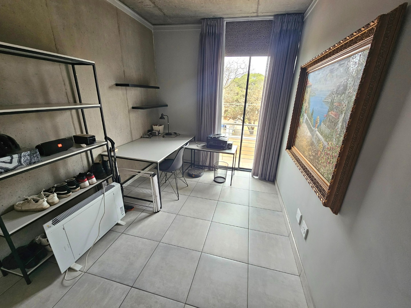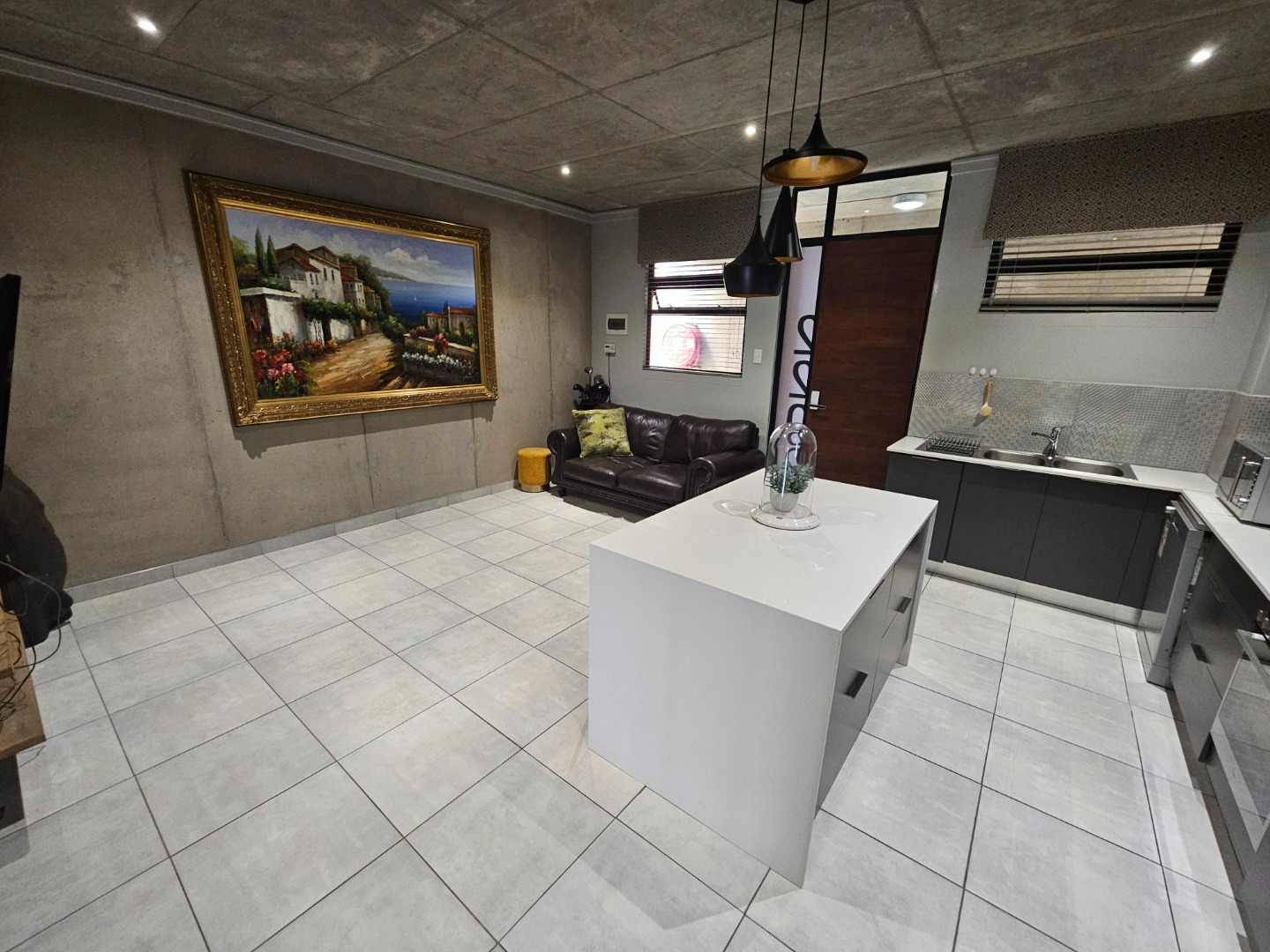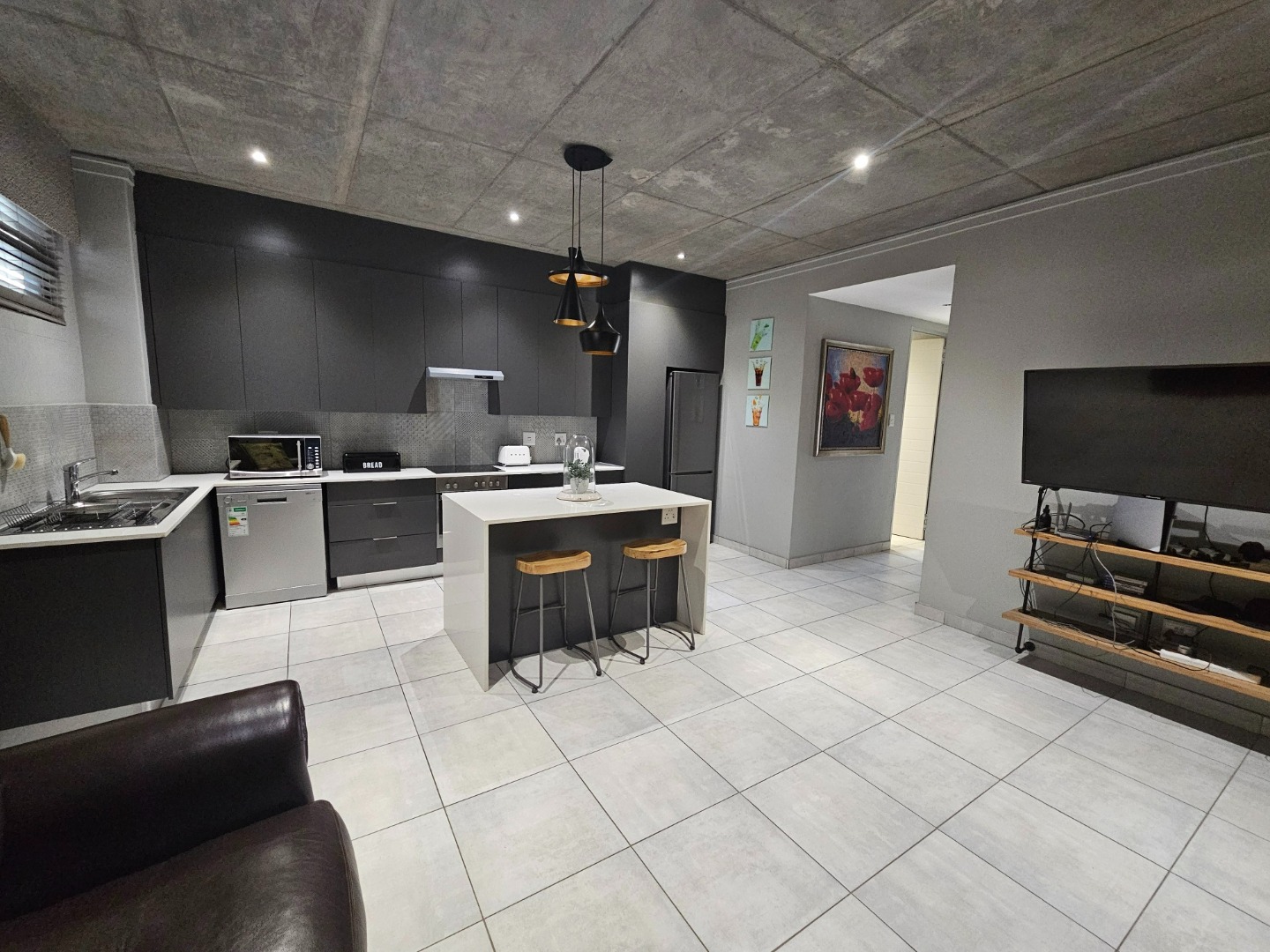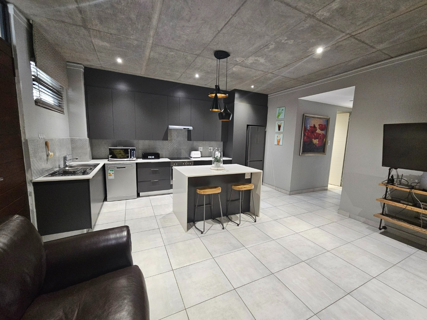Modern living in this stylish 2-bedroom, 2-bathroom apartment, this residence boasts a contemporary open-plan layout, seamlessly connecting the lounge and a sleek kitchen. The kitchen is a highlight, featuring a modern island, dark cabinetry, stainless steel appliances, and a convenient pantry, all complemented by clean tiled flooring and distinctive industrial-chic exposed concrete ceilings with modern lighting.
