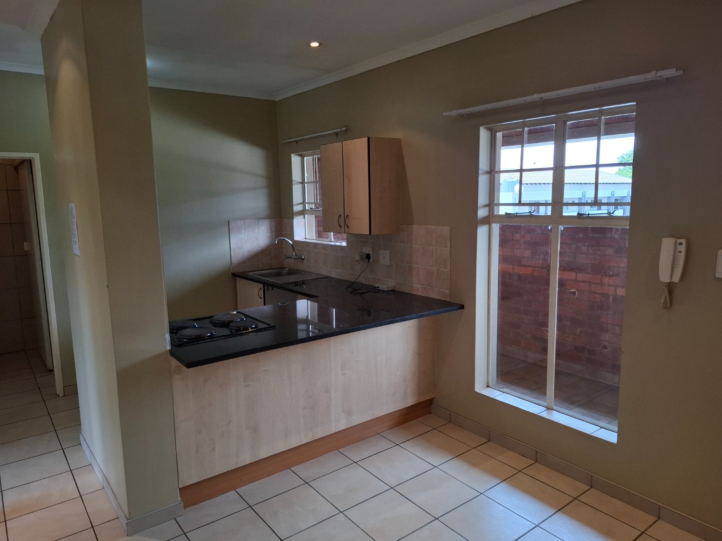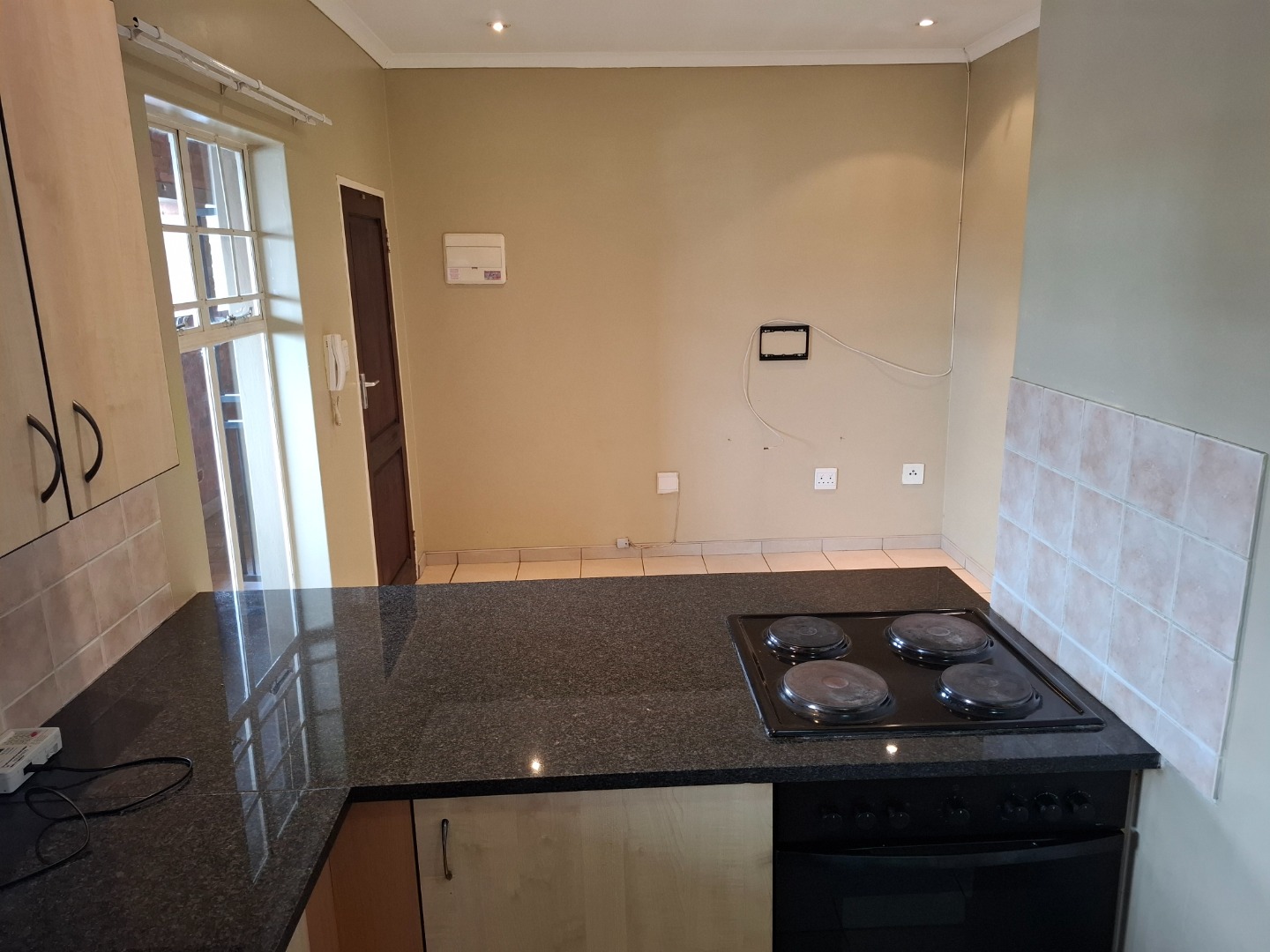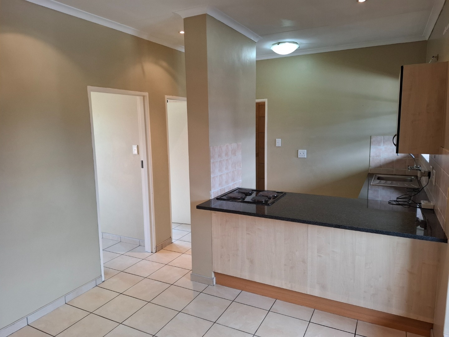 Both bedrooms have built-in cupboards. The bathroom has a fitted shower and toilet. The open plan kitchen has sufficient cupboard space and a washing machine connection point.