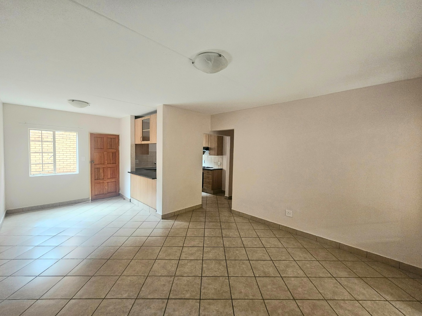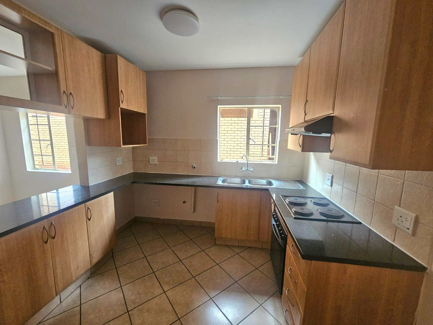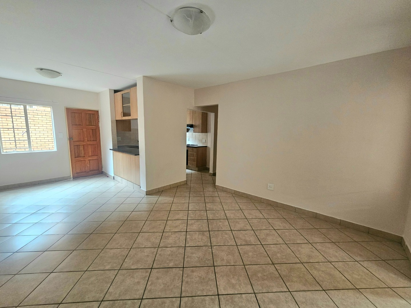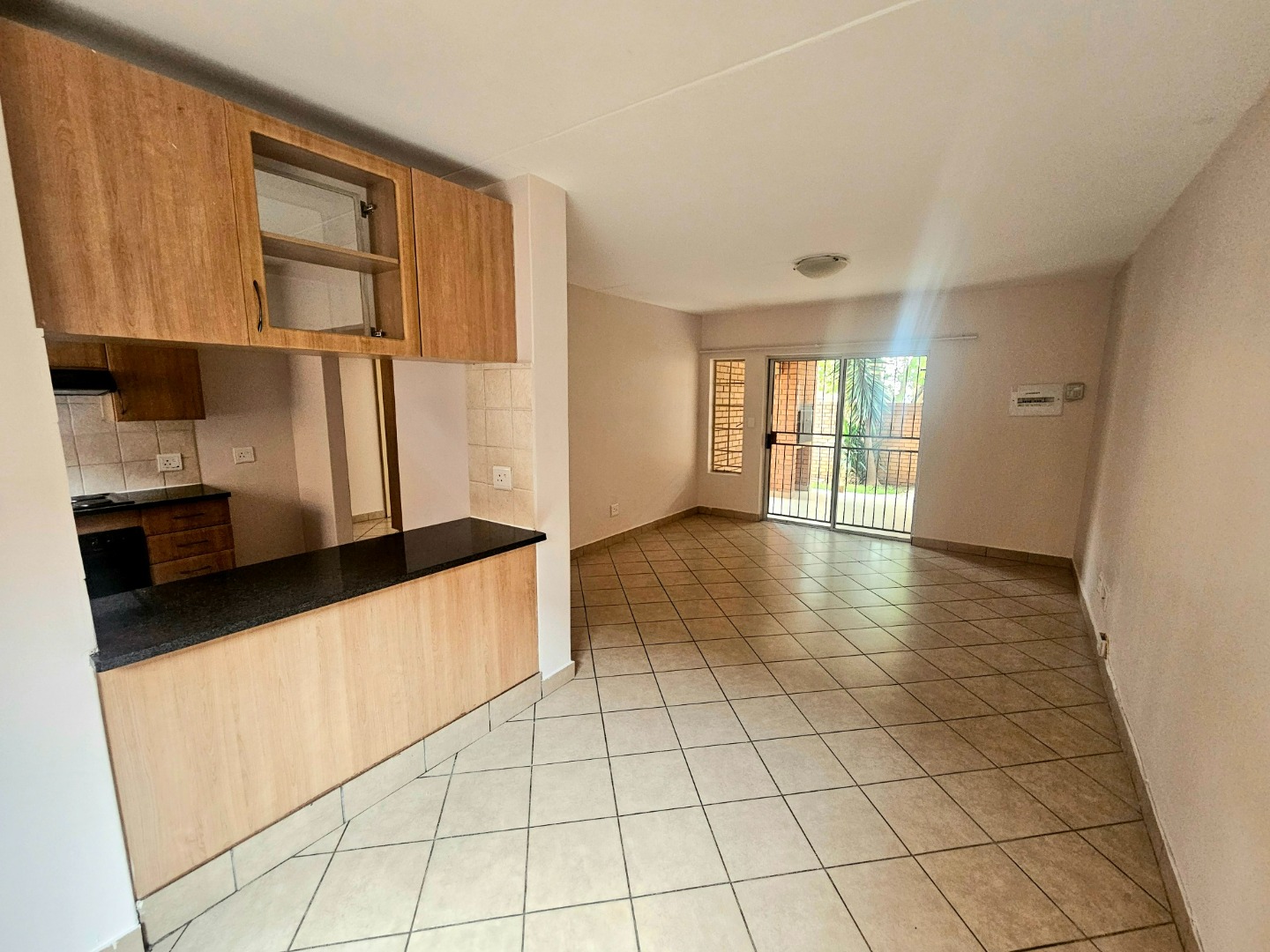 This inviting 3-bedroom, 2-bathroom rental property offers a comfortable and modern living experience within a secure complex in Hazeldean, Pretoria. Spanning 125 square meters, the residence features an open-plan layout seamlessly connecting the lounge, dining area, and a well-appointed kitchen. The kitchen boasts light wood cabinetry, dark granite-style countertops, a built-in stove, oven, extractor fan, and a convenient breakfast bar, complemented by tiled flooring throughout. A single garage provides secure parking, with additional paved parking available.