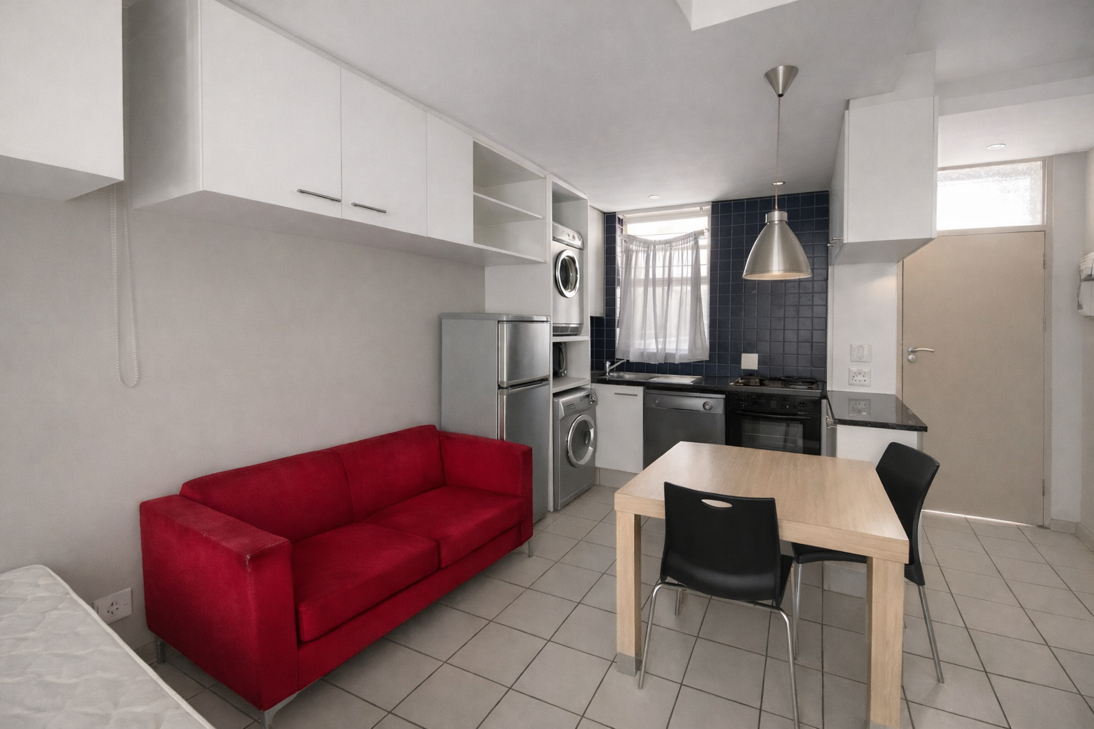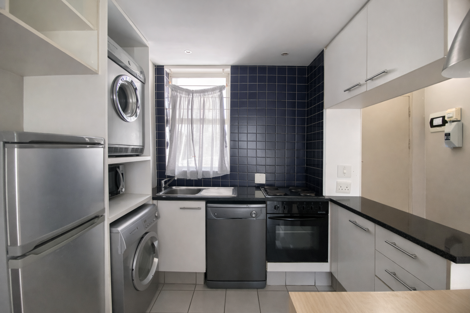 washer/dryer, finished with sleek cabinetry and dark countertops. Durable tiled flooring ensures easy maintenance, while