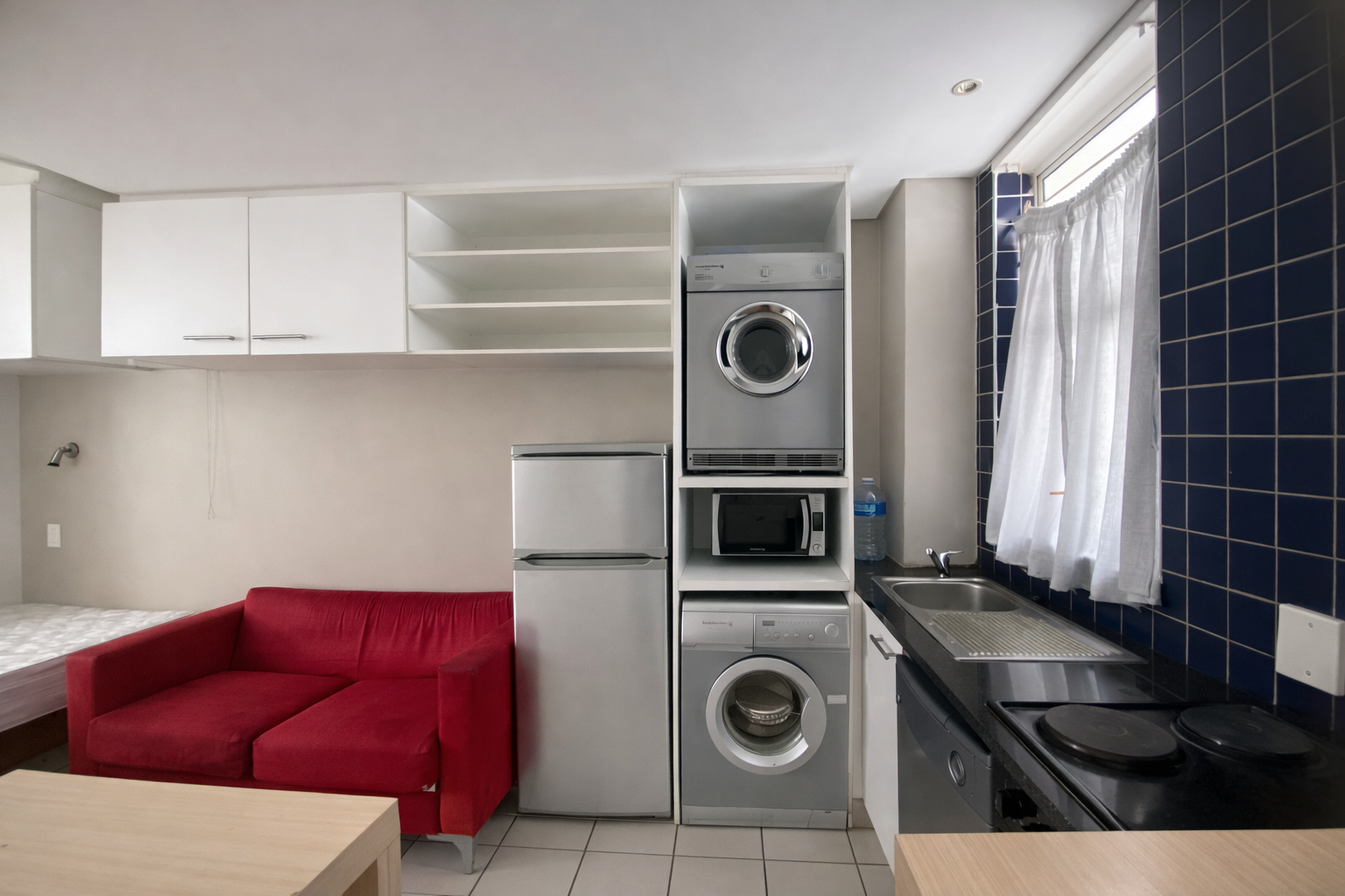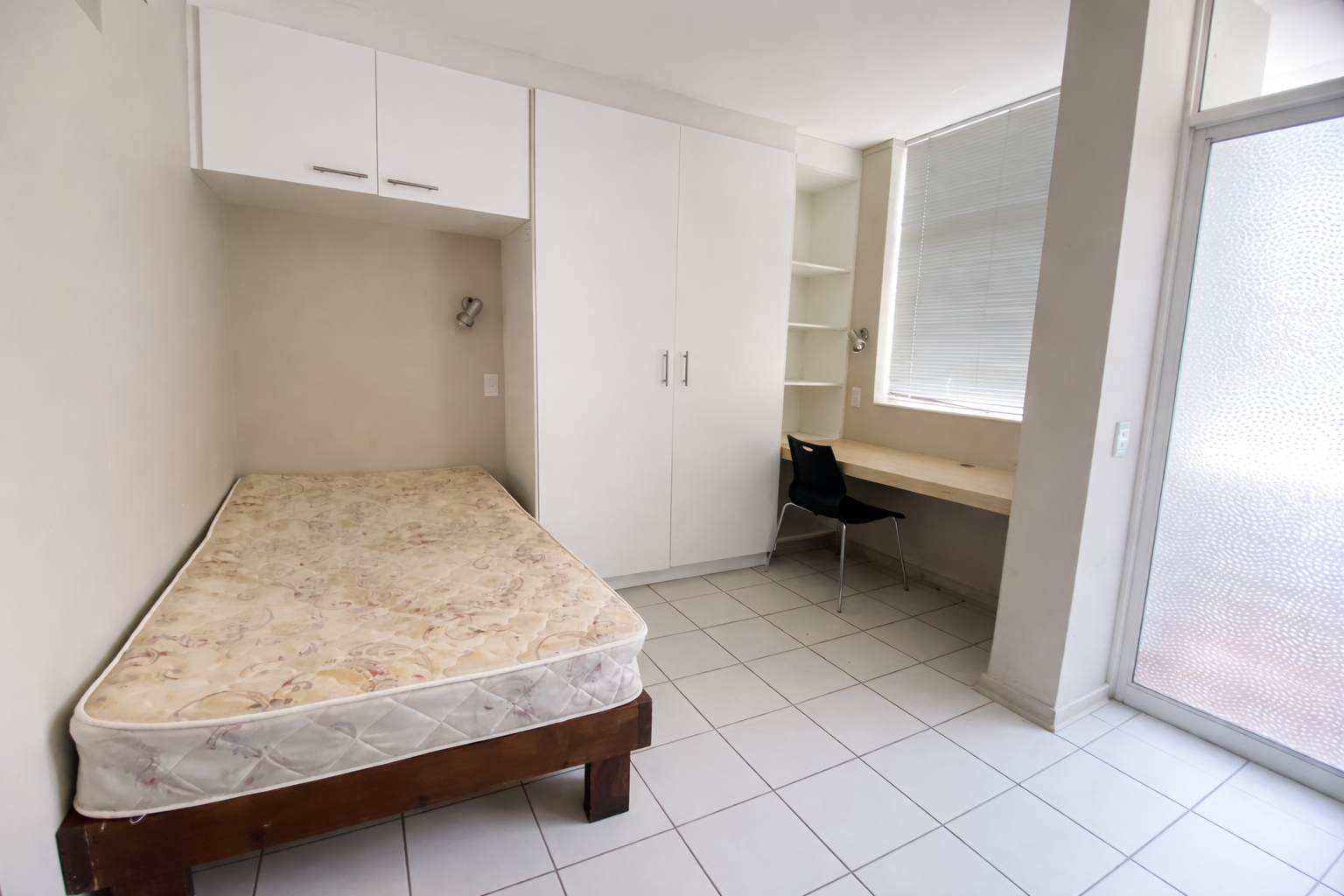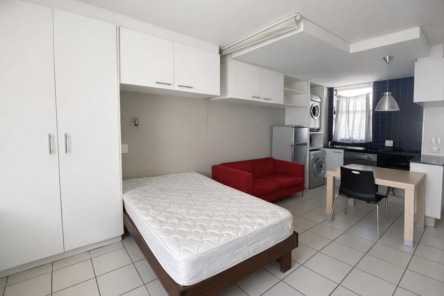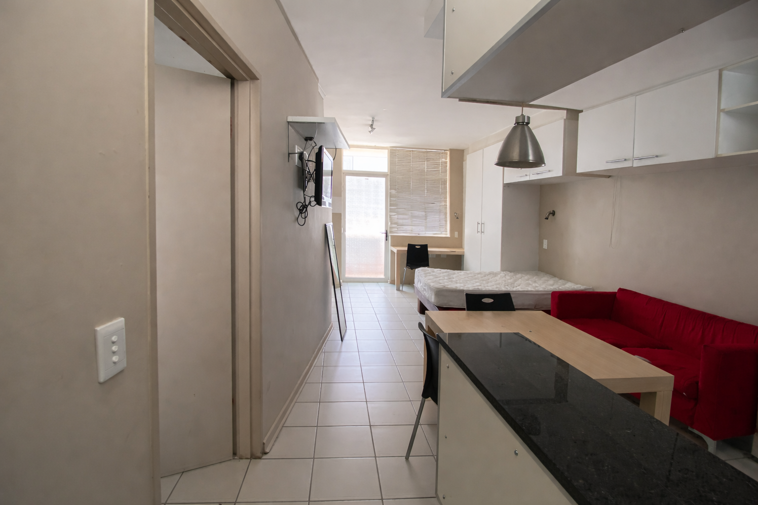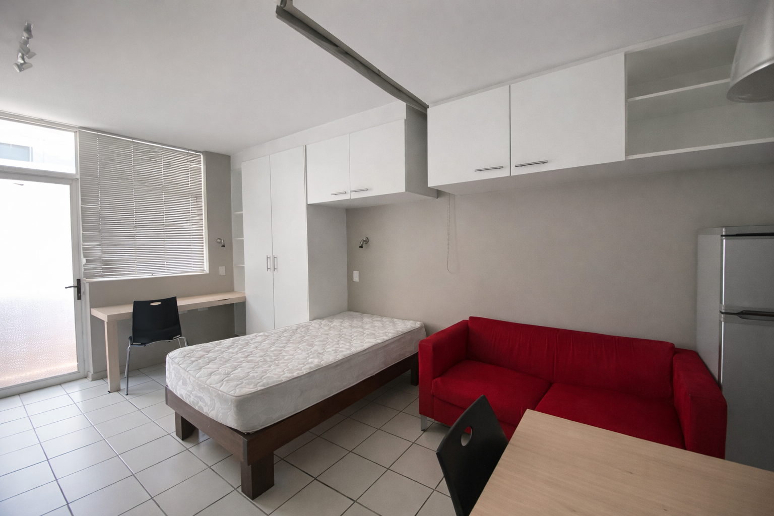 This fully furnished unit offers an open-plan living, sleeping, and study layout with built-in cupboards, overhead storage, and a